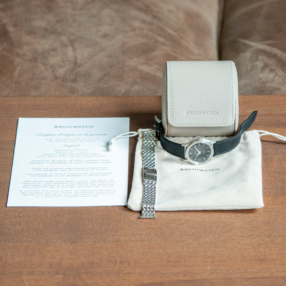 This watch is sold with its Archiwatch travel case and paperwork. The watch comes paired with a 20mm Molequin leather strap plus a brushed and polished 20mm Forstner “Beads of Rice” bracelet with a signed folding clasp. The watch is from Circa. 2023 and is in worn condition, but overall in very fair condition, as you can see from the photographs. The watch comes with its Manufacturer's Warranty.