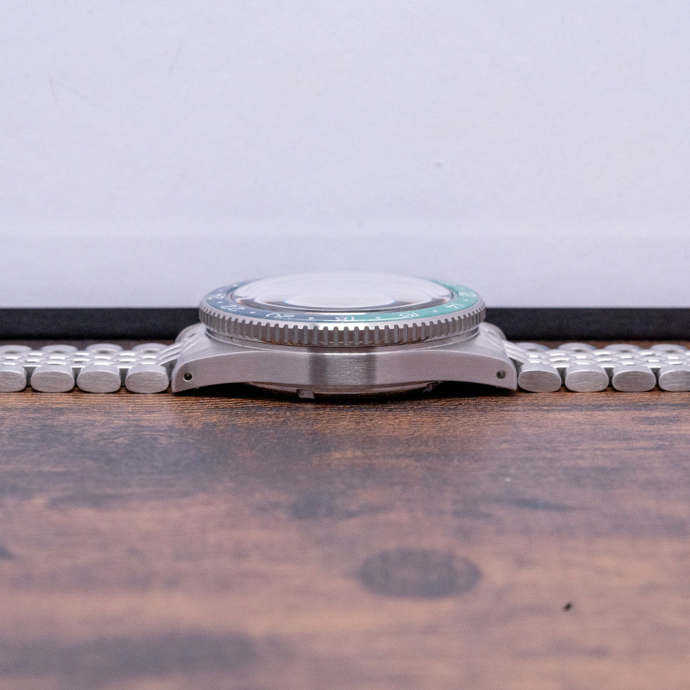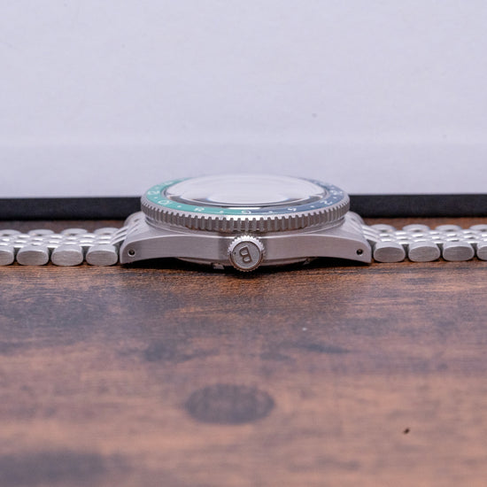 Here we have a 2023 Baltic Aquascaphe GMT Green Automatic Limited to 600 pieces, a polished and brushed 39mm 316L Stainless steel case that curves over your wrist with tapered drilled lugs, and a lug-to-lug length of 47mm and a case thickness of 13mm give the watch an impressive wrist presence. On the right side is a signed screw-down crown with the letter “B” engraved into it. The uni-directional stainless steel bezel has a sapphire-covered 24-hour scale in white Arabic numerals, which gives it the look of a vintage Bakelite bezel, the top half is blue, indicating the night hours, and the green lower half indicates the daytime hours. The double-domed sapphire crystal sits above a black dial, an outer minute track surrounds Arabic 12, followed by discs and arrow indexes that mark the hours coated in SuperLumiNova C1. At 6 o’clock, a colour-matched framed date window. Sword hands are complemented by a lollipop centre seconds hand, all coated in the same SuperLumiNova C1, and a green GMT hand has an arrow point filled with SuperLumiNova C1. Text is precisely printed on the dial with “Baltic” at 12 o’clock and “Aquascaphe” in green “GMT” at 6 o’clock completes this colourful traveller companion. On the reverse, a screw-down case back with the Capital cities surrounding a world map engraved on it, inside an automatic Soprod C125, 25 jewels, 28,800 beats per hour, it has GMT, hand-winding, and hacking functionality. Soprod is a division of the Festina group. The watch comes paired with its 20mm Baltic signed Beads of Rice stainless steel bracelet secured by a push button release folding deployant clasp, and it comes with its Baltic presentation box and papers.