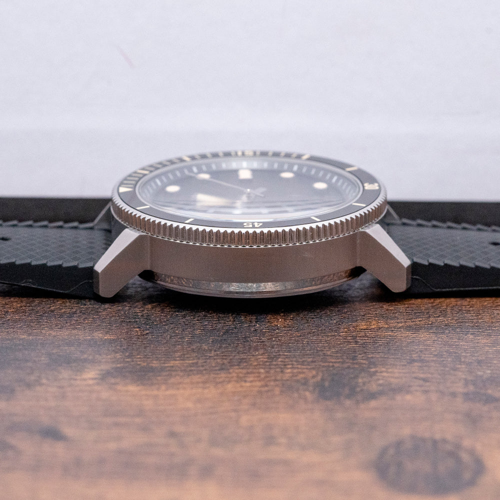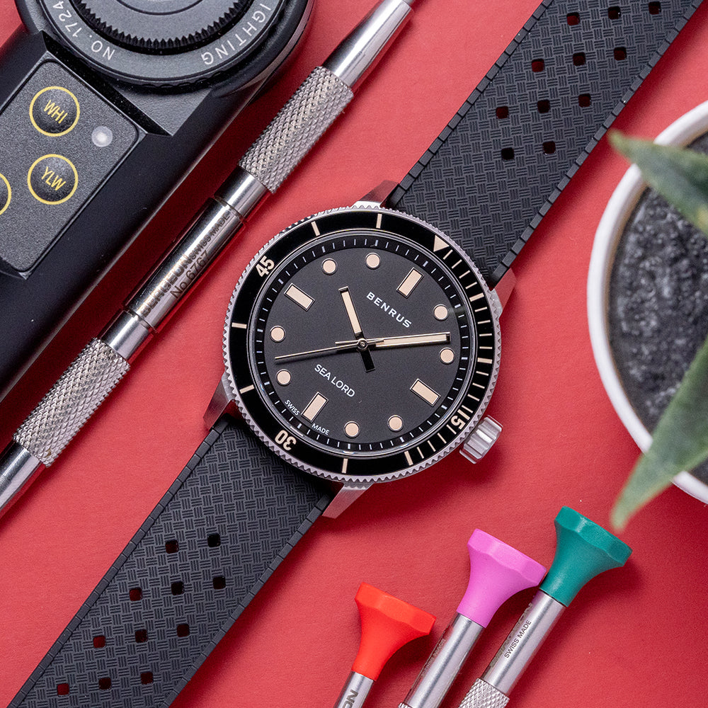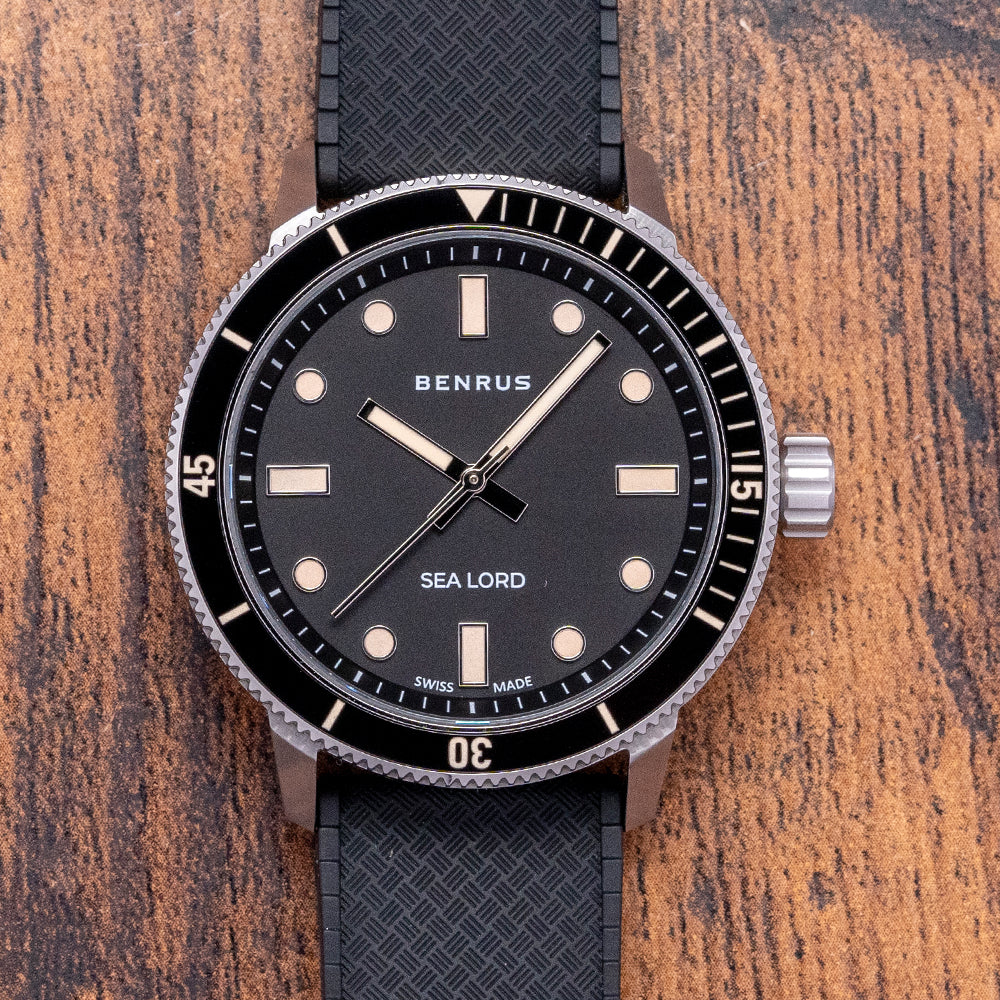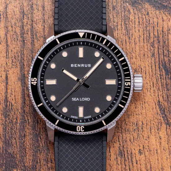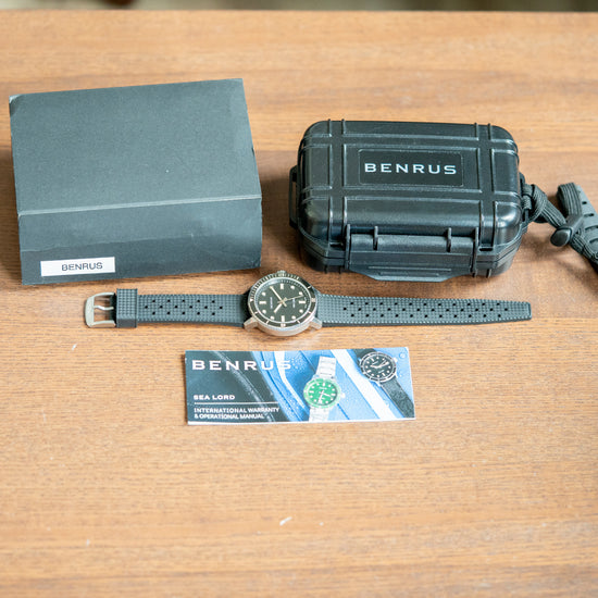 Here we have a 2023 Benrus Sea Lord Classic Diver Black Automatic, a modern reinterpretation of their classic diver with a contemporary 39mm brushed stainless steel case that sits on your wrist with angled straight-ended lugs and a lug-to-lug length of 45mm and a case thickness of 12mm give the watch an impressive wrist presence. On the right side is a signed screw-down crown with deep knurling for extra grip. The unidirectional stainless steel bezel has a coin edge for grip and a black ceramic 60-minute dive insert coated in a cream Super-LumiNova BW G9. A flat sapphire crystal sits above a matte black dial, an outer minute track surrounds the disc and baton indexes, slender baton hands are coated in the same cream Super-LumiNova BW G9 for that vintage aesthetic, at noon, we have the Benrus motif, and at 6 o’clock “Sea Lord'' complete this vintage-inspired dive watch. On the reverse, there is a screw-down case back with the details of the watch around its edge and the Benrus coats of arms in the centre, a nice nod to their original Sea Lord. Inside an automatic Soprod P024, 25 jewels, beating at 28,800 beats per hour, based on the ETA 2824-2, it has hand winding and hacking seconds for your convenience. The watch comes paired with its original quick-release 20mm Belrus Tropic rubber strap with a signed pin buckle, and this watch is sold with its original Belrus box and paperwork.