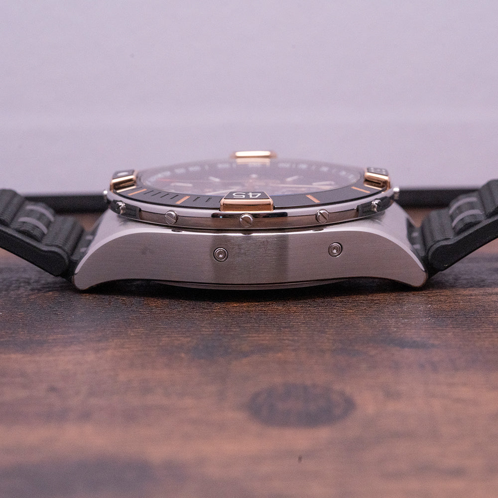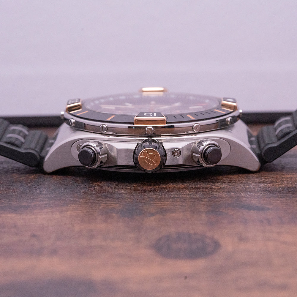 Breitling was established in 1884 by Leon Breitling in the Swiss Jura Mountains. In 1915 Gaston Breitling introduced a pusher at 2 o’clock to start, stop and reset the chronograph. Leon later moved the reset to a pusher at 4 o’clock. In 1939 Breitling shipped a huge quantity of chronographs to the Royal Air Force. During the war with Germany surrounding Switzerland Leon and some friends created a makeshift runway near their factory. Planes would use the car's headlights as a guide to land. Once on the ground, they were quickly loaded, taking off before the Germans knew what was going on. They introduced the “Navitimer” a navigation computer in 1952 used to calculate a flight plan. In 1969 they collaborated with Heuer, Burne, and Dubois-Depraz on a top-secret project called Project 99. Together they developed one of the first self-winding chronograph movements. Breitling stands for high precision, outstanding performance, and functionality. During the early days of space exploration, Lt. Commander Scott Carpenter went around the earth three times whilst wearing a modified Navitimer. In 2017 they were sold to CVC Capital Partners, Europe's largest private equity firm.
