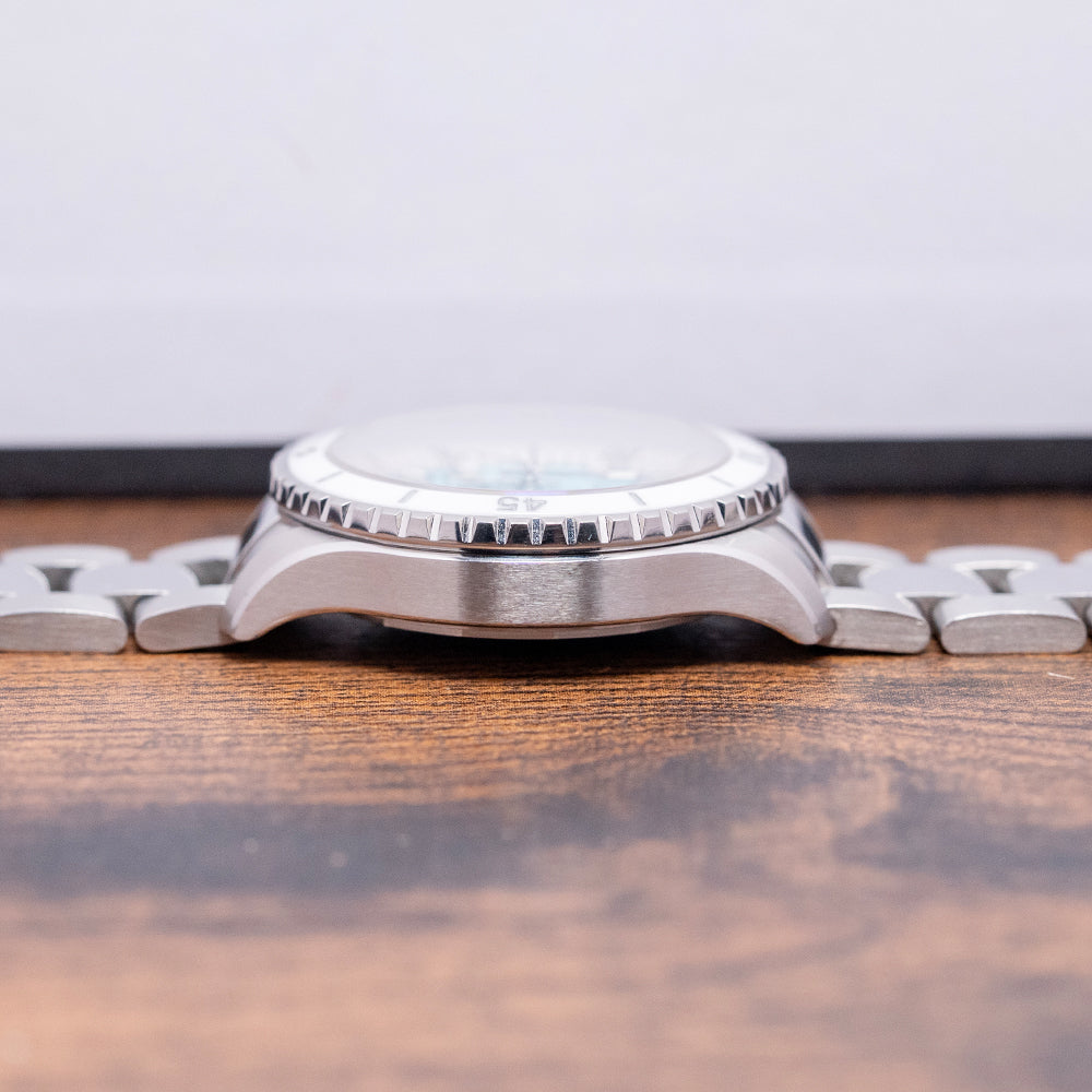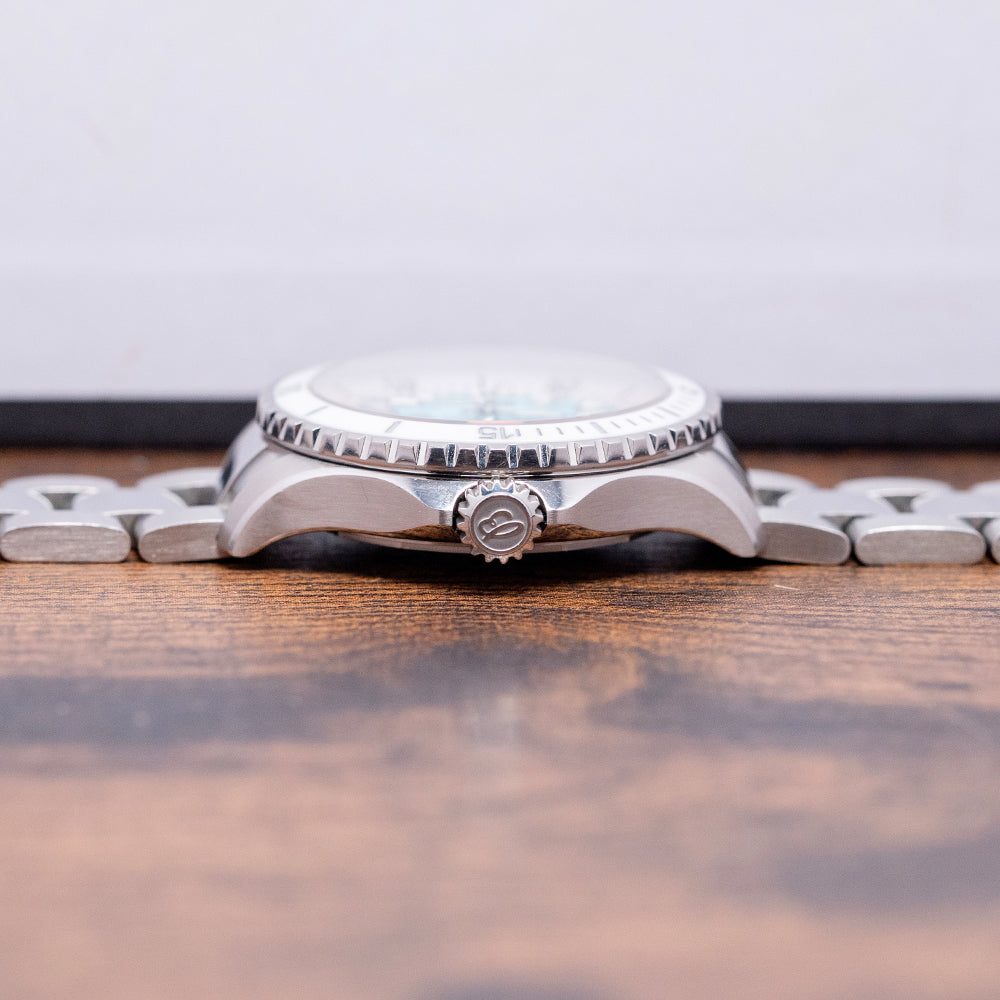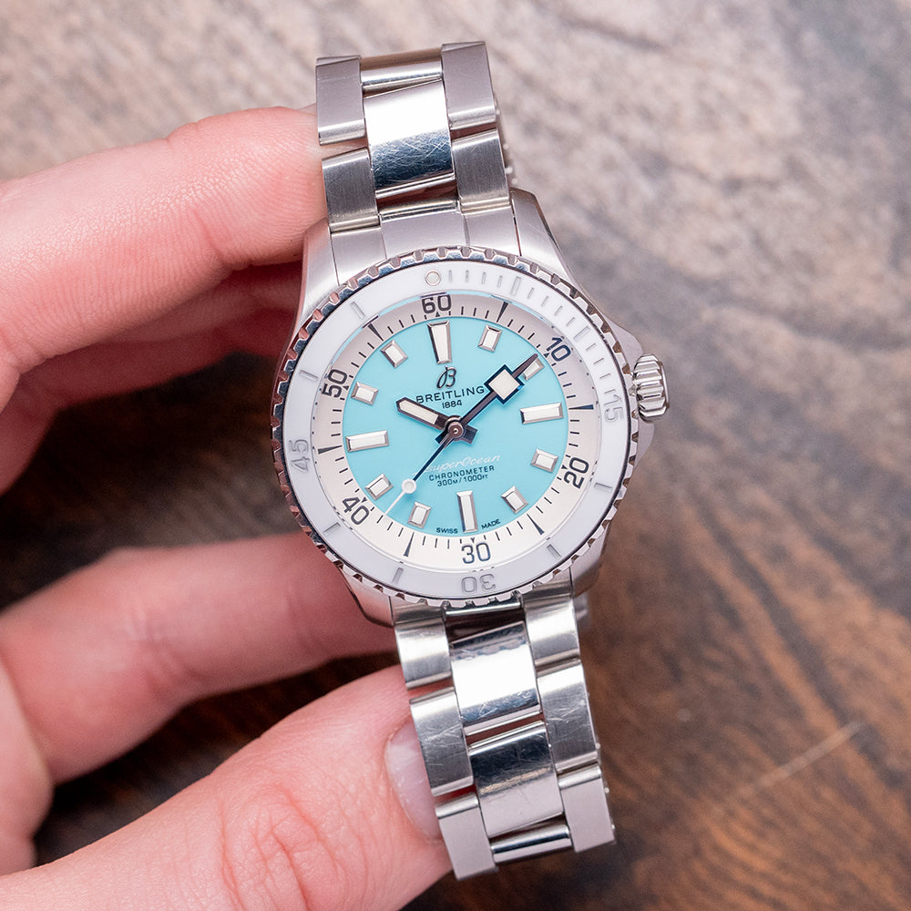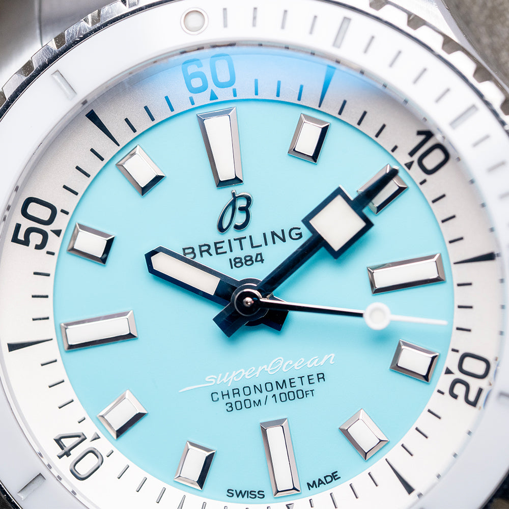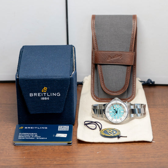 Here we have a 2023 Breitling Superocean Automatic 36mm Turquoise A17377211C1A1, with its curvaceous 36mm brushed and polished stainless steel case that comfortably curves over your wrist thanks to the thick, tapered, flat-ended lugs. The polished portions of the case transition with crisp lines, leading to a lug-to-lug length of 42.5mm and a case thickness of 12mm, giving the watch an impressive wrist presence. On the right side is a signed twin-gasket screw-down crown with deep knurling for grip, and the embossed “B” is protected by crown guards. The unidirectional bezel features a half-minute ratchet setting, a deep knurled edge with a ceramic inlay, a deep engraved 60-minute dive scale, and a slightly cambered AR-coated sapphire crystal on both sides above a matte Turquoise dial. A broad, white, sloping outer 60-minute chapter ring surrounds applied steel indexes filled with Super-LumiNova, marking the hours. Thick steel hands are filled with Super-LumiNova and complemented by a lollipop-tapered second hand. At noon, we have the applied steel polished “B” Breitling motif, and at 6 o’clock, ‘Superocean Chronometer 300m/1000ft' completes this colourful sports dive watch. On the reverse, a screw-down solid case back engraved with the details of the watch around its edge, inside an automatic Breitling Cal. 17, 25 jewels, beating at 28,800 beats per hour. This Chronometer Certified (COSC) movement is based on the ETA 2824-2, which has been modified to Breitling standards. It comes paired with its Breitling 18mm brushed and polished 3-link stainless steel bracelet, secured by a signed push-button deployant clasp, and includes its original Breitling box, travel pouch, swing tag and Breitling paperwork.