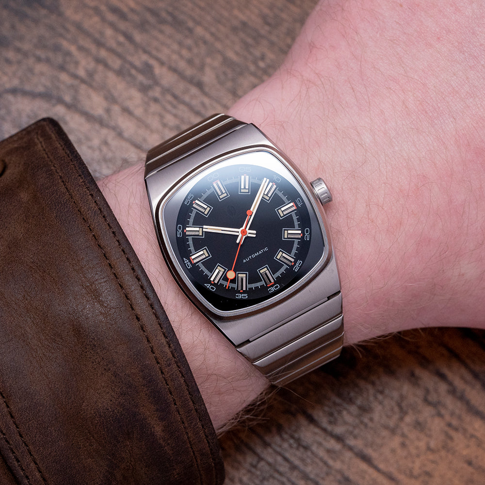 If you know me, you will know that I love 70s design in watches and Brew has taken those design elements and brought them into the modern world of watches beautifully. This is perfectly represented here with this Brew Metric Automatic, limited to just 500 pieces total. The bracelet on this is a real highlight for me having owned multiple Zeniths and Movados with this exact same bracelet and design, it works beautifully with the case shape and adds to the overall 70s funk!