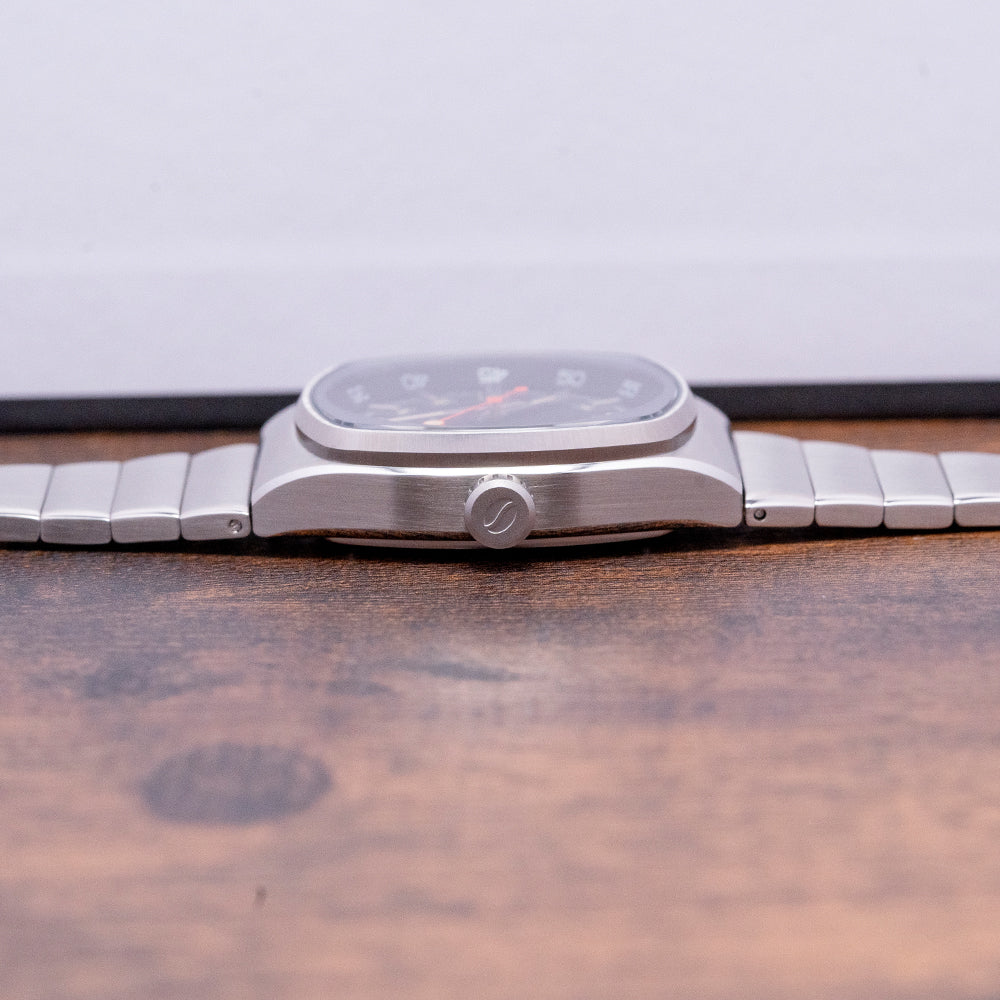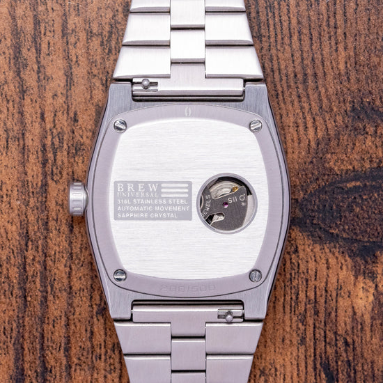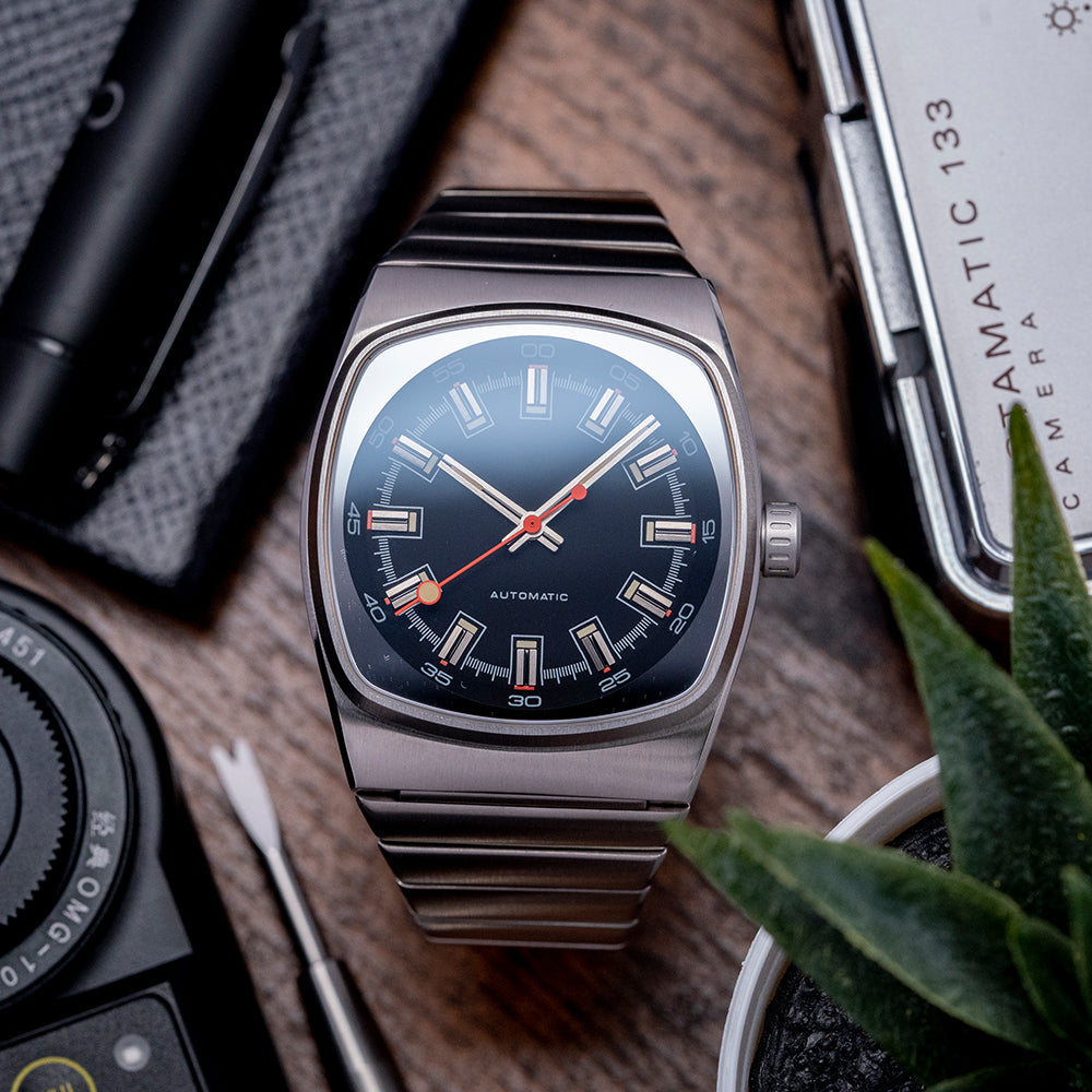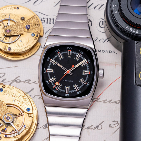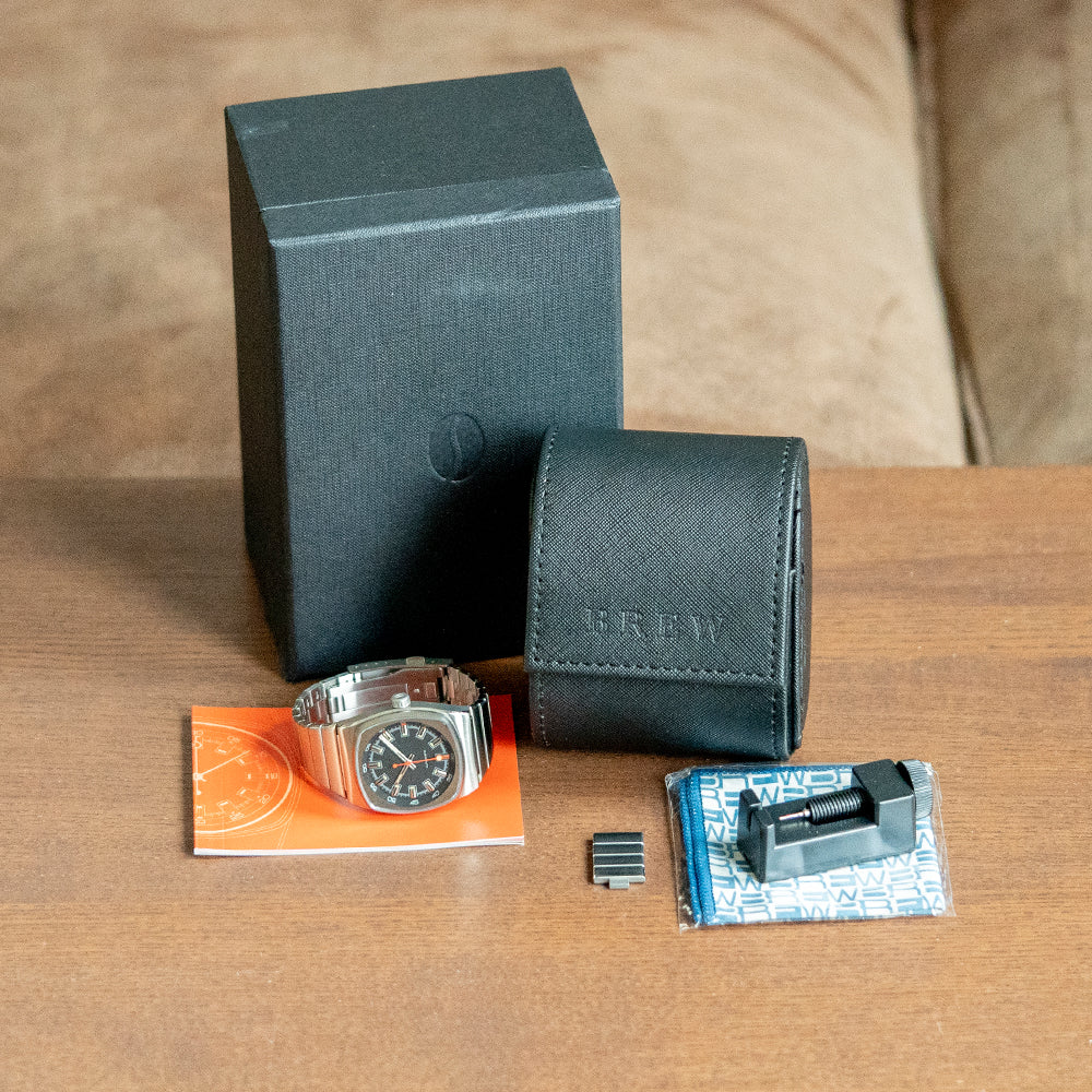 Here we have 2023 Brew Metric Automatic Limited to 500 with a 36mm square cushion case, polished and brushed surfaces transition with crisp edges, the case flows over your wrist towards the integrated bracelet, the soft rounded edges remind us of the watches of the 1970s, and a lug-to-lug length of 42mm and a case thickness of 11.5mm ensures a comfortable fit on your wrist. On the right side, we have the signed crown. The bevel-edged stepped smooth bezel holds a flat sapphire crystal above a black 70s-inspired dial, and a sloping outer chapter ring has the printed 60-minute scale surrounding a precisely executed minute track with faceted double baton indexes, lume on the inner edge and orange accents on their outer edge marking the hours. The long baton hands are filled with lume complemented by an orange lollipop sweeping second hand. The “time only” aspect of the watch is a refreshing departure for Brew and yet it still retains its signature design. At noon we have a debossed Brew logo, at 6 o’clock “Automatic”. On the reverse, a screwed-down case back with an open heart that captures the beat of the movement and the details of the watch including its number out of 500, inside an automatic Seiko Cal. NH35A, 24 jewels, beating at 21,600 beats per hour, this workhorse movement has hand winding and hacking seconds for your convenience. The watch comes paired with its quick-release Brew 19mm integrated stainless steel bracelet with brushed and polished edges and a signed push-button release folding clasp, and the watch comes with its Brew presentation box, travel case and papers.