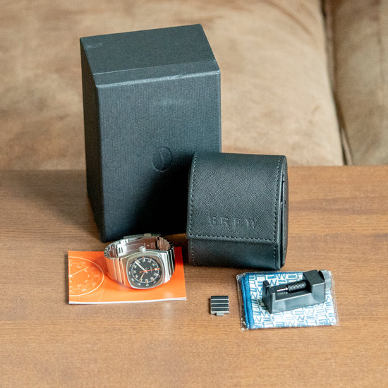 This watch is sold with its original Brew Box, travel case and Paperwork. The watch comes paired with its quick-release 19mm stainless steel bracelet and signed push-button release folding clasp, all links are provided. The watch is from Circa. 2023 and is sold in worn condition, but overall, it is in very good condition as you can see. The watch comes with its Manufacturer's Warranty.