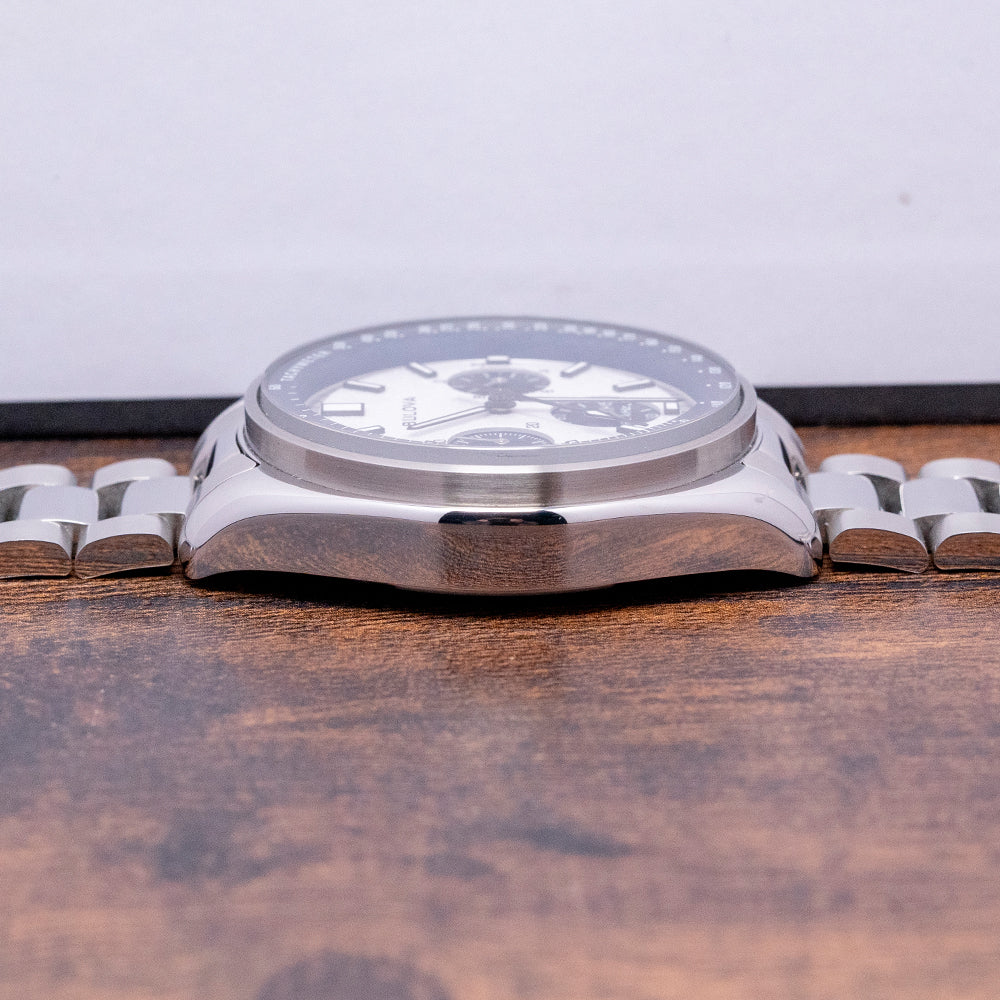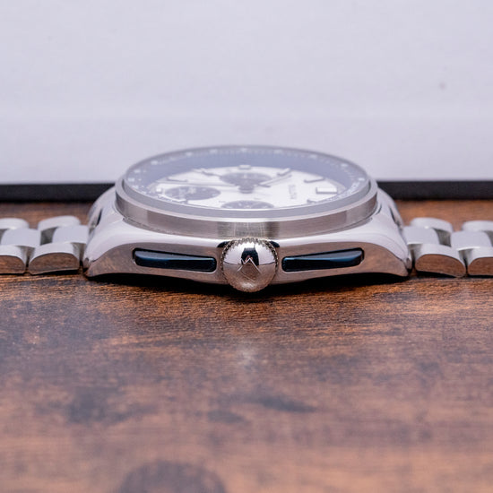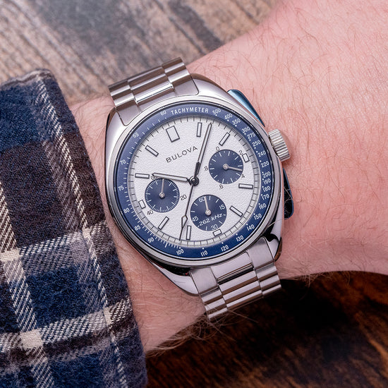 It was on August 2nd 1971, when Bulova would be walking on the Moon. But you say I thought Omega Speedmaster was the only NASA Approved Watch' and you'd be right. Still, under NASA’s own rules and regulations, Bulova made many of the timing instruments. The 46 missions and Lunar landings all used them. Therefore, Bulova presented Commander Scott of Apollo 15 with a Bulova prototype that met all the NASA requirements and passed the g force tests. But was overshadowed by the Omega as the first choice of Time device, without telling anyone he brought it on board with him. “Huston, we have a problem.” As luck would have it, his Speedy crystal popped out, so he slipped on his Bulova, and he became the first man to use an unauthorised watch while driving the Moon Buggy on the lunar surface. He made history on this day. Commander Scott decided in 2015 that he would put up for auction his beloved prototype, which reached an incredible record-breaking $1.3 million. In response to this, Bulova chose to make a special edition of the Lunar Pilot Chronograph. The Specifications were in keeping with the original case design alongside the dial and chronograph pushers but with a modern movement. Here we have a curvaceous 2023 Bulova Archive Lunar Pilot Chronograph Blue 98K112 with its distinctive polished 43.5mm Stainless Steel case; down the right side, we have the blue chronograph pushers and a signed crown in the centre. The polished bezel holds the flat, thick, Anti-Reflective Sapphire crystal. A blue Tachymeter chapter ring sits above the textured white dial. Bulova has created a multidimensional dial, keeping the indices simple and the minute track easy to read with the large sweeping chronograph seconds hand. The blue sub-dials at 9 o’clock read the minutes up to 60 mins total, the 3 o’clock spins 10th of a second to save battery, this stops after 30 seconds, but when you press the top pusher, it will read the seconds as if it has been spinning all the time and finishing the compliment off at 6 o’clock the 60 seconds hand ticks at two ticks per second. To reset the chronograph, you press the bottom pusher, and the hands sweep back into position. The pushers have a tactile click, which is very satisfying. Deciding not to use the manual wind Universal Genève movement of the original but to use their highly accurate UHF 262 kHz quartz movement, which gives the chronograph hand its distinctive sweep at eight ticks per second, while the 60-sec sub-dial ticks at two ticks per second. Unlike the standard quartz movement, it operates at 32748 kHz with an accuracy of a few seconds a month. It comes paired with its 20mm polished and brushed stainless steel bracelet with a signed concealed clasp; all links are provided, plus an additional 20mm blue Bulova-signed leather strap and comes with its Bulova presentation box and paperwork.
