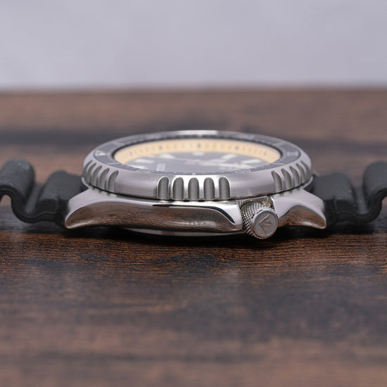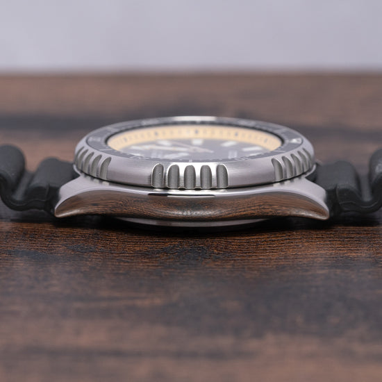 Here we have a 2023 Citizen Promaster Automatic Fugu NY0130-08E with a 44mm brushed stainless steel case that curves over your wrist with thick tapered lugs, a lug-to-lug length of 49mm and a case thickness of 12.5mm giving the watch an impressive wrist presence. The watch design is inspired by the Fugu puffer fish, a Japanese delicacy which has to have a highly toxic organ removed by the chef or else you face an agonising death. Down the left-hand side at 8 o’clock a robust screw-down Promaster signed crown with deep knurling for extra grip, the Promaster symbol signifying the ISO6425 Certification. The unidirectional dive bezel has deep knurling in sections for extra grip, a black insert 60-minute scale in silver numerals making it easy to read, and the flat sapphire crystal AR coated sits above a matte black textured dial highlighting the intricate patterns that the Fufu puffer fish makes in the sand as part of its mating ritual. A yellow minute chapter ring surrounds trapezoidal-shaped indexes coated in luminance marking the hours, at 3 o’clock a day/date window, broad arrow hands are coated in the same luminescence complemented by a yellow arrow point tapered second-hand, at 12 o’clock we have the Citizen motif and at 6 o’clock “Automatic Divers 200m”. On the reverse, a screw-down case back with an engraved Fugu puffer fish inflated in the centre, inside an automatic Miyota Cal. 8204, 21 jewels, beating at 21,600 beats per hour, this workhorse movement first introduced in 1977 has hand winding and hacking seconds for your convenience. The watch comes fitted on its 20mm Citizen black polyurethane strap with a steel pin buckle and the watch comes with its Citizen presentation box and paperwork.