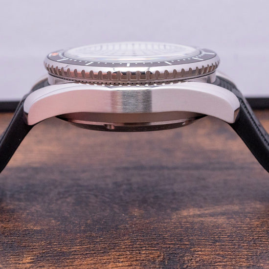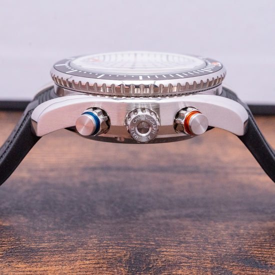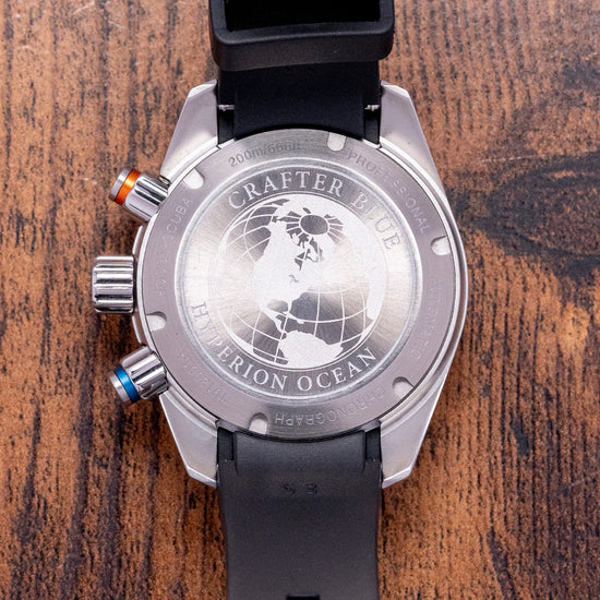 Here we have a 2023 Crafter Blue Hyperion Ocean Chronograph, Arctic Blue, created to bring awareness of the disappearing sea ice around the Arctic at a rate of 10% every decade. A 42mm brushed and polished stainless steel case that curves over your wrist thanks to the twisted tapered lugs, and a lug-to-lug length of 51mm and a case thickness of 17mm give the watch an impressive wrist presence. Down the right side, we have orange and blue-collared screw-down pushers, and in the centre, a screw-down signed crown with deep knurling for grip. A unidirectional bezel has deep knurling for grip and a black ceramic dive insert with white markings. The domed sapphire crystal sits above a striking Artic blue sunburst dial, and an outer minute chapter ring surrounds the applied white disc and orange baton indexes marking the hours; at 3 o’clock, a small seconds counter with an orange hand; at 6 o’clock, a date window; and finally, at 9 o’clock, a Regatta 30-minute counter segmented in orange, blue and grey indicating the passing time. Steel skeletonised hands are tipped with Super-LumiNova complemented by a tapered orange chronograph hand. At noon, we have the Crafter Blue motif “Automatic” and “200m/666ft” in orange; at 6 o’clock, the Hyperion Ocean Chronograph completes this dynamic sports dive watch. On the reverse a screw-down case back engraved with the details of the watch around its edge and the representation of the Northern Hemisphere in the centre, inside an automatic Seiko Cal. NE86, 34 jewels, beating at 28,800 beats per hour, a vertical clutch column wheel movement with hand winding, quick-set date and hacking seconds for your convenience. The watch comes paired with its fitted 20mm Crafter Blue black rubber strap plus a wrapped and unworn 20mm brushed stainless steel 3-link bracelet secured by a flip-lock push button release folding clasp; all links are provided and comes with its Crafter Blue Pelican case and paperwork.
