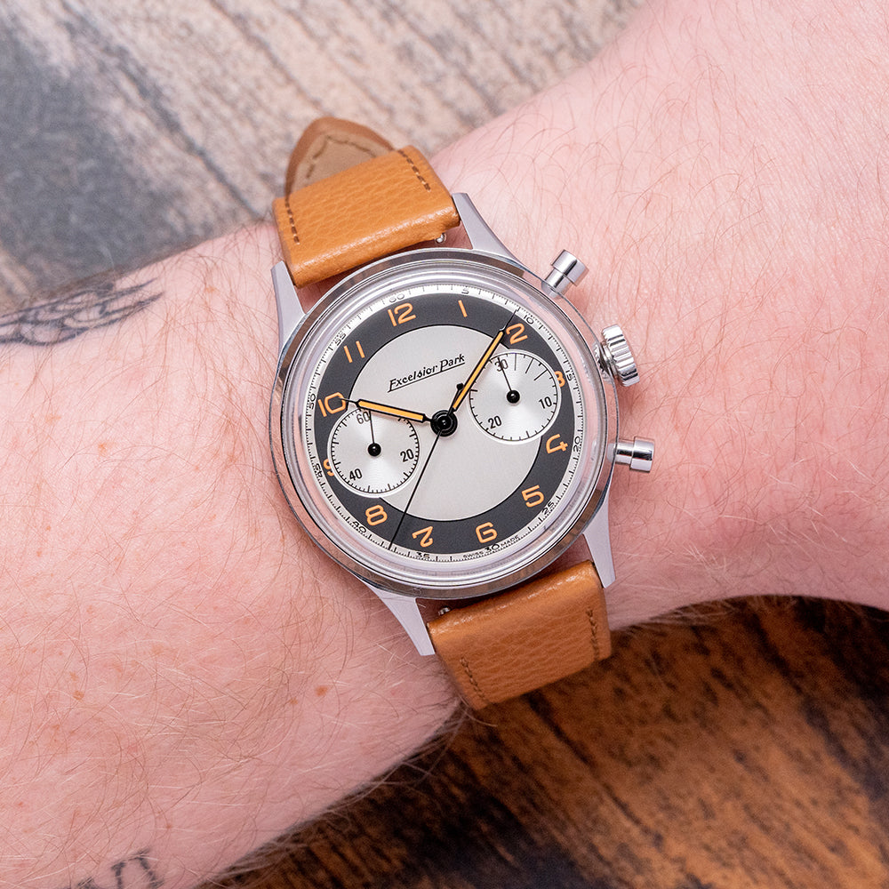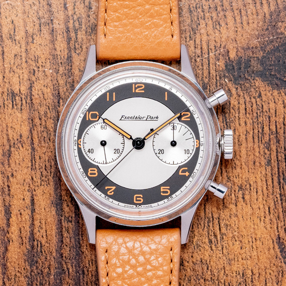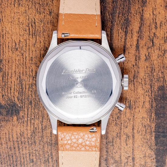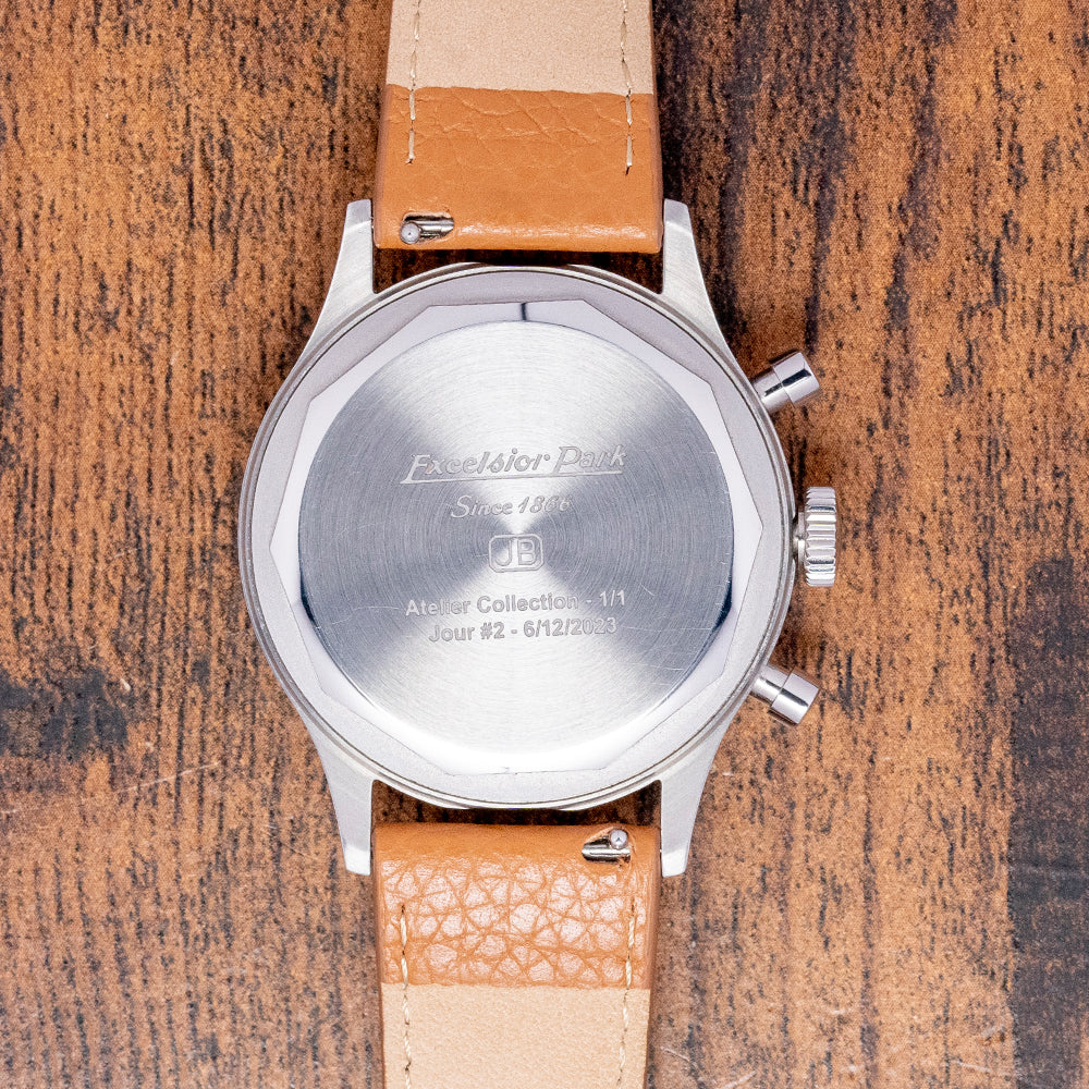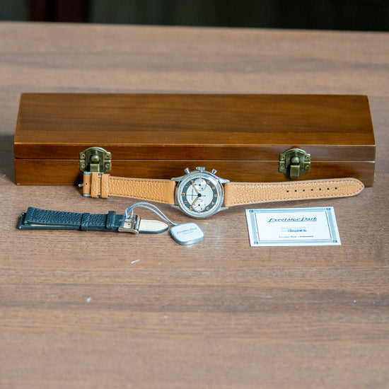 Here, we have a classic 1950s-infused 2023 Excelsior Park Atelier & JB Collection Day 2 Piece Unique 1 of 1. The curvaceous 39mm brushed 316L stainless steel case gently curves over your wrist with finely tapered drilled lugs, and a 47mm lug-to-lug length and a case thickness of 13mm ensure a comfortable fit. We have polished piston chronograph pushers down the right side and a large coin-edged crown in the centre. The polished smooth bezel holds a high domed sapphire crystal AR coated above a striking sector-style dial. An outer minute track is precisely executed, surrounding a black ring with orange numerals marking the hours; at 3 o’clock, a 30-minute register and at 9 o’clock, a small seconds register; each silver register has a concentric circular pattern, black markings and a black hand, elegant black outlined syringe style hands are filled with lume and complimented a fine chronograph hand, at 12 o’clock Excelsior Park motif completing this vintage-inspired bi-compax sports chronograph. On the reverse, a solid screw-down case back engraved with the details of the watch, inside a manually wound Sellita SW 510 M, 23 jewels, beating at 28,800 beats per hour, this cam-style chronograph has hacking seconds and quick-set date for your convenience. It comes paired with two Excelsior Park 20mm leather straps and a signed pin buckle. The watch is sold with its Excelsior Park presentation box and paperwork.