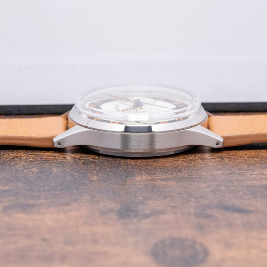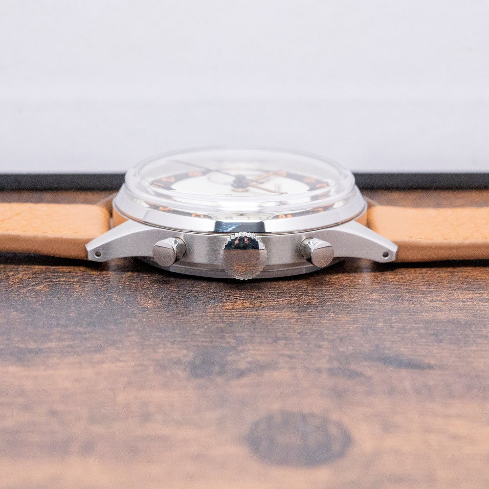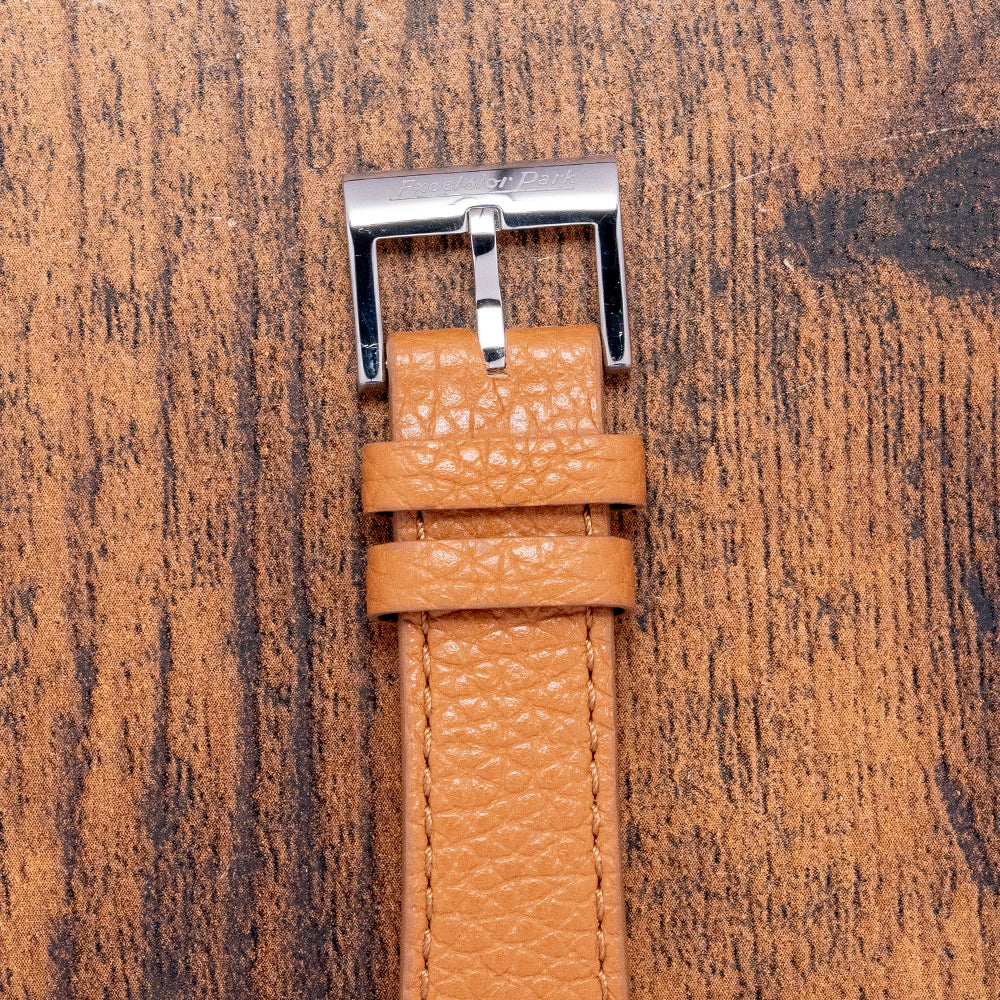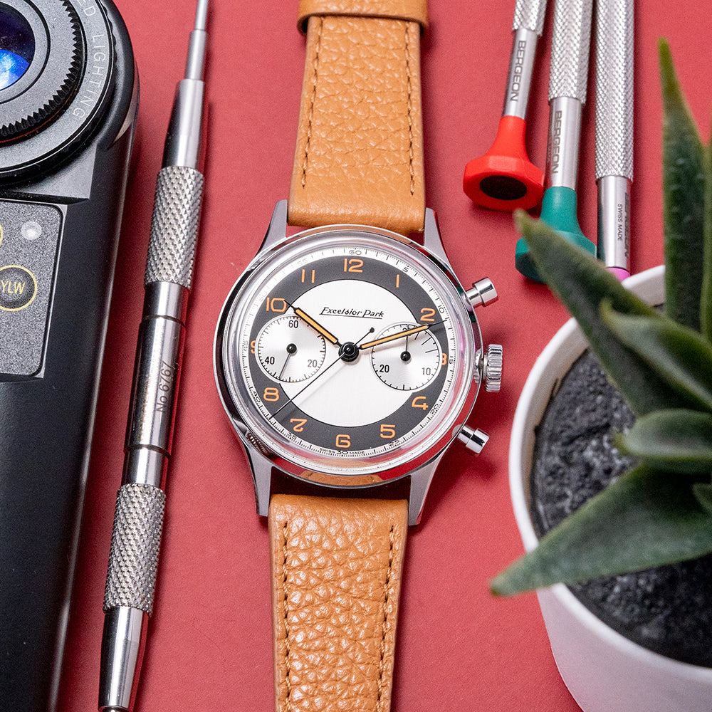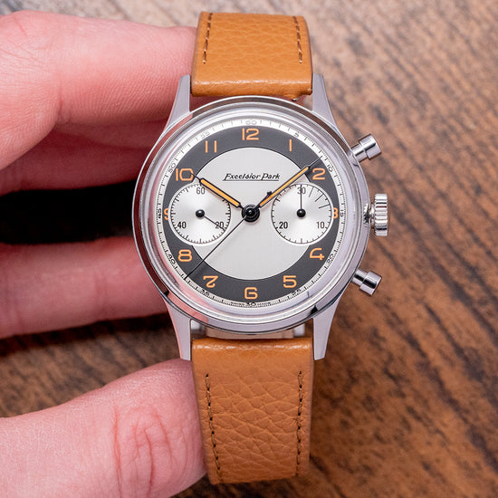 Here, we have a classic 1950s-infused 2023 Excelsior Park Atelier & JB Collection Day 2 Piece Unique 1 of 1. The curvaceous 39mm brushed 316L stainless steel case gently curves over your wrist with finely tapered drilled lugs, and a 47mm lug-to-lug length and a case thickness of 13mm ensure a comfortable fit. We have polished piston chronograph pushers down the right side and a large coin-edged crown in the centre. The polished smooth bezel holds a high domed sapphire crystal AR coated above a striking sector-style dial. An outer minute track is precisely executed, surrounding a black ring with orange numerals marking the hours; at 3 o’clock, a 30-minute register and at 9 o’clock, a small seconds register; each silver register has a concentric circular pattern, black markings and a black hand, elegant black outlined syringe style hands are filled with lume and complimented a fine chronograph hand, at 12 o’clock Excelsior Park motif completing this vintage-inspired bi-compax sports chronograph. On the reverse, a solid screw-down case back engraved with the details of the watch, inside a manually wound Sellita SW 510 M, 23 jewels, beating at 28,800 beats per hour, this cam-style chronograph has hacking seconds and quick-set date for your convenience. It comes paired with two Excelsior Park 20mm leather straps and a signed pin buckle. The watch is sold with its Excelsior Park presentation box and paperwork.
