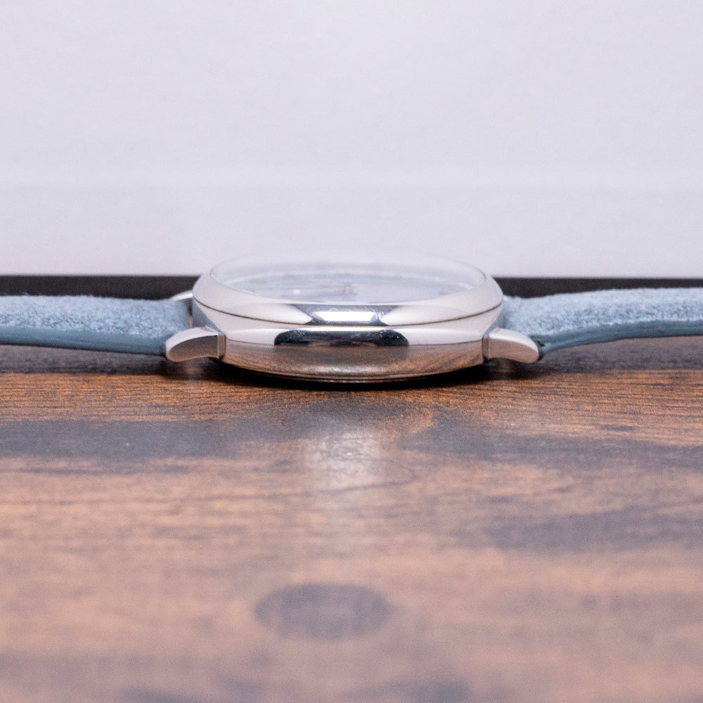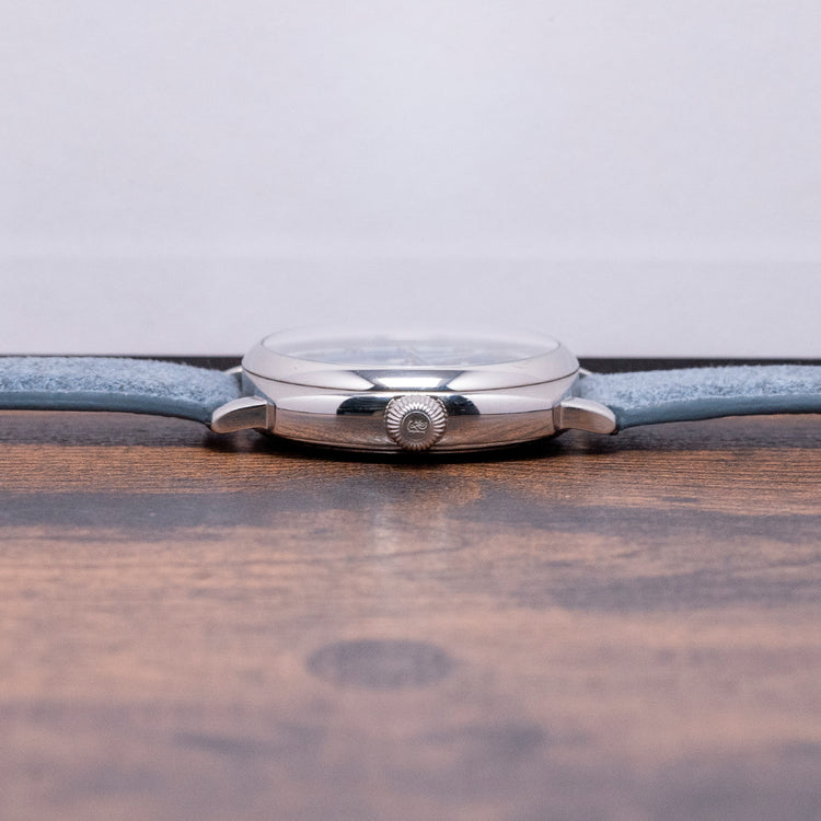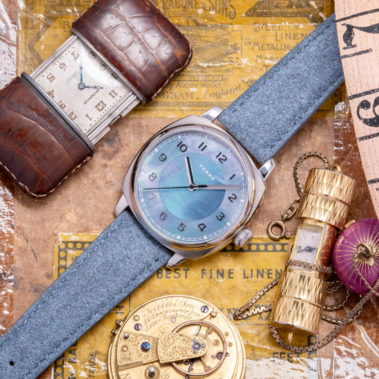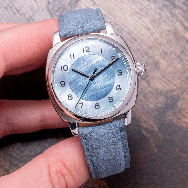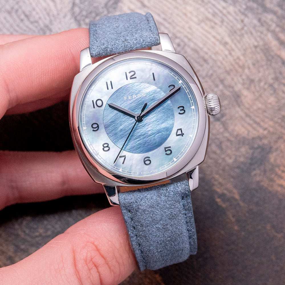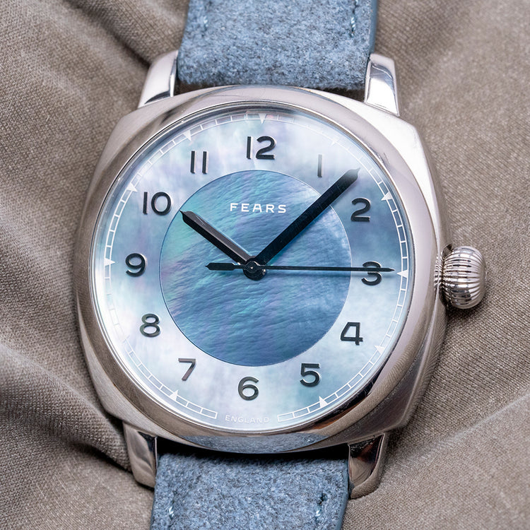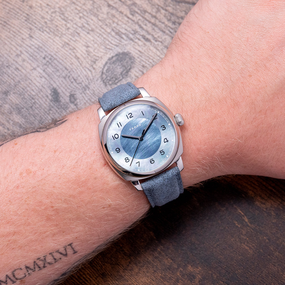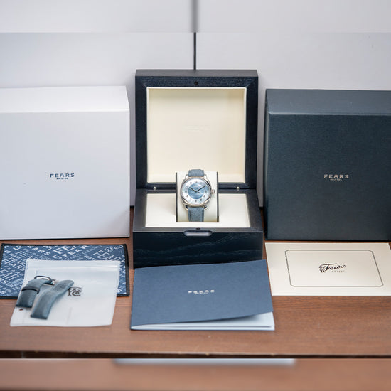 Here is the stylish 2023 Fears Brunswick 40 Aurora Mother-of-Pearl Dial Automatic. Each piece has a unique serial number engraved between the lugs at 12 o’clock; this number can be used to identify the watch's history in its master database. The inspiration for this watch case comes from a Fears watch, originally made in 1924. The 40mm brushed and polished stainless steel cushion case sits comfortably on your wrist, thanks to its short, straight lugs. Its curved flanks lead to a lug-to-lug length of 46mm and a case thickness of 12mm, ensuring a comfortable fit on your wrist. On the right side, a traditional polished “onion” shaped screw-down crown. A domed sapphire crystal, ARdur coated inside and out, sits above an incredible mother-of-pearl dial composed of two pieces. An outer minute rail track surrounds applied numerals in a custom ‘Edwin’ typeface, made of polished brass and coated in Rhodium. Each set of Fears hands is made of polished brass, bevelled and coated in Rhodium and complemented by a Fears pipette counterweighted second hand. At noon, we have the Fears motif completing this striking dress watch. On the reverse, we have a solid screw-down case back. Inside, we have an automatic La Joux-Perret Cal. G101, 24 jewels, 28,800 beats per hour, featuring hand-winding and hacking seconds. It comes paired with two 20mm Fears Straps and a signed pin buckle. The Fears Brunswick 40 Aurora Mother-of-Pearl is presented in a slim wooden box, including its Fears paperwork.