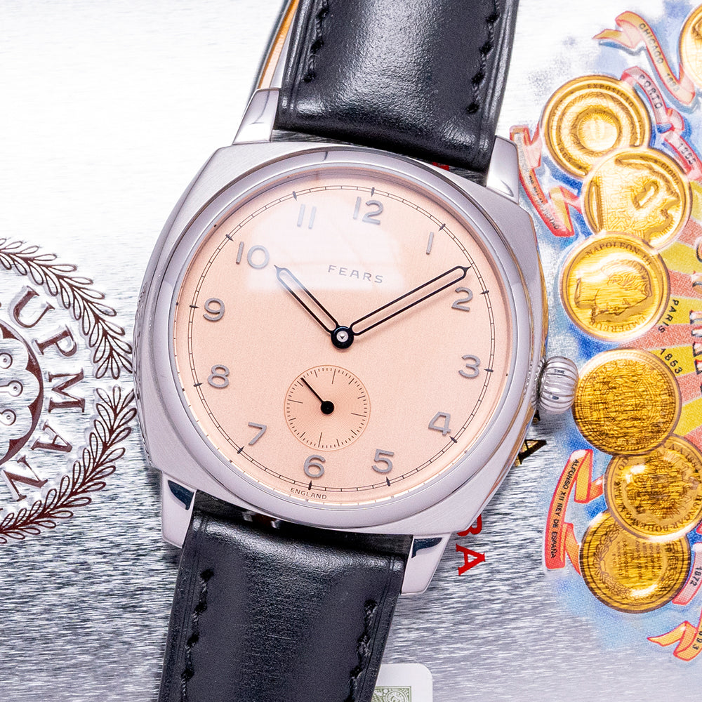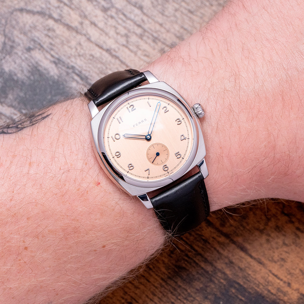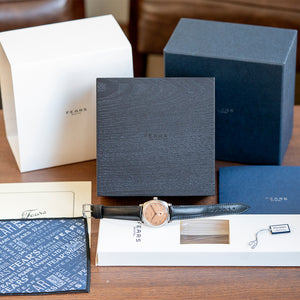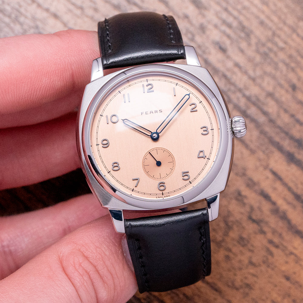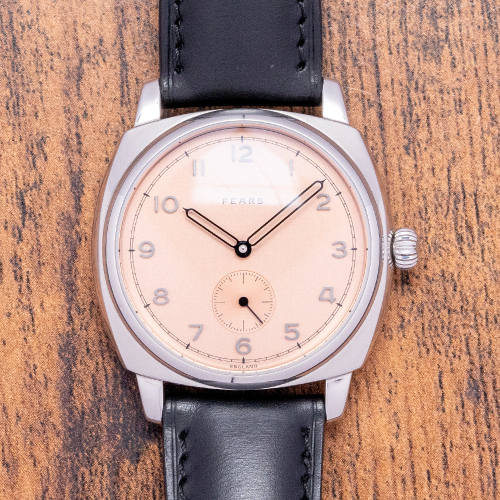 Here we have a 2023 Fears Brunswick Salmon Manual BS23800A hand-built in Britain in small batches; each piece has a unique serial number engraved between the lugs at 12 o’clock; this number can identify the watch's history from its master database. The inspiration for the case for this watch comes from a Fears watch originally made in 1924 and manufactured in Germany; its wonderfully curvaceous 38mm case is made from 316L stainless steel, and the finish and depth of polishing are quite exquisite. A lug-to-lug length of 43mm and a case thickness of 11.5mm ensures a comfortable cushion fit on your wrist. The watch features a traditional “onion” crown with the Fears cypher to facilitate daily winding. On the dial, numerals expertly applied by hand capture and play with the light as you gently wind the crown to begin your day; a domed sapphire crystal sits above an incredible Copper Salmon dial. This special dial was first used on Fears watches of the 1940s and 50s; this rich tone is created using galvanic coatings of 18ct rose gold and copper, expertly made in Germany, and the surface of the dial features a delicate vertical brushing, applied by hand, making each dial unique and allowing it to catch the light in a beautiful, subtle way. This effect is complemented by the concentric circle finishing on the sunken sub-seconds at 6 o’clock. The numerals are applied to the dial by hand after being diamond polished, sand-blasted, and coated in anthracite to give a warm, grey finish. Inspired by the many different typefaces Fears has used throughout its history, they were designed especially for Fears by a horological typographer. Each set of hands is subtly skeletonised before being thermally blued by a flame; this traditional method of thermally hardening the steel results in a blue unique to each Brunswick, from almost black to electric blue in the light. They are all finished by their expert in-house watchmakers in the UK, creating depth and finishing rarely seen on mass-produced, stamped hands. On the reverse, a screw-down closed case back and inside, we have a hand-wound ETA 7001, 17 jewels, and 18,000 beats per hour; first introduced in the 1970s, it quickly gained a reputation for being reliable, and its slim design incorporates an Incabloc shock system. The watch comes paired with a 20mm handmade Fears Bristol Black leather strap. Its calf leather is vegetable tanned in one of Britain's oldest tanneries in Bristol- Thomas Ware & Sons, and the accompanying stainless steel pin buckle carries the final flourish of an engraving of the Fears pipette logo. This watch is sold with its original Fears bespoke wooden presentation box, swing tag, and paperwork.