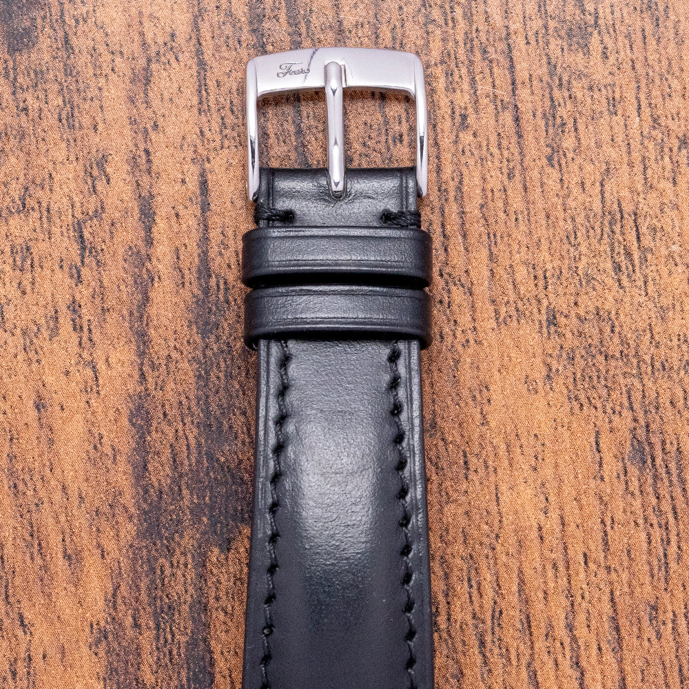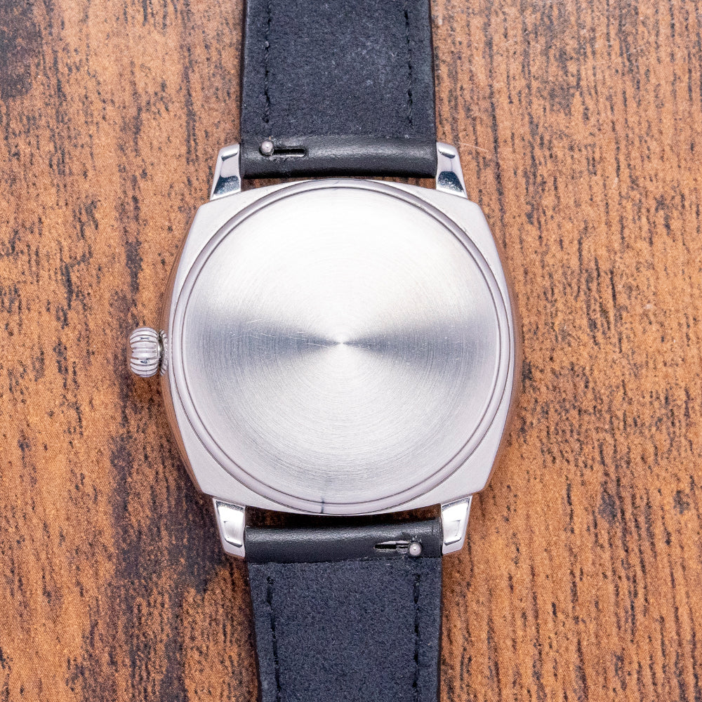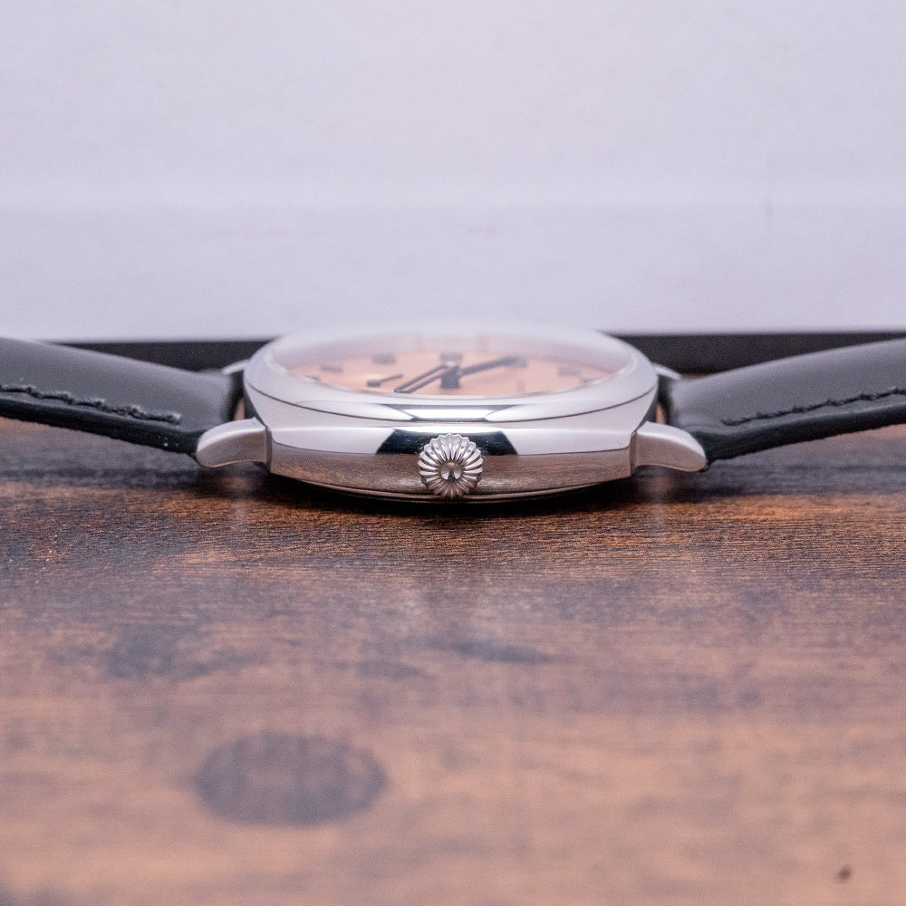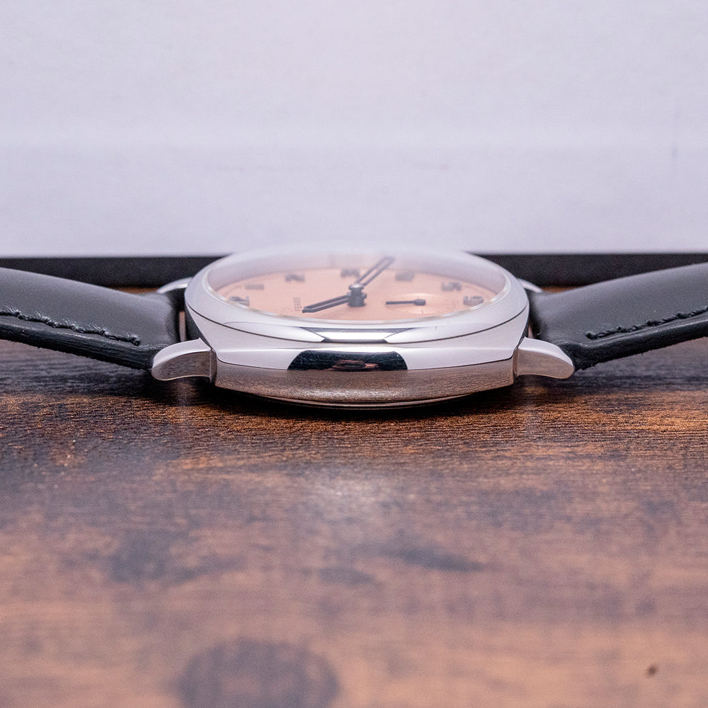 Here we have a 2023 Fears Brunswick Salmon Manual BS23800A hand-built in Britain in small batches; each piece has a unique serial number engraved between the lugs at 12 o’clock; this number can identify the watch's history from its master database. The inspiration for the case for this watch comes from a Fears watch originally made in 1924 and manufactured in Germany; its wonderfully curvaceous 38mm case is made from 316L stainless steel, and the finish and depth of polishing are quite exquisite. A lug-to-lug length of 43mm and a case thickness of 11.5mm ensures a comfortable cushion fit on your wrist. The watch features a traditional “onion” crown with the Fears cypher to facilitate daily winding. On the dial, numerals expertly applied by hand capture and play with the light as you gently wind the crown to begin your day; a domed sapphire crystal sits above an incredible Copper Salmon dial. This special dial was first used on Fears watches of the 1940s and 50s; this rich tone is created using galvanic coatings of 18ct rose gold and copper, expertly made in Germany, and the surface of the dial features a delicate vertical brushing, applied by hand, making each dial unique and allowing it to catch the light in a beautiful, subtle way. This effect is complemented by the concentric circle finishing on the sunken sub-seconds at 6 o’clock. The numerals are applied to the dial by hand after being diamond polished, sand-blasted, and coated in anthracite to give a warm, grey finish. Inspired by the many different typefaces Fears has used throughout its history, they were designed especially for Fears by a horological typographer. Each set of hands is subtly skeletonised before being thermally blued by a flame; this traditional method of thermally hardening the steel results in a blue unique to each Brunswick, from almost black to electric blue in the light. They are all finished by their expert in-house watchmakers in the UK, creating depth and finishing rarely seen on mass-produced, stamped hands. On the reverse, a screw-down closed case back and inside, we have a hand-wound ETA 7001, 17 jewels, and 18,000 beats per hour; first introduced in the 1970s, it quickly gained a reputation for being reliable, and its slim design incorporates an Incabloc shock system. The watch comes paired with a 20mm handmade Fears Bristol Black leather strap. Its calf leather is vegetable tanned in one of Britain's oldest tanneries in Bristol- Thomas Ware & Sons, and the accompanying stainless steel pin buckle carries the final flourish of an engraving of the Fears pipette logo. This watch is sold with its original Fears bespoke wooden presentation box, swing tag, and paperwork.