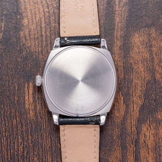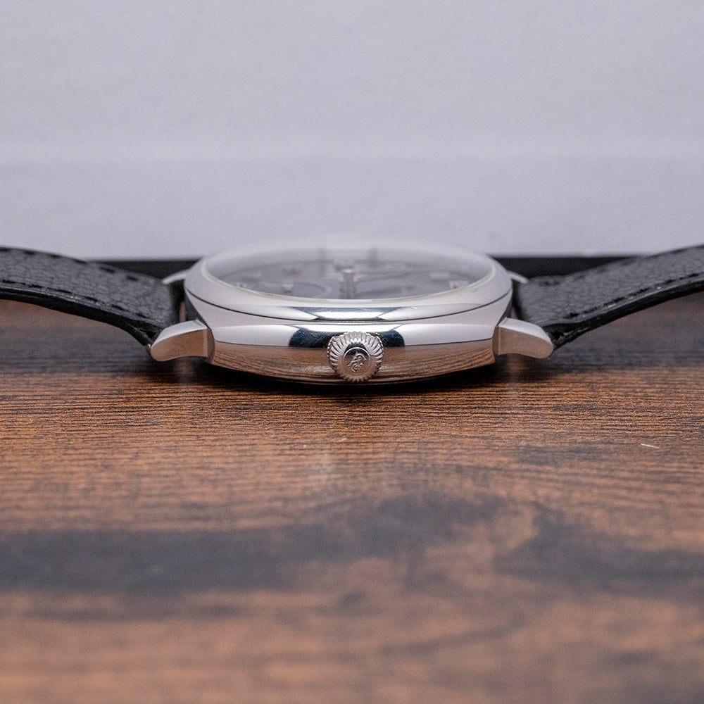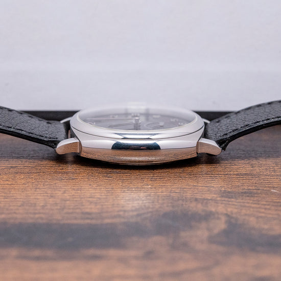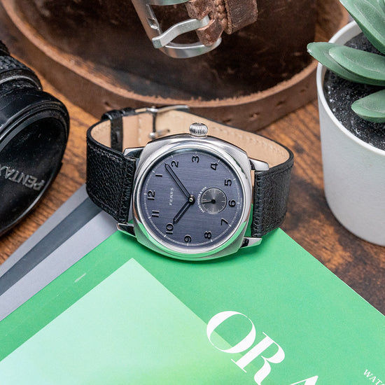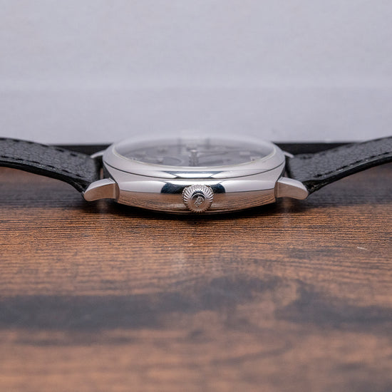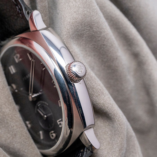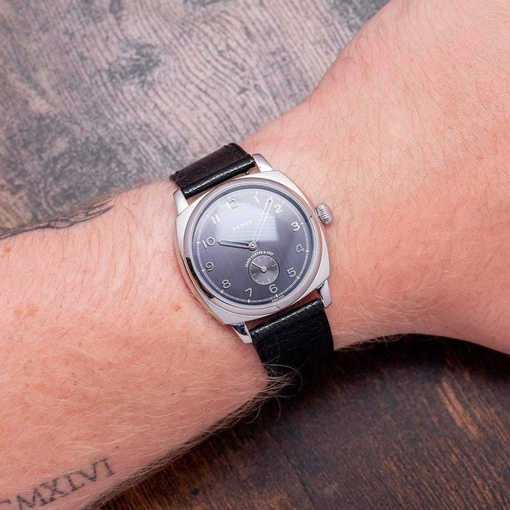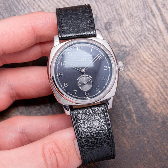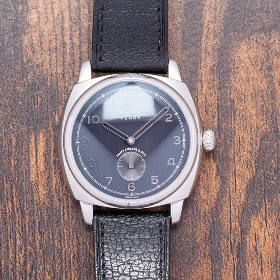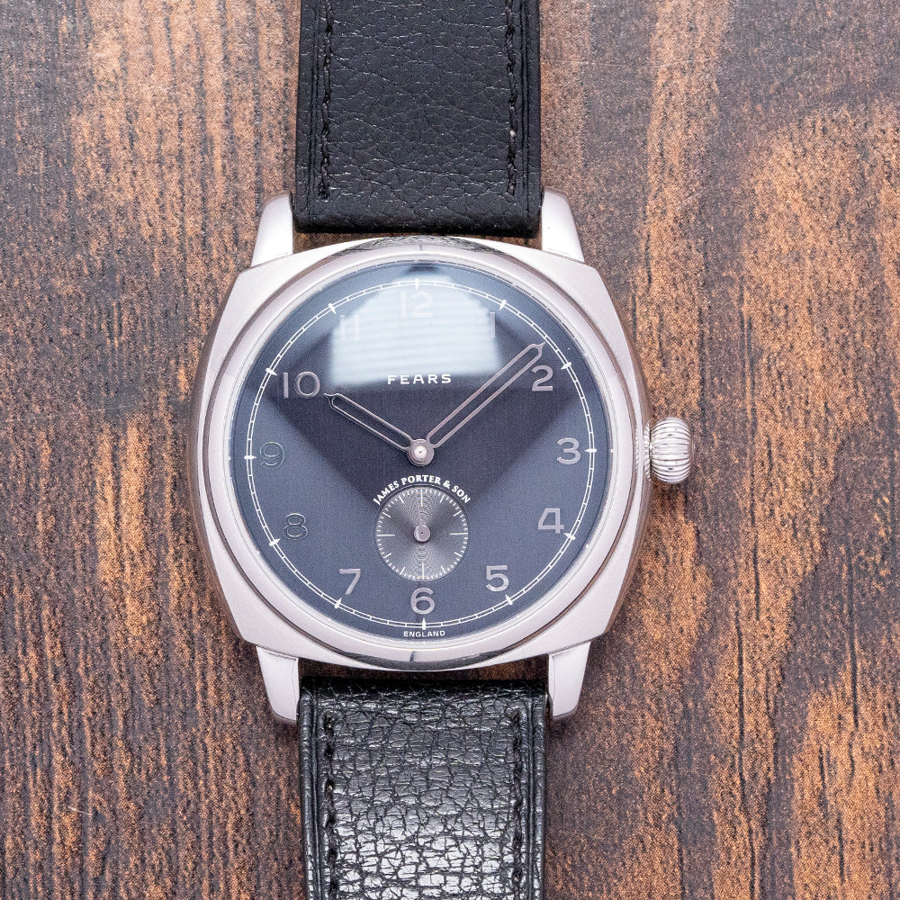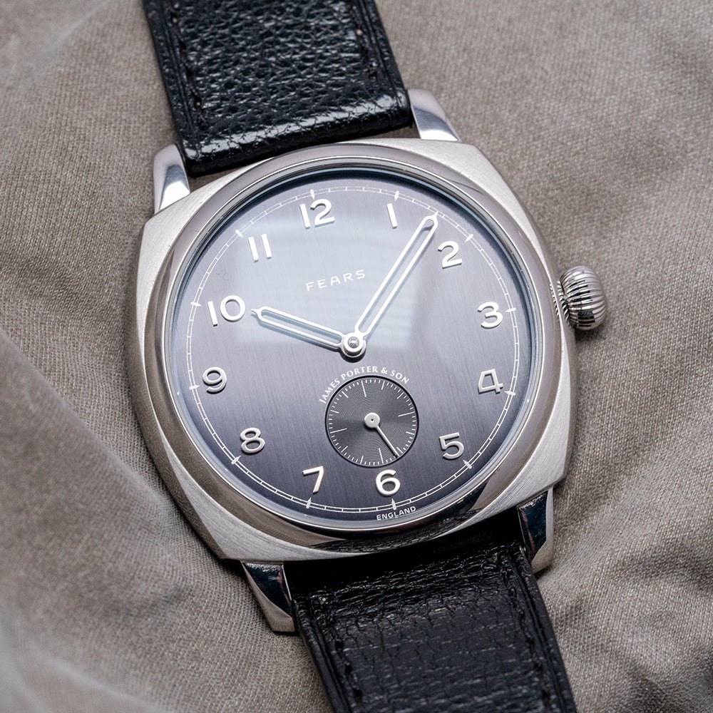 Here we have a 2023 Fears Brunswick x James Porter & Son Limited Edition of 25 pieces, made in small batches for James Porter & Son, a collaboration celebrating their specialist boutique which was founded in 1858, situated in the Glasgow Argyll Arcade, each piece has a unique serial number engraved between the lugs at 12 o’clock, this number can identify the watch's history from its master database. The inspiration for this watch's case comes from a Fears watch originally made in 1924. Its curvaceous 38mm case is made from 316L stainless steel, sitting comfortably on your wrist like a cushion with straight lugs. The subtle curve of the case flanks leads to a lug-to-lug length of 43mm and a case thickness of 12mm. On the right side, there is a traditional “onion” shaped crown. A domed sapphire crystal sits above an incredible brushed GunMetal Grey dial. This special dial was first used on Fears watches of the 1940s and 50s. This rich tone is created using galvanic coatings of black pigments. The surface of the dial features a delicate vertical brushing, making each dial unique and allowing it to catch the light in a beautiful, subtle way. This effect is complemented by the concentric circle finishing on the sunken sub-seconds, at 6 o’clock, with James Porter & Son. The numerals are applied to the dial by hand, after being diamond-polished, sand-blasted, and coated in layers of Rhodium, to give a warm, grey finish. Inspired by the many different typefaces Fears has used throughout its history. Each set of hands is subtly skeletonised before being coated in layers of Rhodium. Inside we have a hand-wound ETA 7001, 17 jewels, and 18,000 beats per hour. First introduced in the 1970s, it quickly gained a reputation for being reliable, and its slim design incorporates an Incabloc shock system. Each movement is decorated with Côtes de Genève striping and blued screws. The watch comes with a 20mm handmade Pewter Grey Barenia leather strap lined with a deep blue Alcantara, and the accompanying stainless steel pin buckle features an engraving of the Fears pipette logo. This watch is sold with its original Fears wooden presentation box and paperwork.