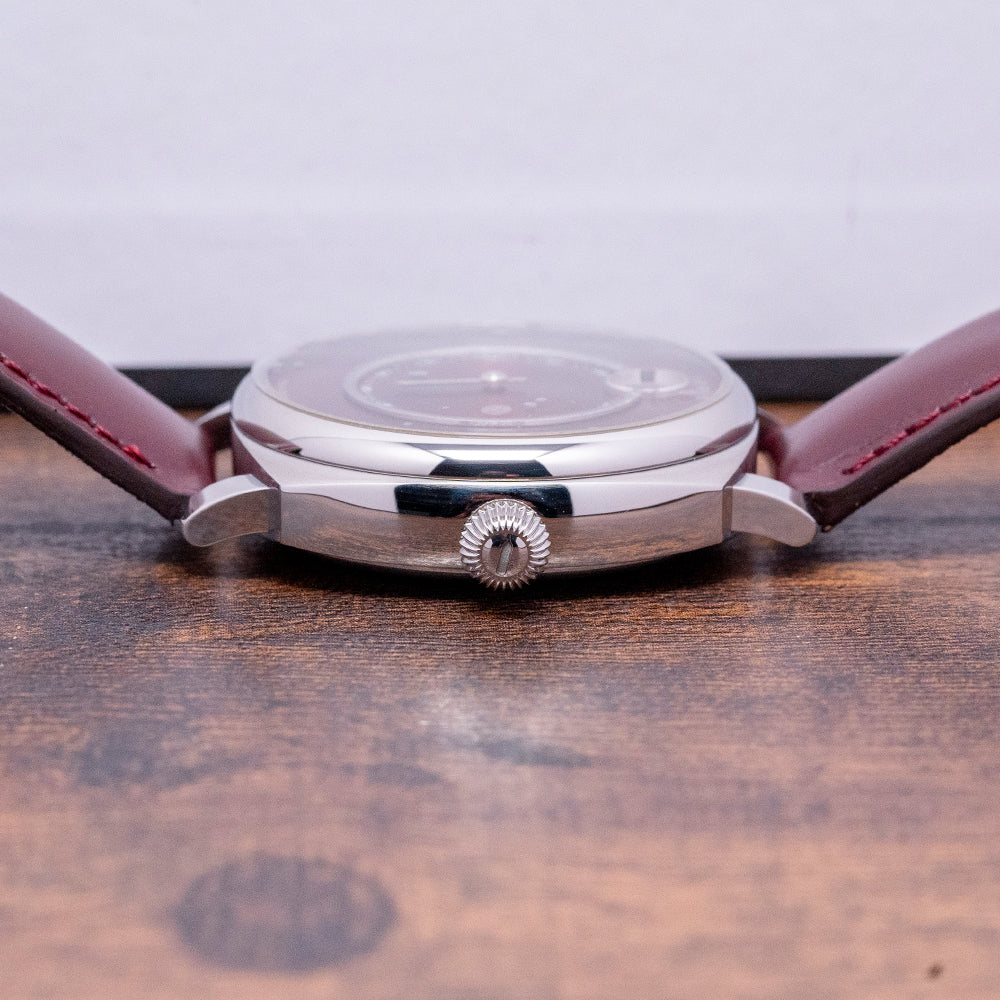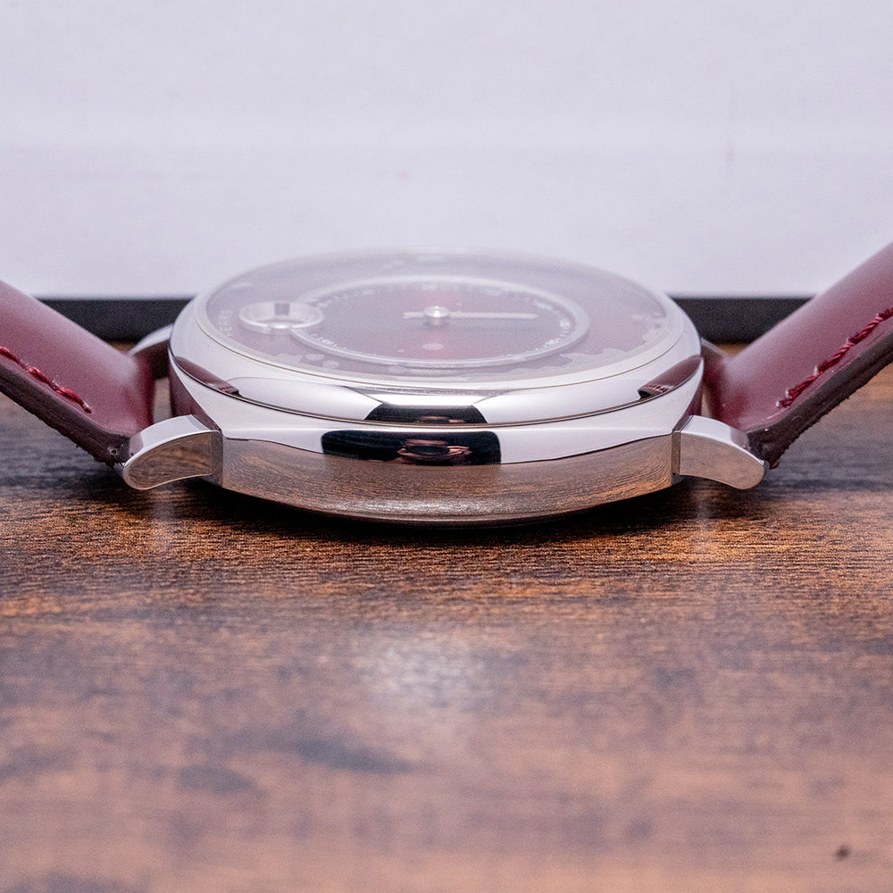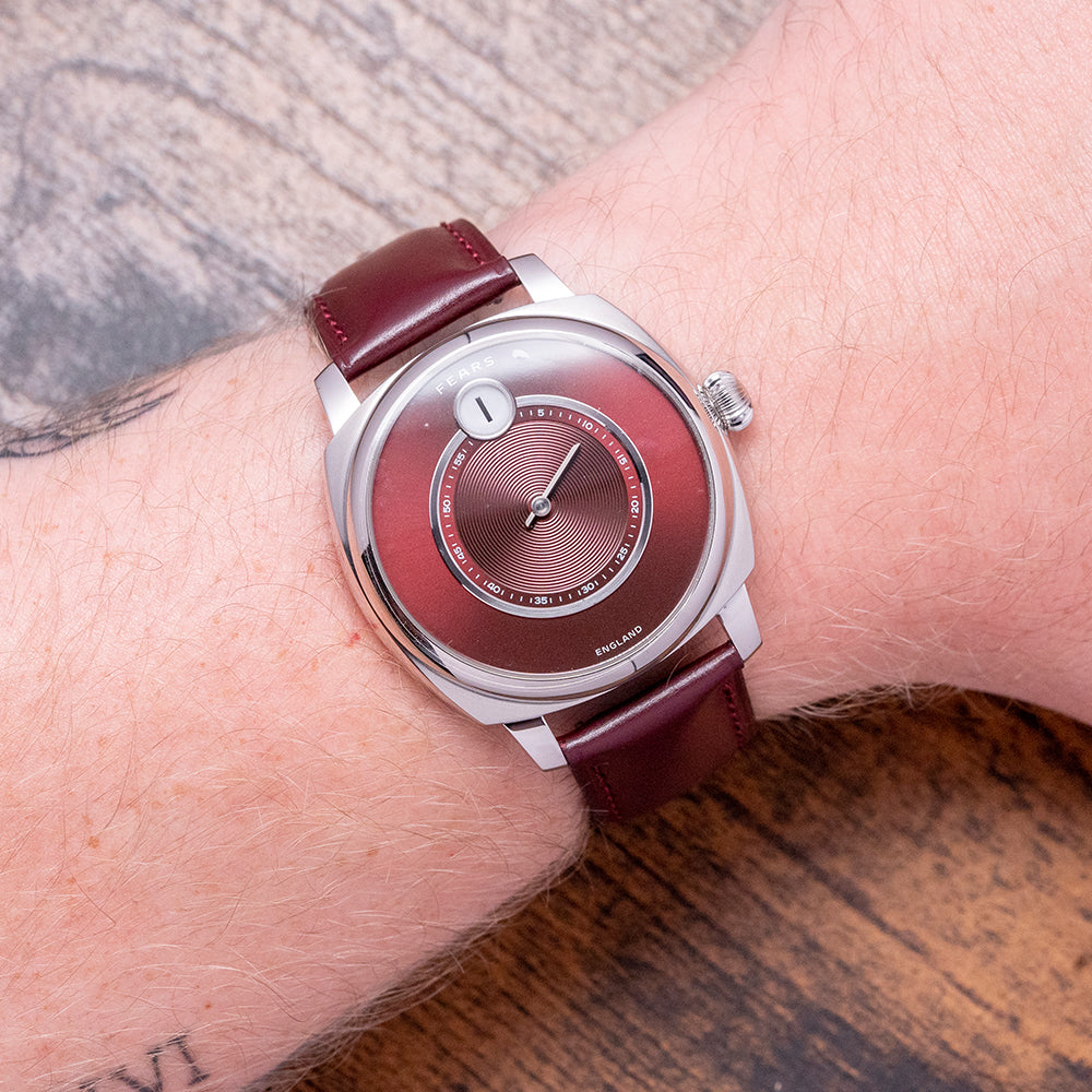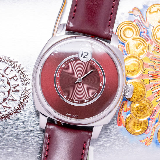Here we have an Unworn 2023 Fears Christopher Ward Alliance 01 Jump Hour, a unique collaboration between two British Watch & Clock Makers Alliance powerhouses. The Alliance was set up in November 2020 as a Trade body representing 75 Brands across the British Isles, including the Republic of Ireland, such brands as Bamford London, Christopher Ward, Fears, Farer, Elliot Brown, Isotope, Marloe Watch Company, MHD Watches, Pinion, Schofield, Studio Underdog and many others. This special watch was only available to Alliance club members in very limited numbers of just 50 watches. Engraved under the four lugs are the logos of Fears, Christopher Ward, and the Alliance, and on the fourth, we have the number of watches ranging from 01 to 50. The elegant polished 40.5mm 316L stainless steel Brunswick case takes its inspiration for the case from a Fears watch originally made in 1924, and manufactured in Germany; it is wonderfully curvaceous, with not a flat surface to be found. The finish and depth of polishing are quite exquisite and showcase the German manufacturers' skill and attention to detail. The watch features a traditional “onion” shaped crown to facilitate daily winding, signed with the Fears Pipette. The smooth polished bezel holds a domed sapphire crystal AR coated inside and out above a stunning Burgundy Red matte lacquered dial. This distinctive dial is made up of an outer sunburst ring; at 12 o’clock, we have the hour window in white lacquer with black ink Fears “Edwin” typeface, intersecting a frosted minute chapter ring in silver ink numerals and a polished ring surrounds the deeply engraved concentric guilloche centre with the Fears shaped” minute hand that is Rhodium plated, half mirror diamond polished and half frosted. At 12 o’clock, we have the Fears motif, and at 6 o’clock, “England” in silver ink, completing this mesmerising dial. The light magically plays with the different surfaces as you rotate your wrist. Inside an automatic Modified Sellita SW200, this JJ01 movement has a module developed in-house by Johannes Jahnke, a former master watchmaker of Christopher Ward. It is decorated with the Christopher Ward Twin Flags logo and is plated with rhodium. The watch comes paired with its 20mm Fears Belgium handmade Burgundy Red, British calf leather, tanned in the UK, lined in Alcantara and a signed pin buckle, and the watch comes with its original Fears bespoke English Ash wooden presentation box stained in Fears Blue and lined in cream suede and Fears paperwork.