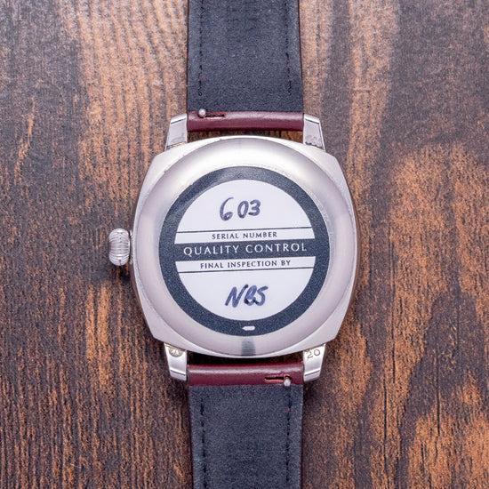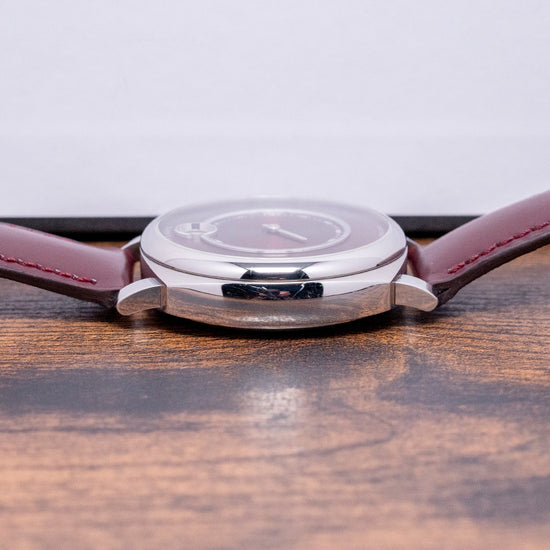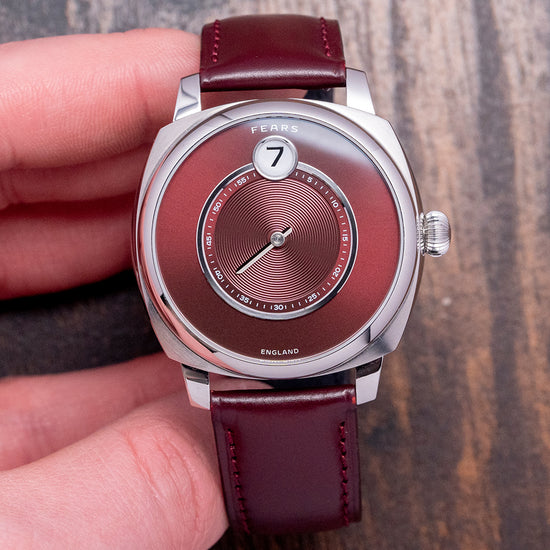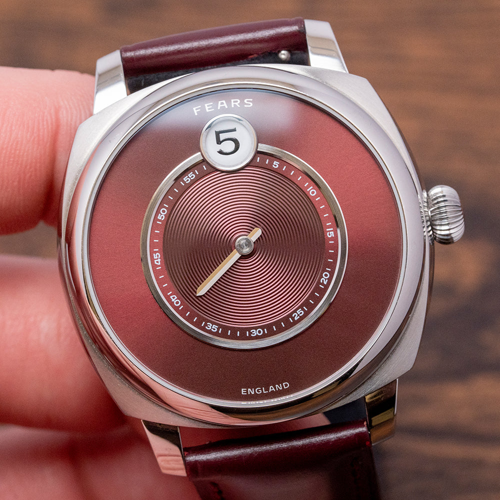 Here we have a 2023 Fears Christopher Ward Alliance 01 Jump Hour, a collaboration between two of the British Watch & Clock Makers Alliance brands. This special watch was only available to Alliance club members in very limited numbers of just 50 watches. Engraved under the four lugs are the logos of Fears, Christopher Ward, and the Alliance and on the fourth we have the number of the watch ranging from 01-50. The polished 40.5mm 316L stainless steel Brunswick case takes its inspiration for the case from a Fears watch originally made in 1924. The watch features a traditional “onion” shaped crown, signed with the Fears Pipette. The smooth polished bezel holds a domed sapphire crystal AR coated inside and out, above a stunning Burgundy Red matte lacquered dial. This distinctive dial is made up of an outer sunburst ring; at 12 o’clock, we have the hour window in white lacquer with black ink Fears “Edwin” typeface, intersecting a frosted minute chapter ring in silver ink numerals and a polished ring surrounds the deeply engraved concentric guilloche centre with the Fears shaped” minute hand that is Rhodium plated, half mirror diamond polished and half frosted. At 12 o’clock, we have the Fears motif, and at 6 o’clock, “England” in silver ink, completing this mesmerising dial. The light magically plays with the different surfaces as you rotate your wrist. Inside an automatic Modified Sellita SW200, this JJ01 movement has a module developed in-house by Johannes Jahnke, a former master watchmaker of Christopher Ward and is decorated with the Christopher Ward Twin Flags logo and Rhodium plated. The watch comes paired with its 20mm Fears Belgium handmade Burgundy Red, British calf leather, tanned in the UK, lined in Alcantara and a signed pin buckle; plus, a Fears quick-release five-link bracelet in milled 316L stainless steel; its flush-fitting gives it an integrated aesthetic; the alternating polished and brushed finishing complements the case finishing, secured to the wrist with a push-button release butterfly clasp, all links are included. The watch comes with its original Fears bespoke English Ash wooden presentation box, swing tag and Fears paperwork.