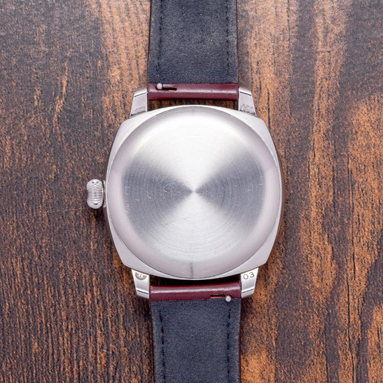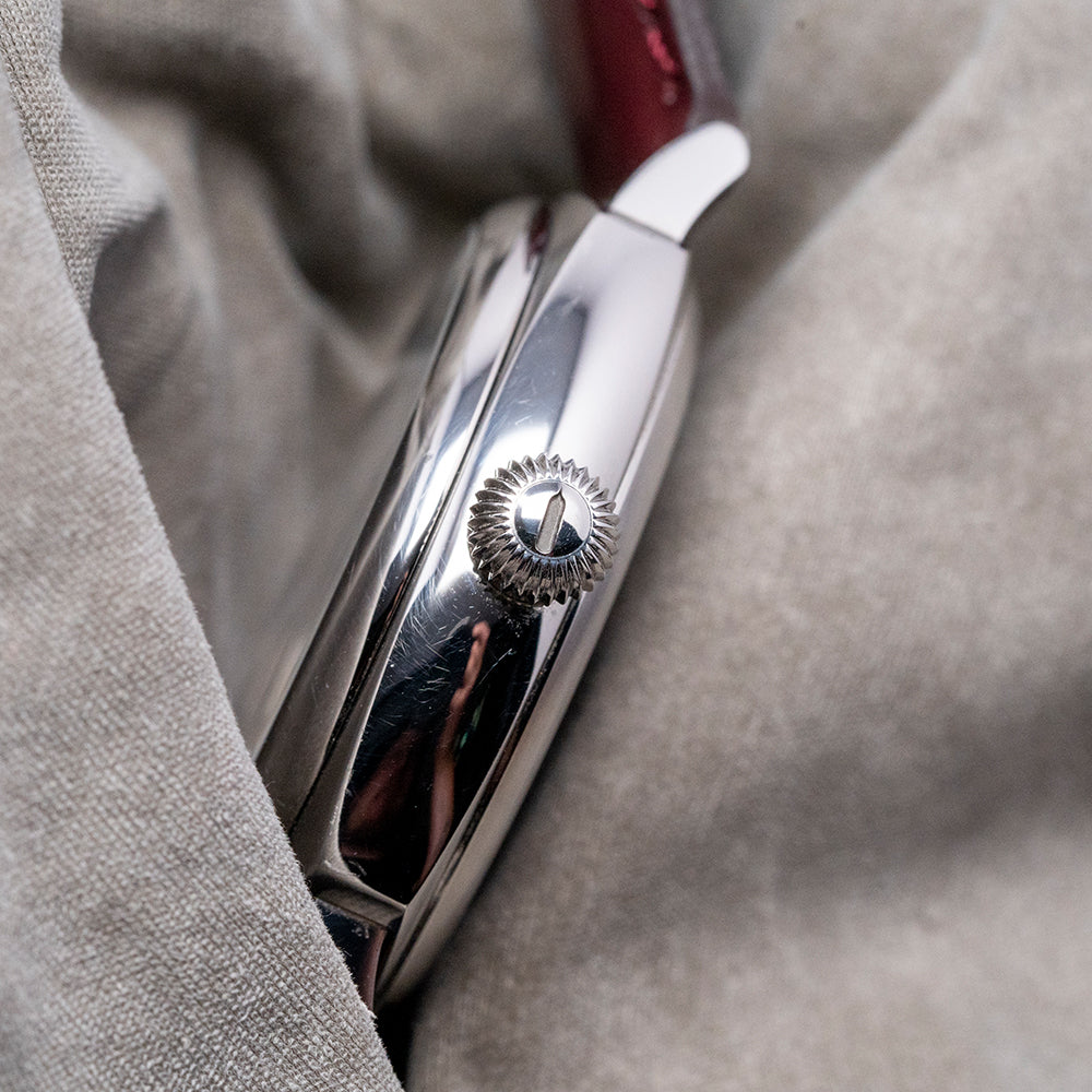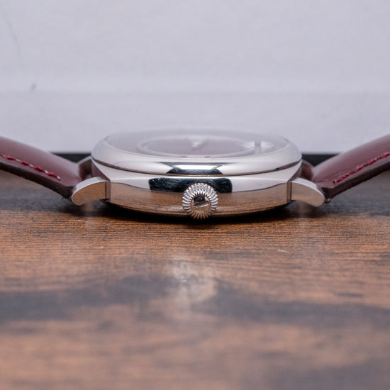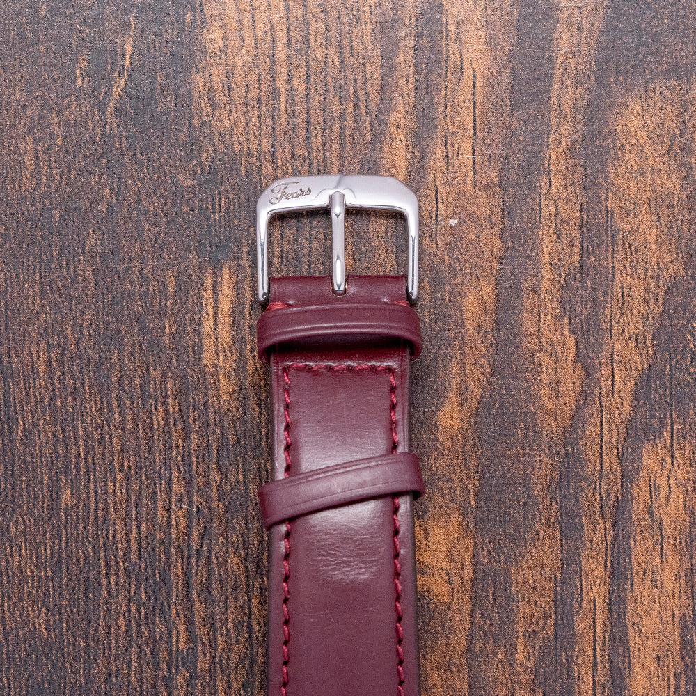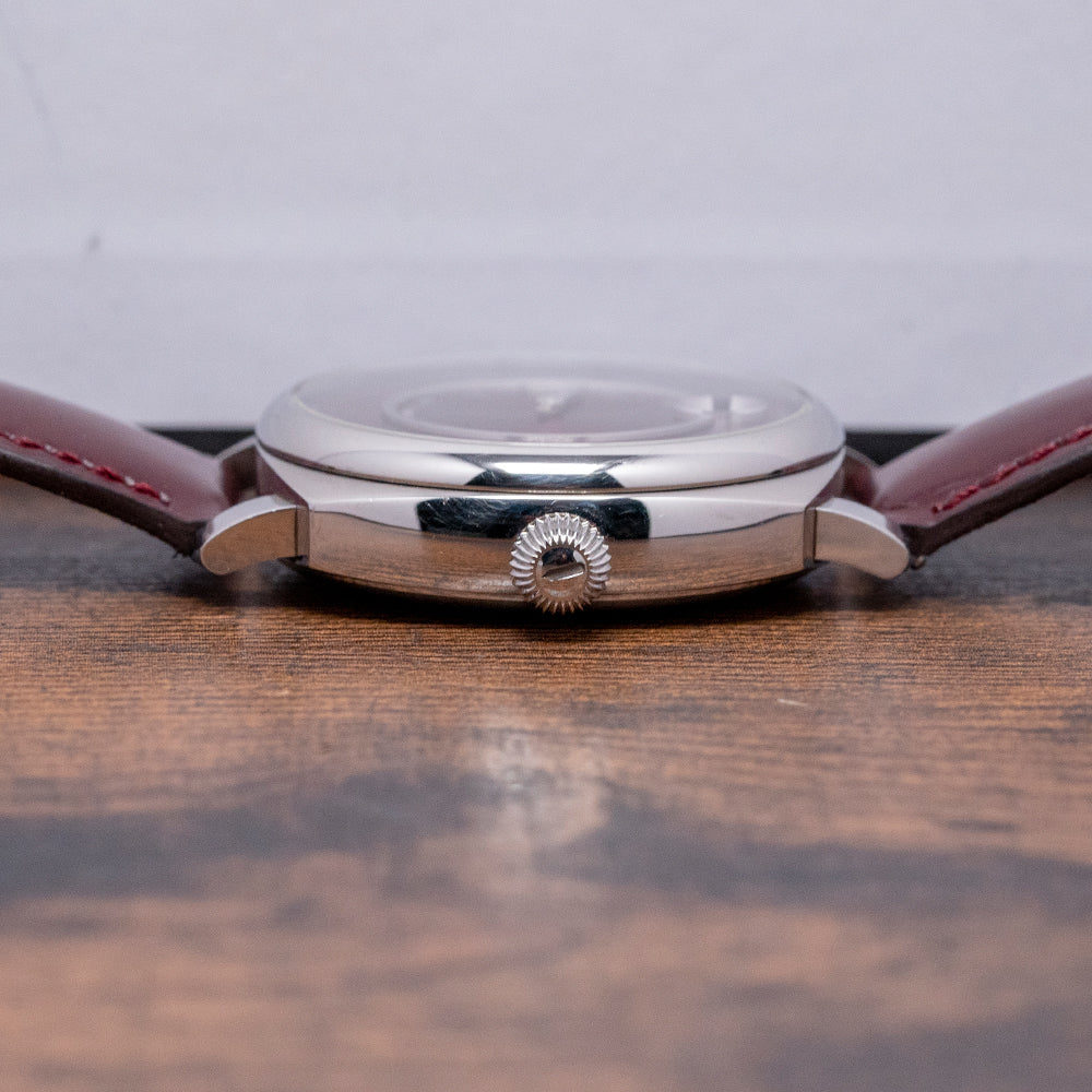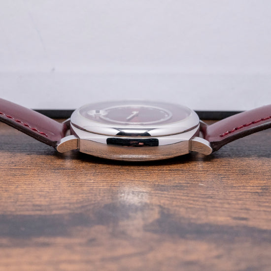 Here we have a 2023 Fears Christopher Ward Alliance 01 Jump Hour, a collaboration between two of the British Watch & Clock Makers Alliance brands. This special watch was only available to Alliance club members in very limited numbers of just 50 watches. Engraved under the four lugs are the logos of Fears, Christopher Ward, and the Alliance and on the fourth, we have the number of the watch, ranging from 01-50. The polished 40.5mm 316L stainless steel Brunswick case takes its inspiration for the case from a Fears watch originally made in 1924. The watch features a traditional “onion” shaped crown, signed with the Fears Pipette. The smooth, polished bezel holds a domed sapphire crystal AR-coated inside and out, above a stunning Burgundy Red matte lacquered dial. This distinctive dial is made up of an outer sunburst ring; at 12 o’clock, we have the hour window in white lacquer with black ink Fears “Edwin” typeface, intersecting a frosted minute chapter ring in silver ink numerals and a polished ring surrounds the deeply engraved concentric guilloche centre with the Fears shaped” minute hand that is Rhodium plated, half mirror diamond polished and half frosted. At 12 o’clock, we have the Fears motif, and at 6 o’clock, “England” in silver ink, completing this mesmerising dial. The light magically plays with the different surfaces as you rotate your wrist. Inside an automatic Modified Sellita SW200, this JJ01 movement has a module developed in-house by Johannes Jahnke, a former master watchmaker of Christopher Ward and is decorated with the Christopher Ward Twin Flags logo and Rhodium plated. The watch comes paired with its 20mm Fears Belgium handmade Burgundy Red, British calf leather, tanned in the UK, lined in Alcantara and a signed pin buckle. The watch comes with its original Fears bespoke English Ash wooden presentation box, swing tag and Fears paperwork.
