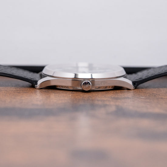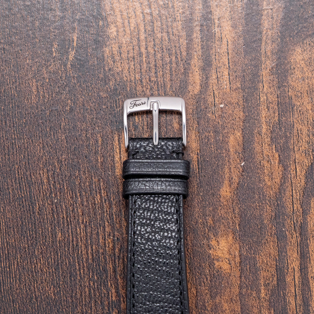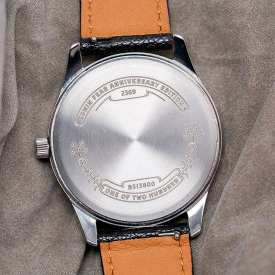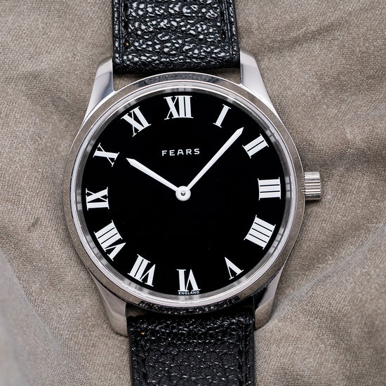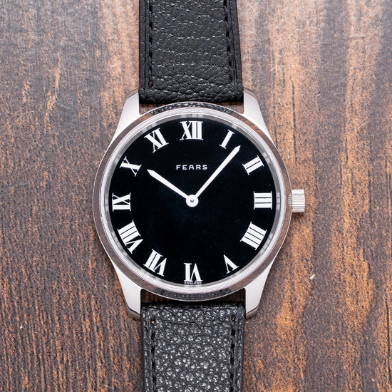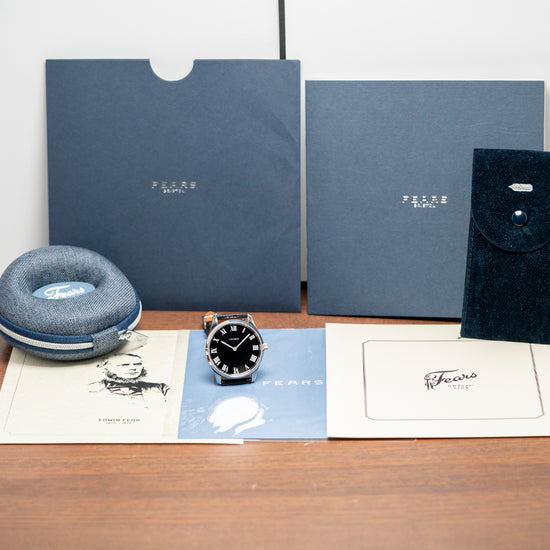 Here we have a 2023 Fears Redcliff 'Edwin Edition' Black Dial Limited Edition of 200 pieces. Celebrating the 200th Anniversary of Edwin Fears' birth. Featuring a 38mm polished stainless steel case that gently curves over your wrist with thick tapered lugs. Its curved, polished flanks lead to a comfortable lug-to-lug length of 44.5mm and a case thickness of just 8mm. On the right side, a signed coin-edged crown. The polished, smooth bezel holds a flat sapphire crystal above a black lacquer dial. Large crisp white Roman numeral indices mark the hours, inspired by a Fears Bristol station clock of the 1920s. Glossy white sword hands sit majestically in the centre, and at noon, we have the Fears motif completing this striking limited edition timepiece. On the reverse, a solid case back is beautifully engraved with the watch's details, powered by a Swiss Quartz Ronda Cal. 512 movement. It comes paired with its Fears 20mm black goat leather strap and signed pin buckle. The watch is presented in its Fears-branded presentation case and paperwork.