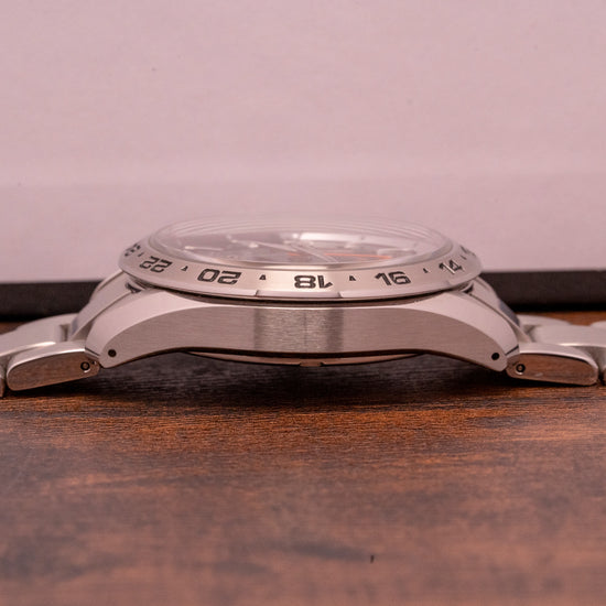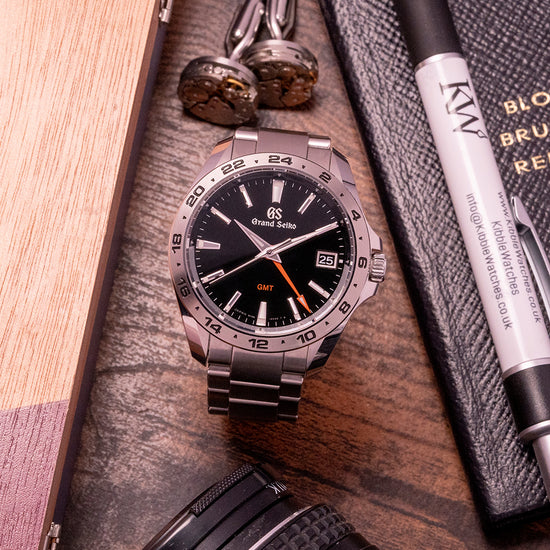 Here we have a 2023 Grand Seiko Sports GMT Quartz Black SBGN003, as part of their Sports Collection it has an impressively sculptured 39mm stainless steel case with exquisitely polished and brushed surfaces that curve over your wrist toward the drilled lugs, and a lug-to-lug of 45.5mm and a case thickness of 11.5mm gives the watch an impressive wrist presence. On the right side at 3 o’clock is a signed screw-down crown protected by crown guards, and a 24-hour satin-brushed steel fixed bezel with deeply engraved numerals filled in black holds a dual-domed sapphire crystal AR coated on the inside above a black dial. Applied Zaratsu polished facet-edged batons and trapezoid indexes mark the hours that play with the light as you rotate your wrist, at 3 o’clock a framed date window, an outer 24-hour chapter ring in black for the night hours and silver for the daytime hours. Elegant dauphine hands are Zaratsu polished with razor edges filled with LumiBrite, a bright orange arrow GMT hand indicates the 24-hour position, and at 12 o’clock we have the Grand Seiko motif and at 6 o’clock an orange “GMT”. On the reverse is a screw-down case back with the serial number engraved into it and a deeply embossed medallion in the centre, inside a Quartz Grand Seiko Cal. 9F86, this is a top-tiered Quartz movement, Seiko grows their own quartz crystals, and using a higher torque allows them to use these heavier GS hands, keeping their brand aesthetic intact. The watch comes fitted on its 20mm stainless steel bracelet expertly brushed and polished with a push-button released signed clasp and also comes with a Grand Seiko presentation box, swing tag and papers.
