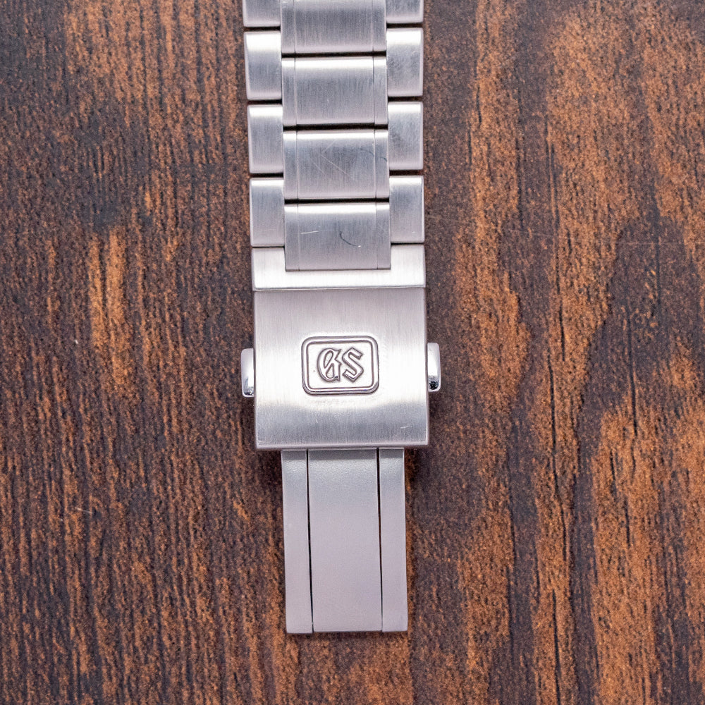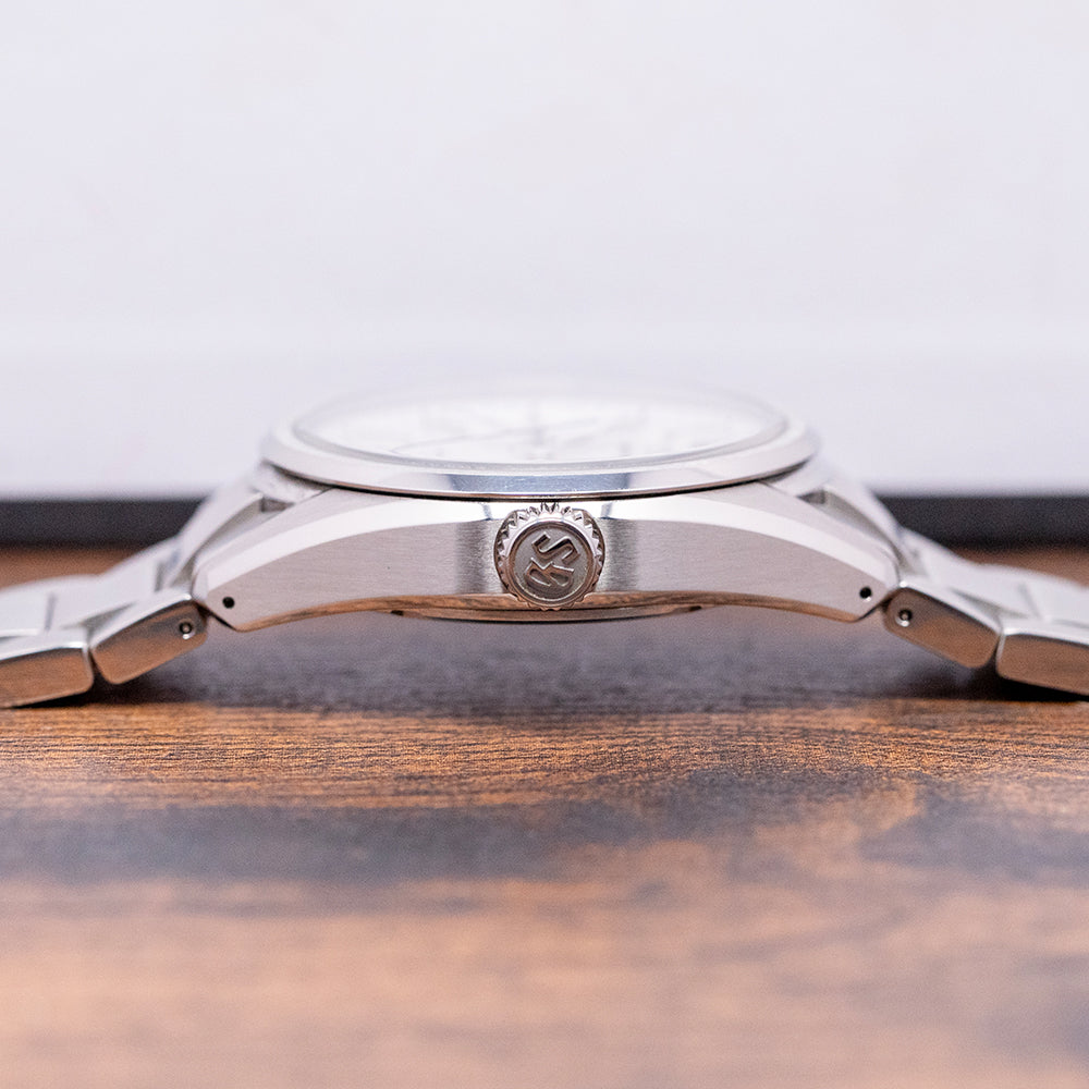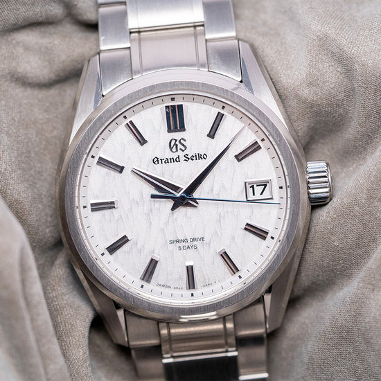 Here we have a 2023 Grand Seiko Spring Drive 'White Birch' SLGA009G, the elegant 40mm stainless steel case has been expertly brushed and polished for an exquisite finish, with a subtle curve of the drilled lugs that sits perfectly on the wrist. The polished chamfered-edge flows across the case towards a lug-to-lug length of 47.5mm and a case thickness of 11.5mm, ensuring a comfortable fit. A polished chamfer edge flows around the case, and brushed surfaces transition with crisp lines. On the right side, a signed crown. The stepped brushed and polished smooth bezel holds a box-shaped sapphire crystal AR coated on the inside above a stunning textured silvery-white birch dial that resembles the distinctive bark pattern of the birch trees found in the forests of northern Japan near their Grand Seiko studio, an outer minute chapter ring surrounds applied faceted indexes marking the hours that have chamfered edges Zaratsu hand polished which shimmer in the light as you rotate your wrist, at 3 o’clock a framed date window, elegant dauphine hands are Zaratsu polished with razor edges complemented by a blue sweeping second hand, at 12 o’clock we have the applied “GS” and “Grand Seiko” printed underneath, at 6 o’clock ‘Spring Drive 5 Days’ completes this incredible inspired by nature dress watch. On the reverse, a screw-down exhibition case back, inside a Spring Drive Grand Seiko Cal. 9RA2, an innovative Spring Drive movement, is mechanical, but with an electromagnetic escapement regulated by a quartz oscillator, it features 38 jewels and boasts an impressive power reserve of five days. Its sole power source is a mainspring that drives a series of gears, a rotor connected to the end of these gears, which then generates a small electrical charge that activates an electronic circuit and quartz oscillator; therefore, there is no need for a battery. The movement features dual-size barrels and a one-piece centre bridge, which provides strength, durability, and shock resistance. It comes paired with its original Grand Seiko 22mm, 3-link stainless steel bracelet, expertly brushed and polished with a push-button release 3-fold clasp, all links included. It also comes with its Grand Seiko presentation box and paperwork.