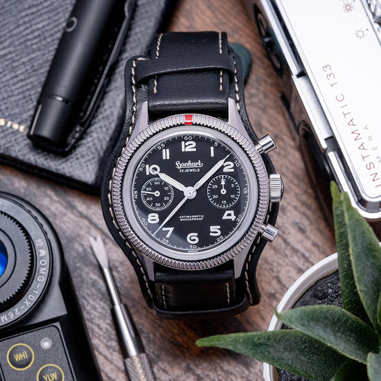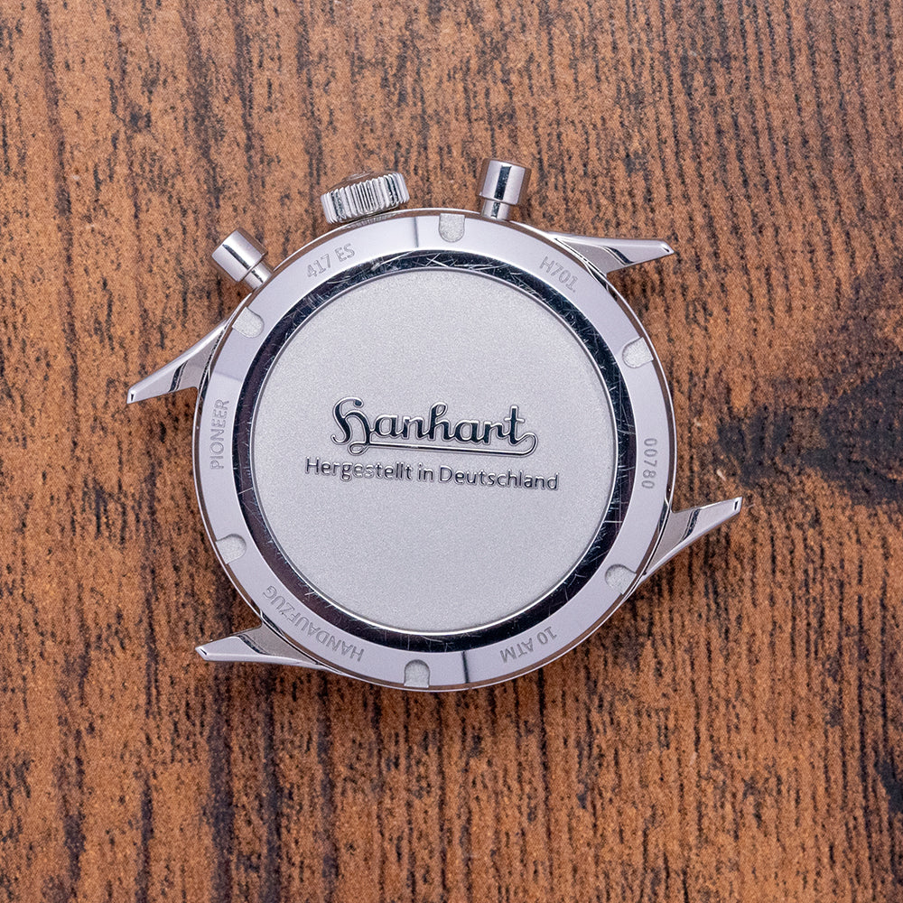 Hanhart was founded in 1882 by watchmaker Johann A. Hanhart. Situated in the small town of Diessenhofen near the River Rhine in Switzerland. In 1902 he relocated to Schwenningen in southern Germany, and Johann's son Wilhelm Julius joined the company in 1920. Innovation and efficient manufacturing techniques saw the introduction of a mechanical stopwatch in 1924. By 1926 they had increased the product range to include wristwatches. In 1938 they produced the single-button “Calibre 40”, which became the mainstay of the company. Expansion during 1939 had the company employing 200 staff. Hanhart chronographs were worn by pilots and naval officers with the production of the iconic “Calibre 41”, their first two-button chronograph. During the war years, production had to stop and Wilhelm fled to neutral Switzerland not returning to Germany until 1949. They entered the very first Baselworld in 1952. The Hanhart Calibre 42 was developed in 1957 and was used by the Luftwaffe of Germany in 1962. Celebrating their 175th Anniversary in 2007 they created the “Opus 41” a hand-wound chronograph in platinum, equipped with an original, Hanhart “Calibre 41”, which was limited to 39 watches. Today they continue to create timepieces using the latest technology and materials whilst keeping to their founding principles.