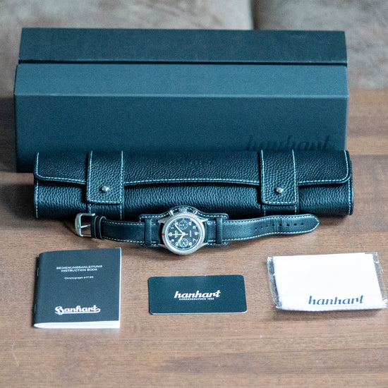 This watch is sold with its original Hanhart Box, watch roll & Paperwork. The watch comes paired with its original 20mm Bund-style strap with a signed buckle. The watch is from December 2023 and is sold in worn condition, but overall very good, worn only a handful of times, as you can see from the pictures. The watch comes with its Manufacturer's Warranty.