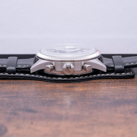 Here we have a 2023 Hanhart Pioneer 417 ES 1954 Chronograph Manual with a 39mm polished and brushed stainless steel case, the ES ( “Edelstahl”) is German for stainless steel, and the broad brushed flanks curve over your wrist with finely tapered flat-ended lugs, a modern interpretation of their first pilot's chronograph used by the German armed forces, produced from 1954 until 1963 it was known as the 417. A lug-to-lug length of 45.5mm and a case thickness of 13mm give the watch an impressive wrist presence, down the right side, we have the piston chronograph pushers and a signed crown in the centre. The coin-edged bezel with a splash of red at 12 o’clock painted in a scratch-resistant HyCeram holds a box-shaped sapphire crystal AR coated above a matte black bicompax dial. An outer minute track is precisely printed with the Arabic numeral indices coated in Super LumiNova marking the hours, at 3 o’clock we have a 30-minute register and at 9 o’clock the small seconds register each sitting slightly recessed, elegant syringe-style hands infilled with Super LumiNova and complemented by a tapered chronograph hand, at 12 o’clock the Hanhart motif “23 Jewels” and at 6 o’clock “Antimagnetic Shockproof” completes this traditional vintage-inspired Pilots bicompax chronograph. On the reverse, a screw-down case back with the details of the watch engraved around its edge and an embossed Hanhart motif in the centre, inside a manually wound Sellita SW 510 M, 23 jewels, beating at 28,800 beats per hour, the movement has hacking seconds. The watch comes fitted on its 20mm Bund-style strap with a signed buckle and the watch comes with its Hanhart presentation box, leather travel case and paperwork.