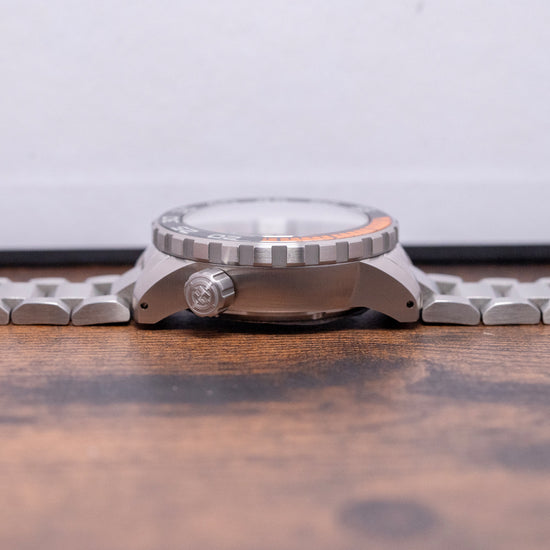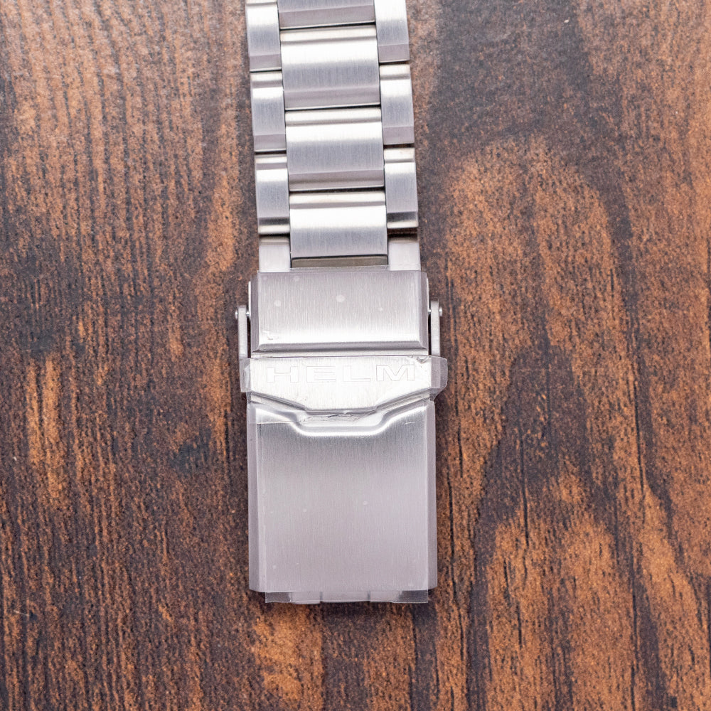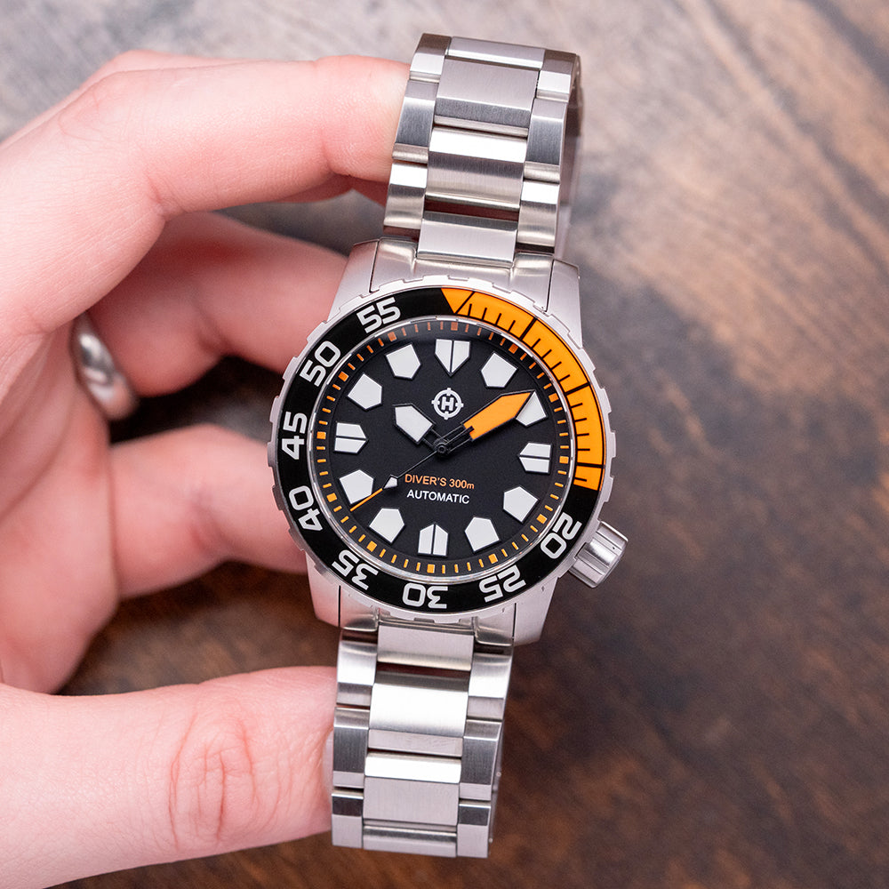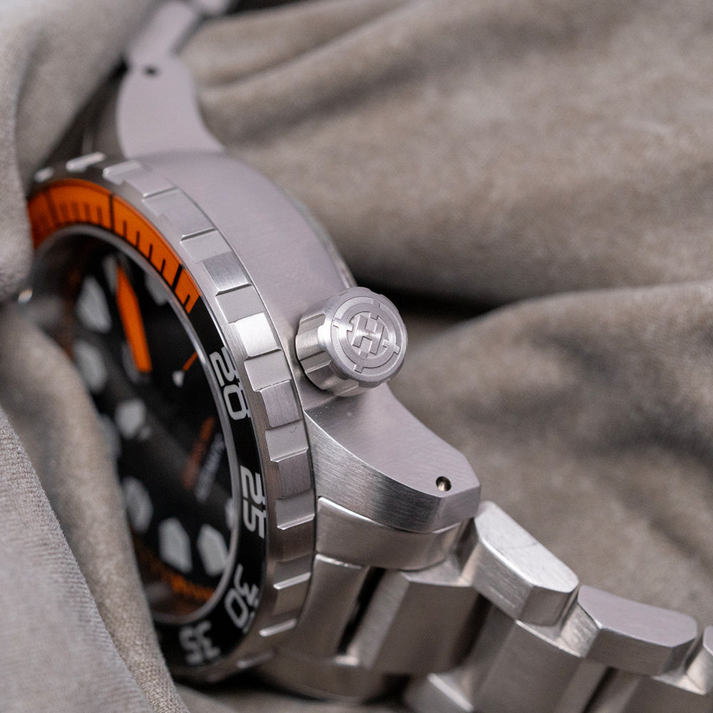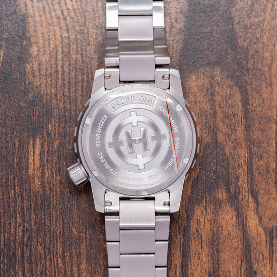 Here we have a 2023 Helm Khuraburi Automatic Black 300M Diver, named after the small coastal town in Thailand. Featuring a 43mm satin-brushed stainless steel case, tested in accordance with ISO 6425:2018 standards. Curving over your wrist with thick, flat-ended drilled lugs. Its curved flanks lead to a lug-to-lug length of 49mm and a case thickness of 15mm, giving the watch an impressive wrist presence. At 4 o’clock, a large, deep knurled screw-down signed crown. The unidirectional 120-click 316L stainless steel bezel features deep knurling for grip and a black sapphire dive insert coated in BGW9 and orange Super-LumiNova. A domed sapphire crystal, AR-coated on the inside, sits above a matte-black dial. An outer orange minute chapter ring surrounds the applied indexes, which are coated in BGW9 lume, marking the hours. Thick sword hands filled with BGW9 and orange lume are complemented by an orange-tipped sweeping second hand. At noon, we have the Helm motif, and at 6 o’clock, ‘Divers 300M’ completes this rugged professional dive watch. On the reverse, a solid screw-down case back, deeply engraved and embossed with the watch's details. Inside an automatic Seiko Cal. NH38, 24 jewels, 21,600 beats per hour; the movement has hacking, quick-set date and hand-winding for your convenience. It comes paired with its 22mm Helm brushed 3-link stainless steel bracelet, secured by a signed fliplock deployant clasp; all links are included, along with an additional NATO strap. This watch is sold with its original Helm box and paperwork.