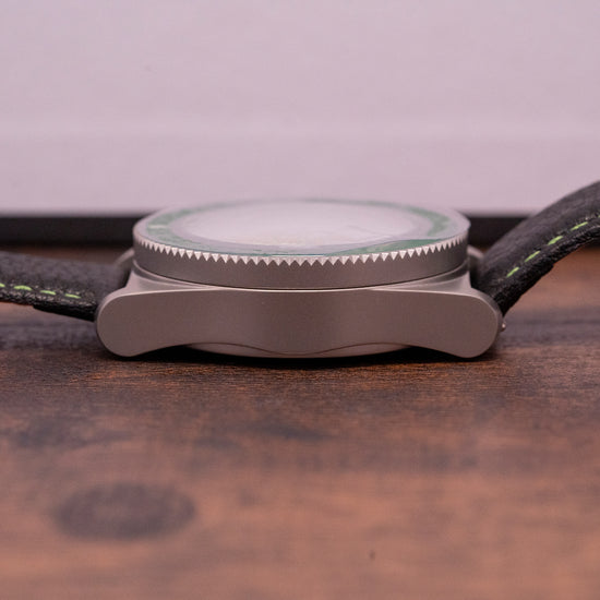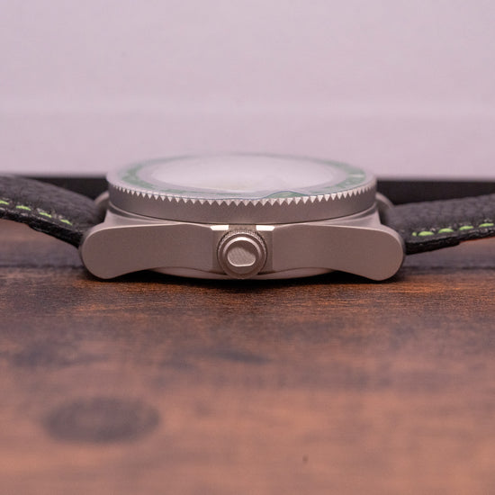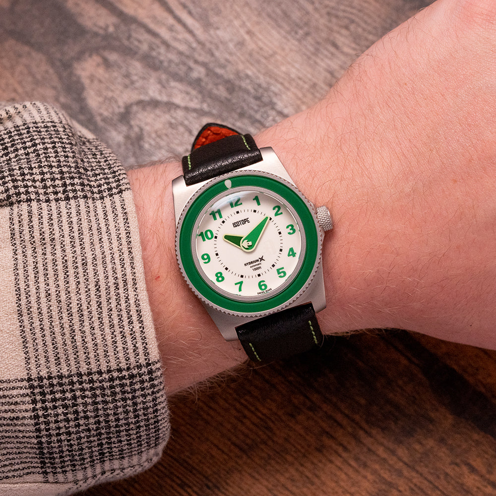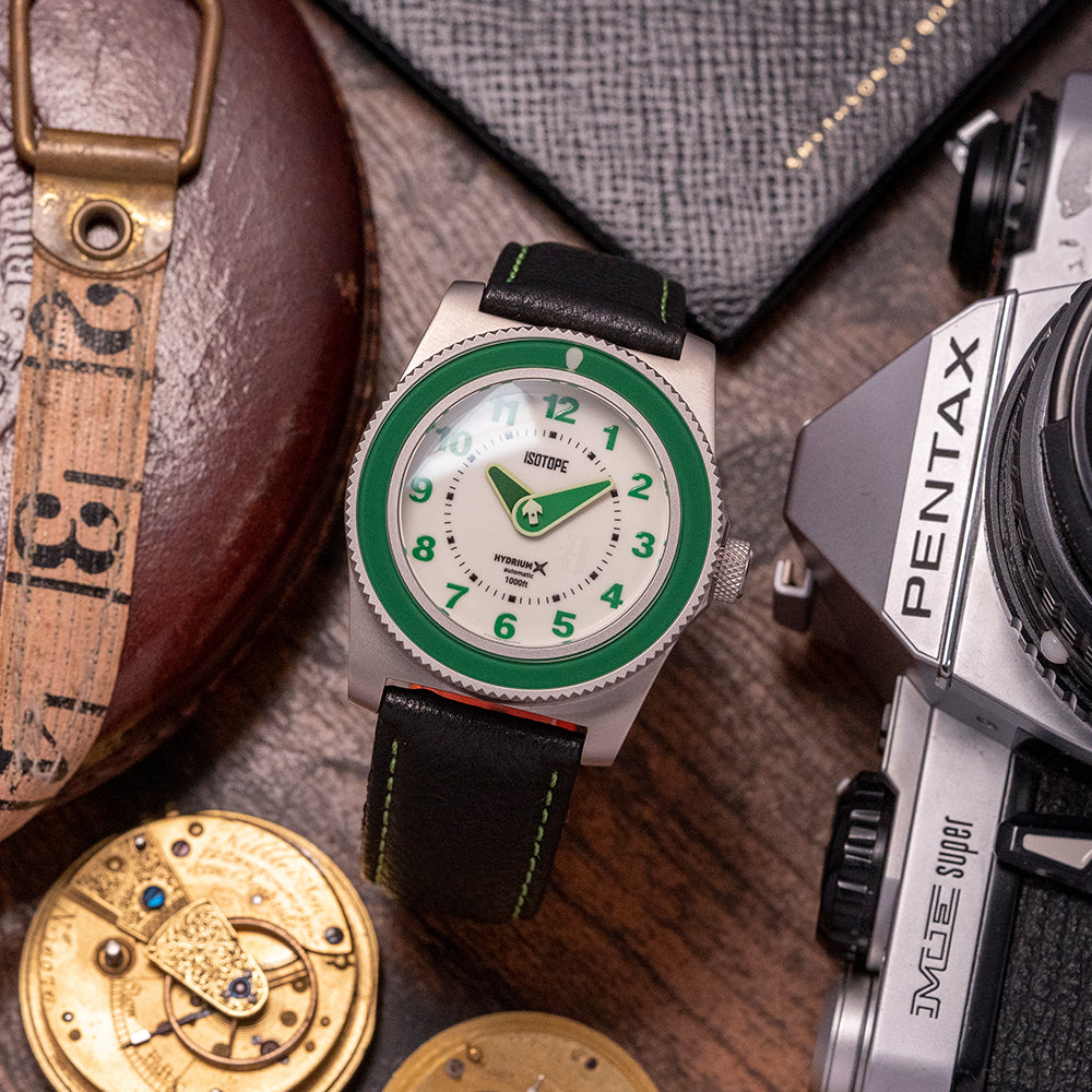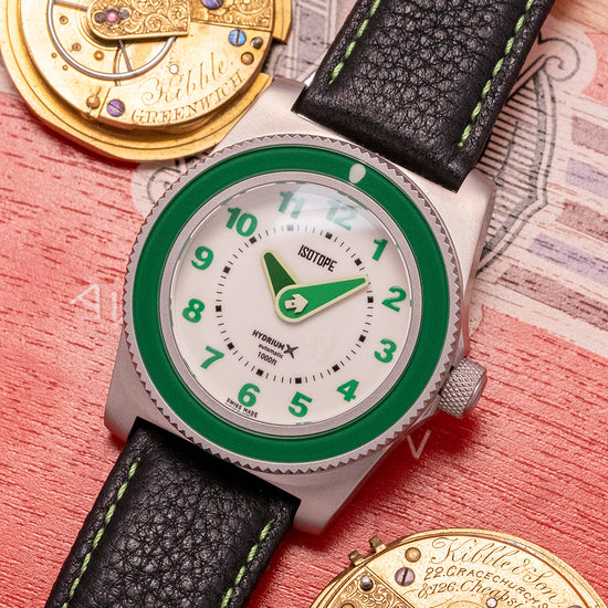 Here we have a 2023 Isotope HydriumX "Exit" Green Limited to 100 pieces inspired by a building's life-saving Exit sign, seen and ignored by many of us on a daily basis. The 40mm micro-blasted stainless steel case curves over your wrist with stubby flat-ended lugs, and a lug-to-lug length of 47.5mm and a case thickness of 14.5mm ensure a comfortable fit. On the right side is a deeply knurled screw-down crown. A 120-click unidirectional bezel has deep knurling for extra grip and a green sterile insert with the Isotope pip at 12 o’clock holding a double domed sapphire crystal above a fully Super-LumiNova lumed off-white dial. Green Arabic numerals mark the hours surrounding an inner minute track and Isotope Lacrima hands in two tones of green with the fun rotating Isotope Lacrima mark in the shape of the exit arrow on top. At 12 o’clock we have the Isotope motif and at 6 o’clock HydriumX, an embossed man exiting a door, “Automatic 1000ft” completes this highly visible tool watch. On the reverse a screw-down exhibition case back showcasing an automatic Landeron Cal. 24, 25 jewels, beating at 28,800 beats per hour, the movement is expertly decorated Côtes de Genève and Perlage. The watch comes fitted on a 22mm quick-release black with green stitching leather strap with a micro-blasted stainless steel signed buckle and the watch comes with its Isotope presentation box and paperwork.