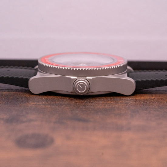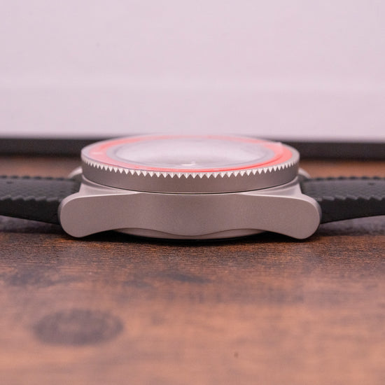 Here we have a 2023 Isotope HydriumX "The Judge" Limited to 100 pieces inspired by the distinctive black, white and red colours worn by Judges for centuries. The 40mm micro-blasted stainless steel case curves over your wrist with stubby flat-ended lugs, and a lug-to-lug length of 47.5mm and a case thickness of 14.5mm ensure a comfortable fit. On the right side is a deeply knurled screw-down crown. A 120-click unidirectional bezel has deep knurling for extra grip and a red sterile insert with the Isotope pip at 12 o’clock holding a double domed sapphire crystal above a black dial. White Super-LumiNova Arabic numerals mark the hours surrounding an inner minute track and Isotope Lacrima hands are outlined in white and infilled in red with the fun rotating Isotope Lacrima mark on top. At 12 o’clock we have the Isotope motif and at 6 o’clock HydriumX, “Automatic 1000ft” completes this Judge-inspired highly visible tool watch. On the reverse a screw-down exhibition case back showcasing an automatic Landeron Cal. 24, 25 jewels, beating at 28,800 beats per hour, the movement is expertly decorated Côtes de Genève and Perlage. The watch comes fitted on a 22mm quick-release black FKM tropic-style strap with a micro-blasted stainless steel signed buckle and the watch comes with its Isotope presentation box and paperwork.