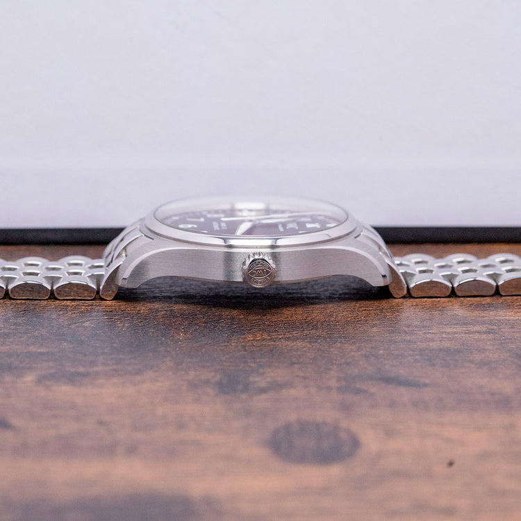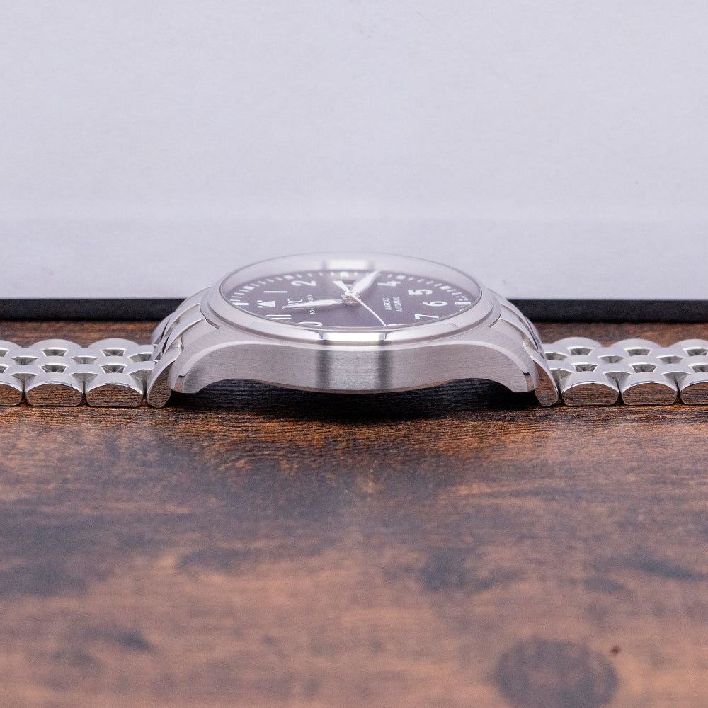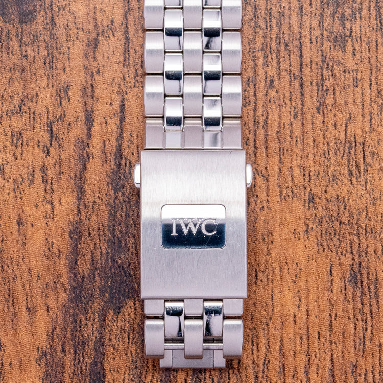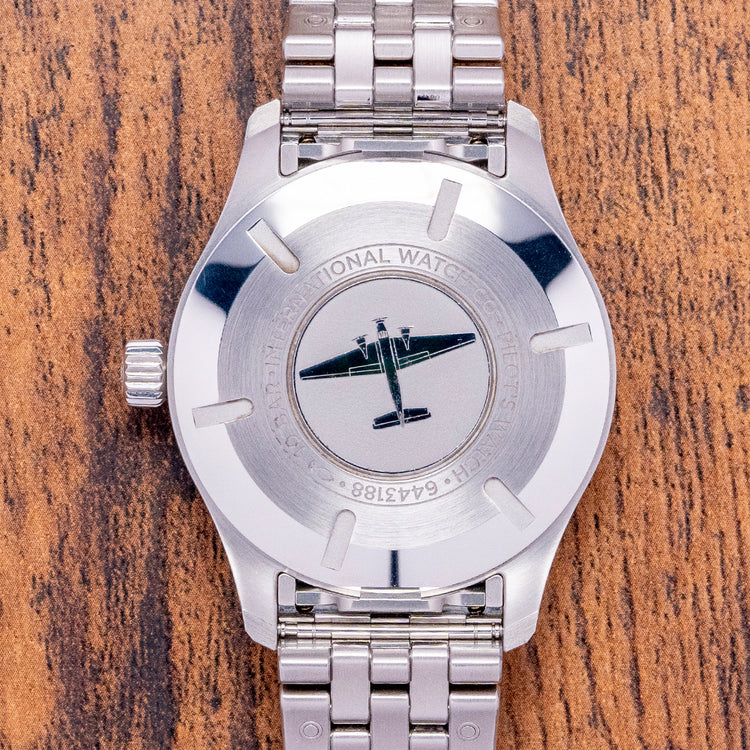 Here we have a 2023 IWC Pilot's Watch Mark XX Automatic IW328202. The Mark X line of watches can trace its heritage back to 1944 when it was issued to the military. The 40mm satin brushed stainless steel case curves over your wrist with a lug-to-lug length of 48mm and a case thickness of 11mm, ensuring a comfortable fit. The soft iron inner case protects the movement from magnetic fields. On the right side, we have a signed screw-down "fish'' crown, used by IWC from the 1950s up to the 2000s; the Richmont Group in 2016 tried to register the fish logo but was refused by the Swiss Federal Institute of Intellectual Property as they felt it was too close to the Christian Ichthys symbol, Richmont appealed the decision, and it was overturned in 2018, and so the "fish'' logo will be seen going forward. The smooth polished bezel holds a convex sapphire crystal AR coated on both sides above a matte black dial; an outer minute track is precisely executed with Super-LumiNova coated batons and Arabic numeral indices marking the hours, at 3 o'clock a date window, at 12 o’clock we have the characteristic large triangle and pips, slender rhodium-plated Alpha hands coated in Super-LumiNova are complemented by a tapered sweeping second hand. Printed at 12 o’clock, we have the IWC motif, and at 6 o’clock, "Mark XX Automatic" completes this vintage-inspired pilot watch. On the reverse, a screw-down case back with IWC engraved into it, and the polished plane in the centre, inside an automatic IWC Cal. 32111, 21 jewels 28,800 beats per hour, the movement is made up of 164 components and has a long power reserve. The watch comes paired with its EasX-CHANGE quick-release system 20mm IWC polished and brushed multi-linked stainless steel bracelet secured by a signed push-button deployment clasp and comes with its IWC presentation box, travel case and paperwork.
