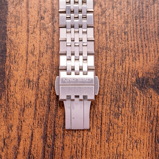 This watch is sold with its King Seiko box, swing tags, travel pouch and paperwork. The watch comes paired with its 20mm Seiko 7-link brushed and polished stainless steel bracelet secured by a signed push button release concealed deployant clasp; all links are provided, plus a 20mm Seiko leather strap secured by a King Seiko deployant clasp. The watch is from February 2023 and is sold in worn but fair condition, as you can see and comes with its Manufacturer's Warranty.