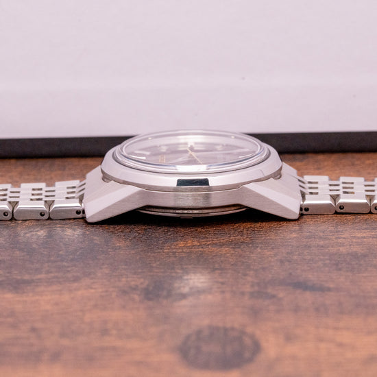 Here we have a 2023 King Seiko “Kameido-Kikko” Limited Edition SPB365J1, a modern re-creation of their 1965 King Seiko KSK, which is limited to 0925/1200 pieces, it was inspired by the birthplace of King Seiko Kameido, Tokyo, which was once an island shaped like a turtle shell. The 37mm stainless steel case has a multifaceted angular profile brushed and Zaratzu polished to a mirror finish, leading to thick flat-ended lugs and a lug-to-lug length of 43mm and a case thickness of 12mm, ensuring a comfortable fit on your wrist. On the right side is a signed crown with deep knurling for extra grip. The stepped polished and brushed smooth bezel holds a box-shaped sapphire crystal AR coated on the inside above a stunning dark brown gradient dial, textured in a repeating three-inset hexagonal pattern inspired by the shell of the divine native Japanese pond turtle; an outer minute track has applied steel baton indexes with faceted surfaces brushed and Zaratzu polished, that plays with the light as you rotate your wrist, elegant Dauphine hands sharp edges are Zaratzu polished for an incredible finish complemented by a gold-toned tapered sweeping second hand. At 12 o’clock, an applied gold-toned Seiko, and at 6 o'clock, “King Seiko Automatic '' printed to complete this striking modern re-creation. On the reverse, a screw-down case back with the embossed King Seiko shield in the centre and the details of the watch engraved around the edge, inside an automatic Seiko Cal. 6R31, 24 jewels, 21,600 beats per hour, this high-quality movement was introduced in 2021, and it has hand winding and hacking for your convenience. The watch comes paired with its 20mm Seiko 7-link brushed and polished stainless steel bracelet secured by a signed push button release concealed deployant clasp; all links are provided, plus a 20mm Seiko leather strap secured by a King Seiko deployant clasp and comes with its King Seiko presentation box, swing tags, travel pouch and paperwork.
