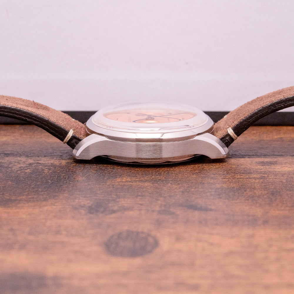 Here we have a 2023 Lebois & Co Heritage Chronograph Pulsation Salmon dial with a curvaceous polished and brushed 39mm stainless steel case that curves over your wrist with thick tapered lugs, inspired by their 1940s sector chronograph and developed through their community of collectors and enthusiasts called CoLAB. Brushed and polished surfaces transition with crisp lines, and a lug-to-lug length of 46.5mm and a case thickness of 14mm give the watch an impressive wrist presence. Down the right side, we have the chronograph pushers and a signed crown with deep knurling for extra grip. A bevel-edged smooth polished bezel holds a domed sapphire crystal AR coated on the inside above an attractive Salmon sector bicompax dial, an outer Gradue Pour 30 Pulsations scale surrounds a finely printed minute track, black-printed Arabic 12 and 6, metal pips and batons mark the hours, at 3 o’clock a recessed 30-minute register and at 9 o’clock a small seconds register, each with concentric circular pattern creating interest and dimension to the dial, elegant blued stick hands are complemented by a tapered blued chronograph hand. At 12 o’clock, we have the Lebois & Co motif, and at 6 o’clock, “Antimagnetique” completes this vintage-inspired bicompax chronograph. On the reverse, a screw-down exhibition case back showcasing a manually wound calibre LC-450, 24 jewels, beating at 28,800 beats per hour, adjusted in 5 positions for accuracy, this column-wheel chronograph is beautifully decorated with a blue column wheel, blued screws, Côtes de Genève and perlage, the movement is produced by Swiss Manufacture La Joux-Perret S.A. in La Chaux-de-Fonds. The watch comes paired with a 20mm quick-release vintage-style suede strap with a signed pin buckle, and the watch comes with its Lebois & Co presentation box, travel case, swing bar removable tool and paperwork.