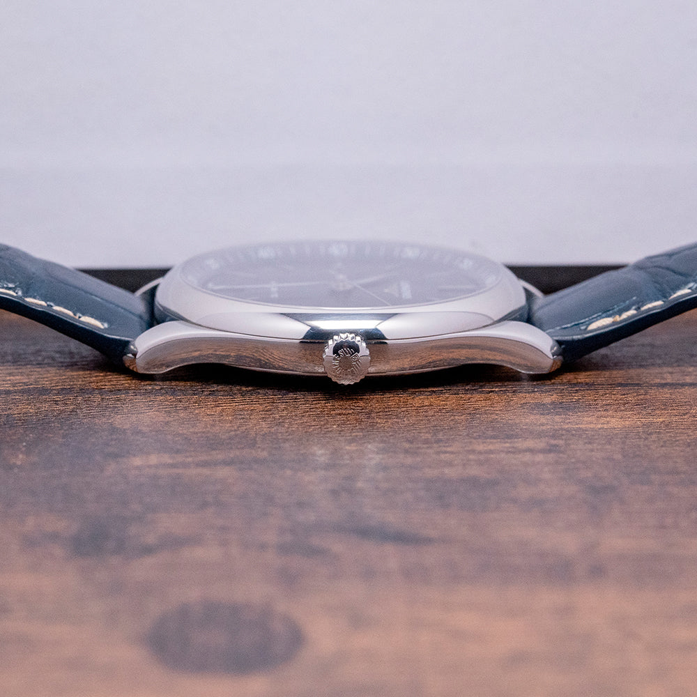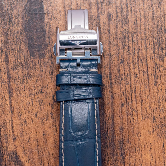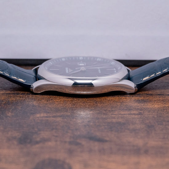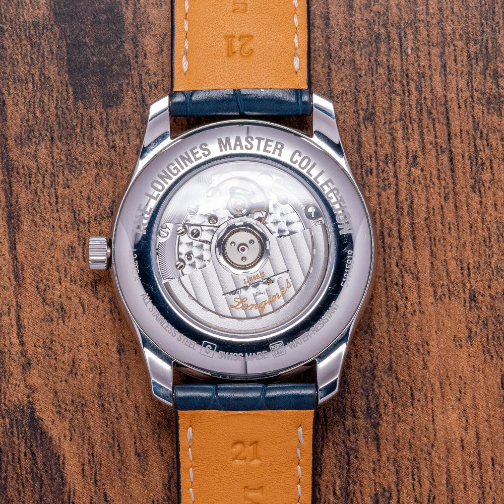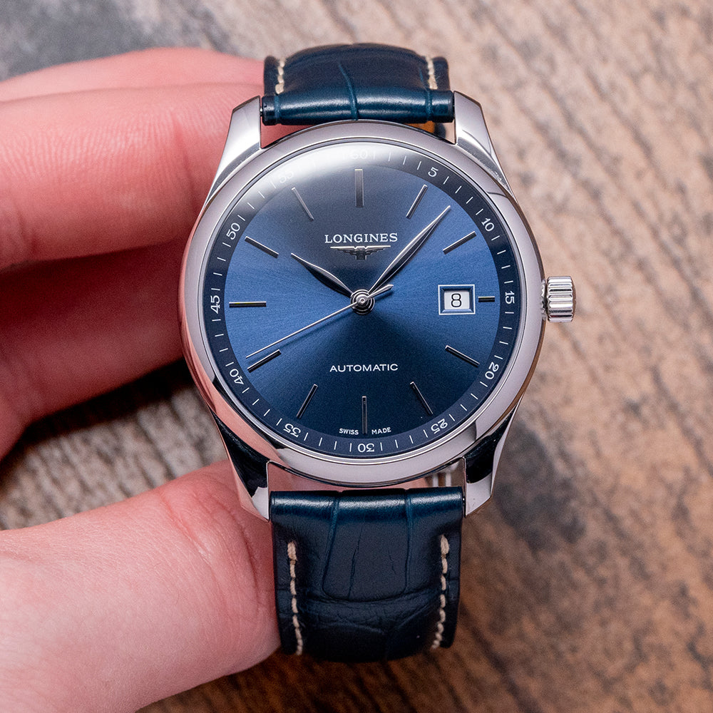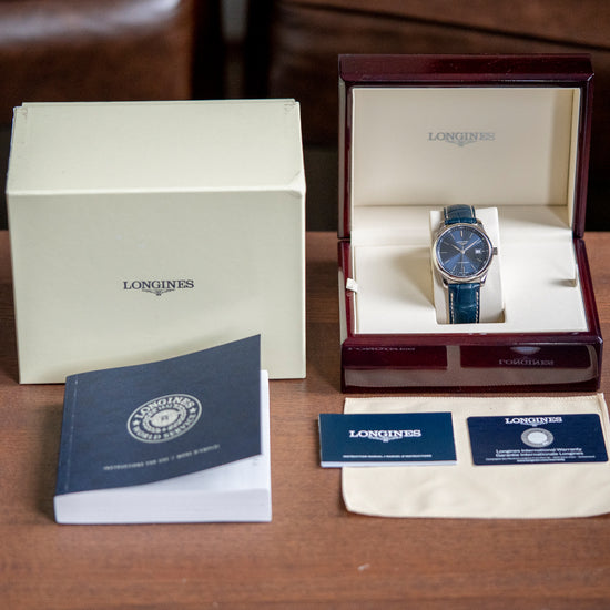 Here we have a 2023 Longines Master Collection Blue L2.793.4.92.0 part of their Master Collection; its polished 40mm stainless steel case curves over your wrist with tapered lugs and a lug-to-lug length of 46.5mm and a case thickness of just 9.5mm, ensuring a comfortable fit. On the right side is a signed crown, the smooth polished bezel holding a sapphire crystal above a stunning sunburst blue dial. A sloping outer minute chapter ring has small Arabic numerals surrounding thin polished applied batons marking the hours, at 3 o’clock, a framed date window and in the centre elegant leaf hands complemented by a tapered sweeping second hand complete with tear drop counterweight, perfectly balancing this charismatic dress watch. On the reverse is a screw-down exhibition case with the details of the watch etched around its edge inside an automatic Longines Cal. L888.3, 21 jewels, beating at 25,200 beats per hour, based on the ETA 2892-A2. The watch has a 20mm Longines black leather strap with a signed push-button deployment clasp. This watch is sold with its original Longines box and paperwork.