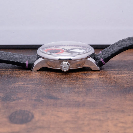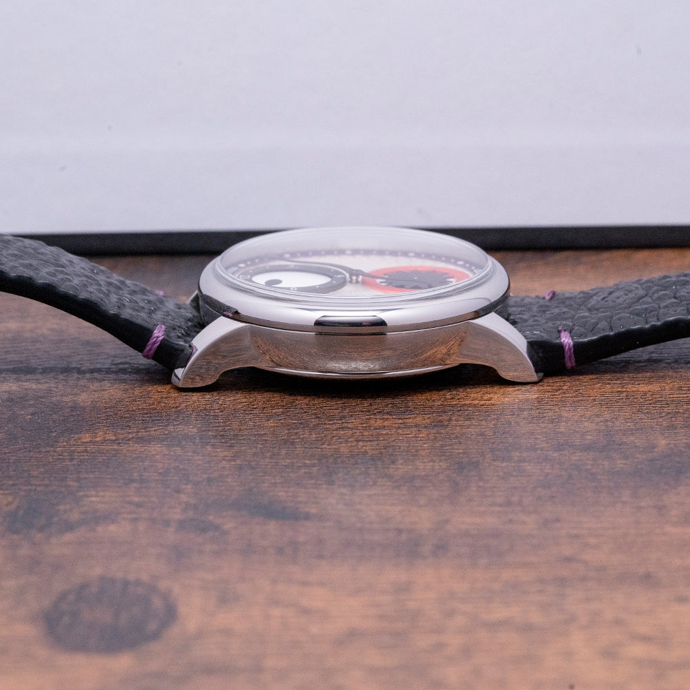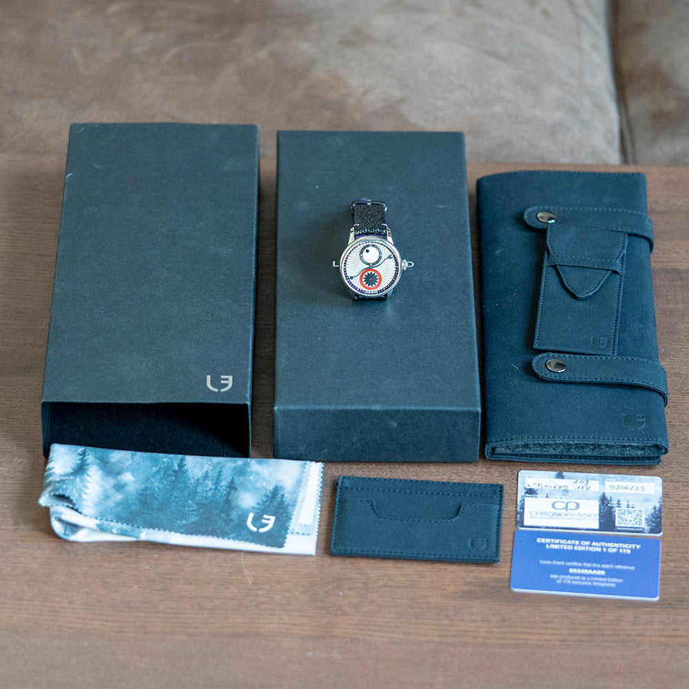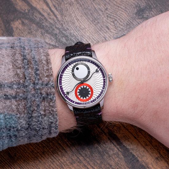 Here we have a 2023 Louis Erard x Konstantin Chaykin limited to 178 pieces; two horology houses have come together to create a unique blend of abstract design and function in their collaboration. The 39mm polished stainless steel case curves over your wrist with long straight lugs, and a lug-to-lug length of 45mm and a case thickness of 13mm ensure a comfortable fit. On the right side is the signature Chaykin signed crown with knurling for extra grip. The polished smooth bezel holds a domed sapphire crystal AR coated on both sides above a distinctive monster dial. Konstantin Chaykin has given the Louis Erard Le Régulateur watch a unique touch by taking inspiration from Slavic folklore, in this folklore, there is a mythical creature known as Likho, which is believed to bring bad luck and misfortune, Likho is portrayed as a one-eyed monster. The silver dial boasts a captivating sunray wave pattern, with a purple outer minute track framing a satin-brushed anthracite hour sub-dial at 12 o'clock, the hour ring features white numerals and a large rotating black dot for the hour hand on a white background that resembles the Cyclops' eye. At 6 o'clock, a shiny red sub-dial with a white background and a rotating matte black star-shaped second hand represents the monster's roaring mouth. A black stylized minute hand, resembling a serpent, arrow or middle finger depending on how you see it, precisely highlights the minutes. The Konstantin Chaykin logo is located at 12 o'clock, while the Louis Erard logo completes this inspiring collaborative timepiece at 6 o'clock. On the reverse a screw-down exhibition case back showcasing the automatic Sellita SW 266-1, 31 jewels, beating at 28,800 beats per hour, the élaboré grade movement has a Louis Erard-modified rotor. The watch comes paired with a 20mm black toad leather strap, purple-dyed rabbit leather lining and a polished steel pin buckle and the watch comes with its Louis Erard presentation box, travel pouch and paperwork.