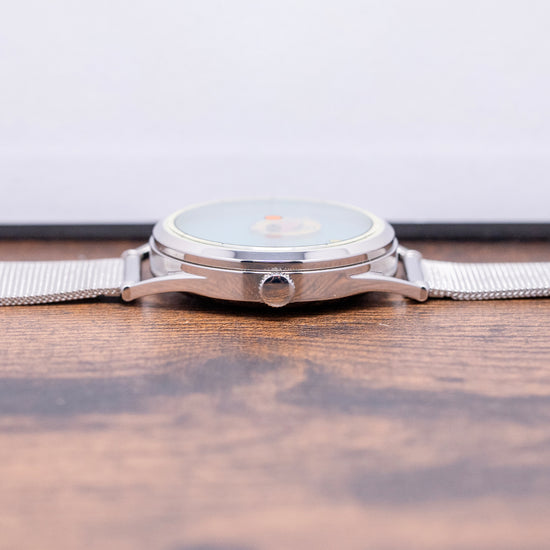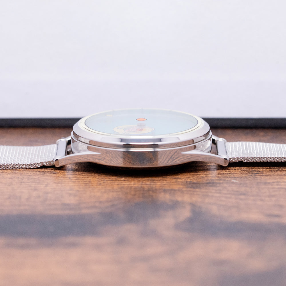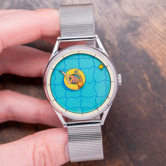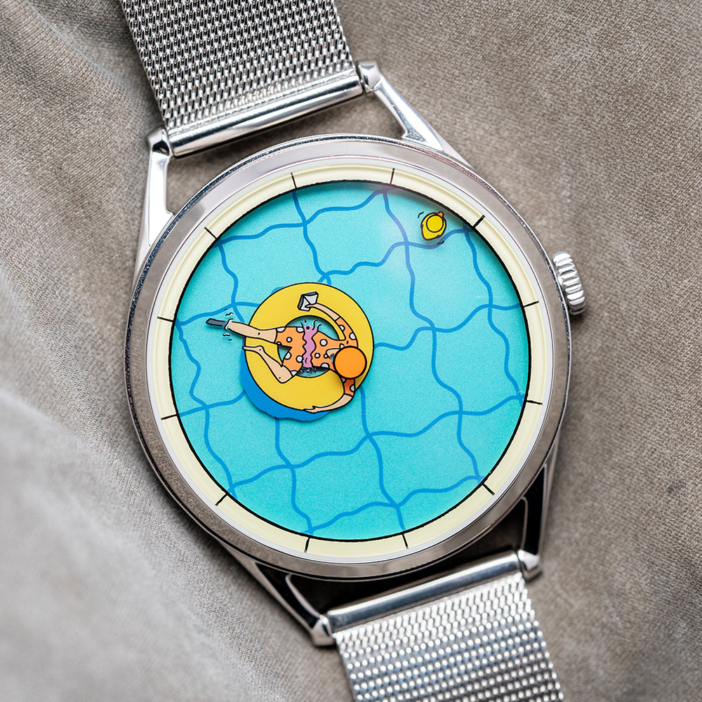 Here we have the fun and quirky 2023 Mr Jones 'A Perfectly Useless Afternoon' Mechanical designed by Kristof Devos to serve as a reminder to take a relaxed approach to time and to appreciate moments of leisure. The character lounging in the pool is intended to convey the importance of rest and the value of time spent in relaxation. Featuring a polished stainless steel case that comfortably sits on your wrist with fine, angled lugs. Its slim polished flanks lead to a lug-to-lug length of 49mm and a case thickness of 10.5mm. On the right side, a coin-edged crown. A polished, smooth, slender bezel holds a sapphire crystal above a funky pool-designed dial. An outer ring of tiles marks the hours surrounding a blue, wavy reflection of the pool bottom. The relaxing figure on the inflatable ring features an outstretched leg, which is the hour hand, and the small yellow rubber duck floats around the edge, indicating the minutes. On the reverse, a mineral crystal exhibition screw-down case back printed with 'A Perfectly Useless Afternoon' designed by Kristof Devos. Inside an automatic Sellita Cal. SW200, 26 jewels, beating at 28,800 beats per hour, this workhorse movement features hand-winding and hacking seconds for your convenience. It comes paired with its Mr Jones quick-release 18mm mesh-style stainless steel adjustable bracelet, secured by a gliding clasp. The watch comes with its Mr Jones Watch presentation box and paperwork.
