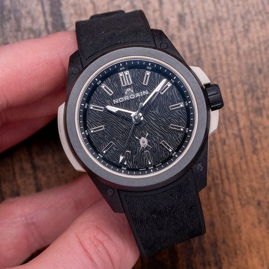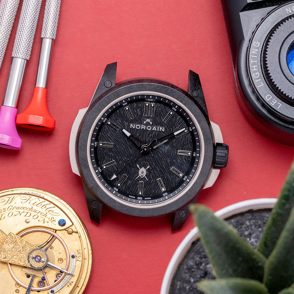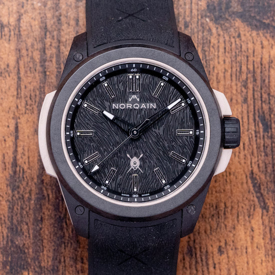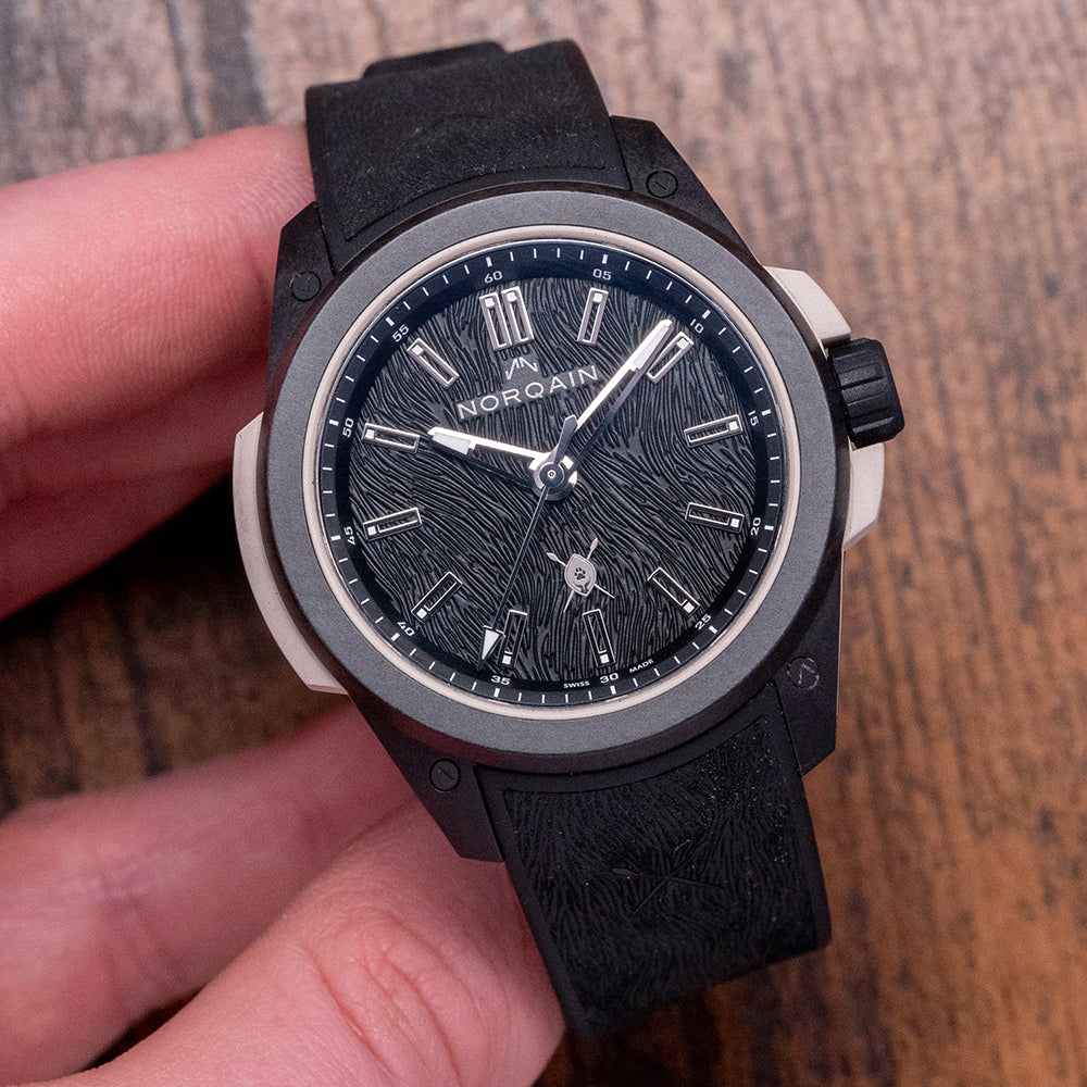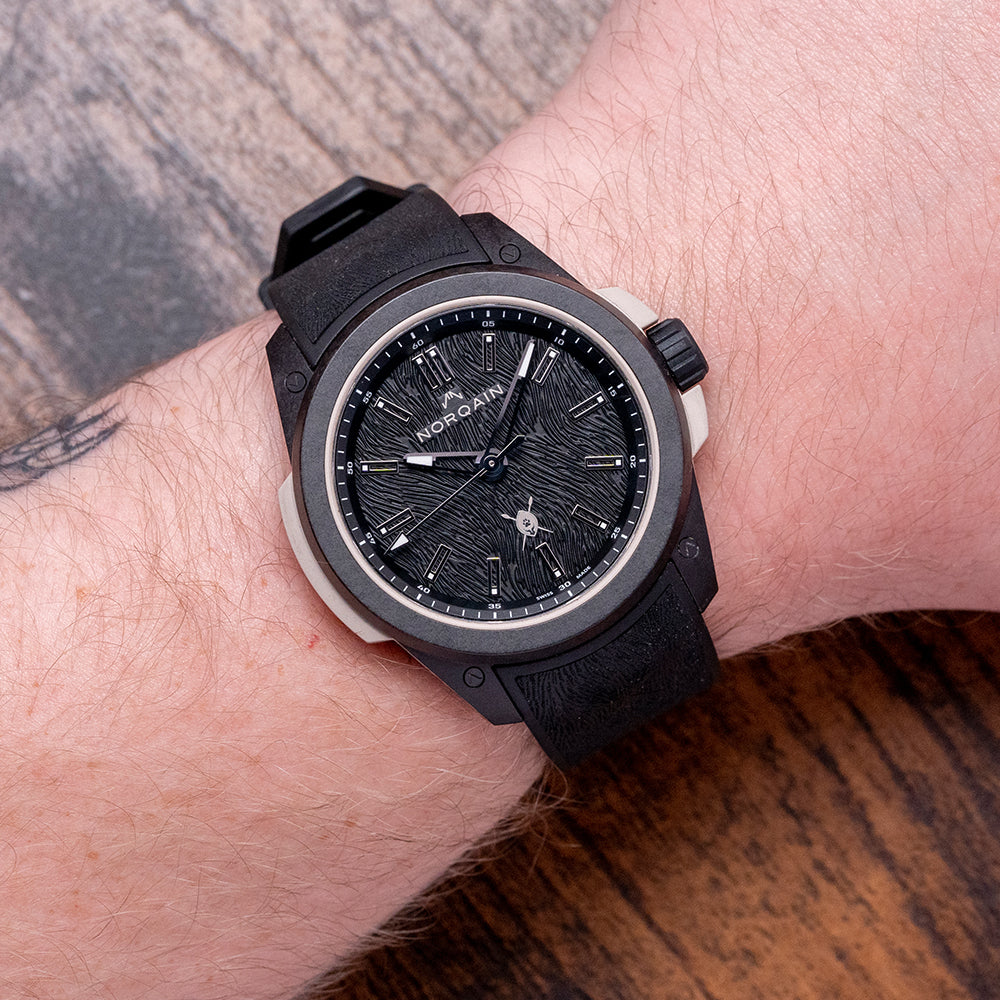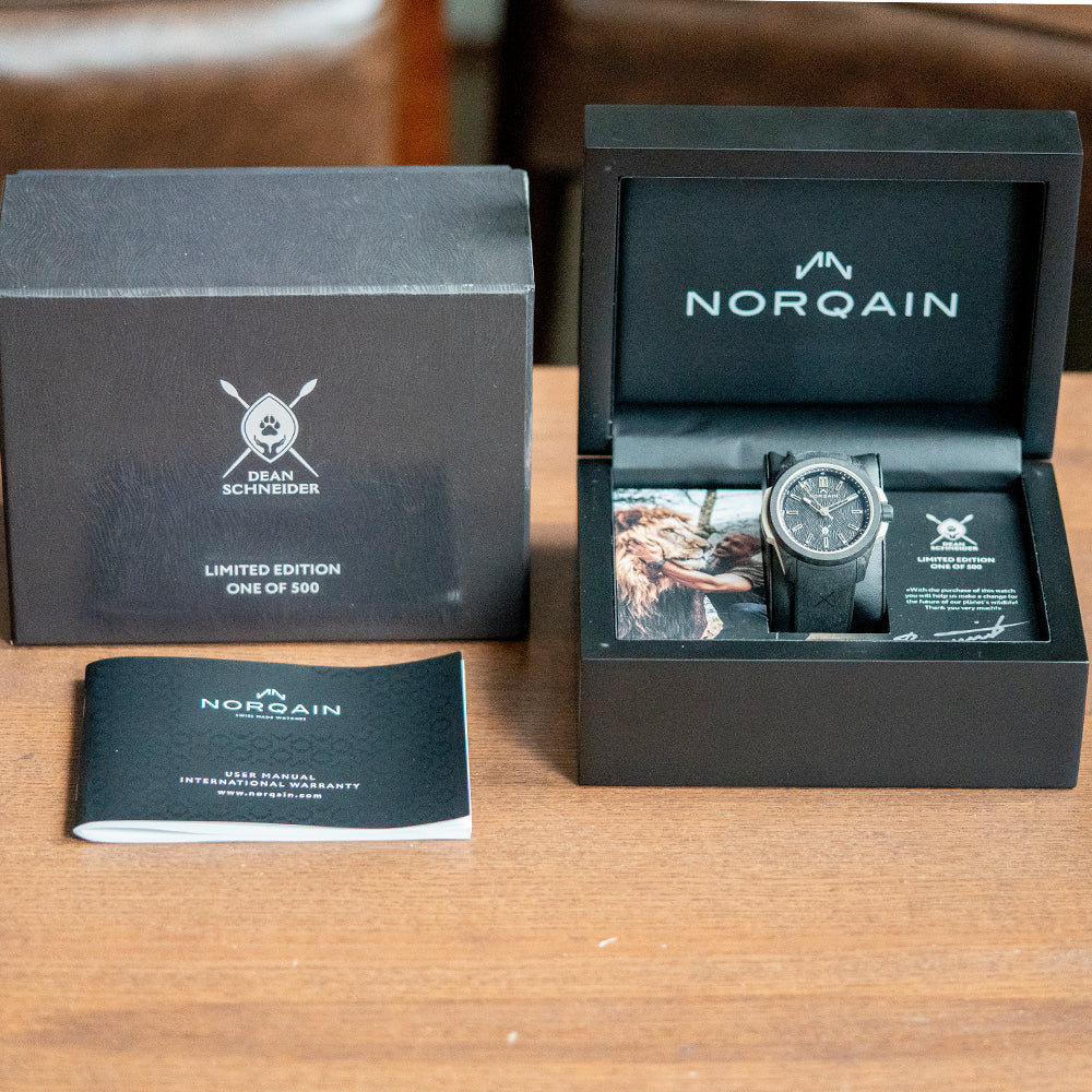 Here we have a special 2023 Norqain Wild ONE Hakuna Mipaka Limited Edition, One of 500 pieces, made to celebrate the successful partnership with wildlife Ambassador Dean Schneider, who runs the Hakuna Mipaka Oasis in South Africa, a place for rescued wild animal rehabilitation. The 42mm case is made of several components: a robust, lightweight proprietary black NORTEQ material cage outer layer secured with screws, a sand-coloured rubber shock absorber inner layer made with the sand from Hakuna Mipaka and a sandblasted Titanium container holding the movement and protected by the rubber shock absorber. A lug-to-lug length of 49mm and a case thickness of 12.5mm give the watch an impressive wrist presence. On the right side, a signed rubber-coated screw-down crown with deep knurling is protected by rubber crown guards. The smooth bezel holds a double domed sapphire crystal AR coated above a black stamped Lion fur textured dial, an outer minute chapter ring surrounds applied flat diamond cut skeletonised baton indexes tipped with Super-LumiNova X1 marking the hours, faceted skeletonised diamond cut minute and hour hands tipped with Super-LumiNova X1 are complemented an arrow pointed second hand, at 12 o’clock we have the Norqain motif and at 6 o’clock and applied Hakuna Mipaka logo. On the reverse a sapphire exhibition case back engraved with the details of the watch, “We need to learn to love them exactly the way they are and not the way we wish them to be!“ a poignant quote from Dean Schneider and printed Hakuna Mipaka logo “One of 500” in the centre, inside an automatic Norqain NN20/1 by Kenissi, 27 jewels, beating at 28,800 beats per hour, COSC Certified, fitted with the skeletonised Norqain signed rotor has the golden mirrored “N” logo applied to it. Kenissi is named after the ancient Greek Kenesis meaning movement, owned by Tudor, who in 2016 decided to develop and manufacture their own self-winding calibre under the name Kenissi, launching the first in collaboration with Breitling and later with Chanel; they are produced and developed in their factory in Le Locle Switzerland. The watch comes paired with its 22mm integrated black rubber strap with a Hakuna Mipaka pattern, and Norteq pin buckle, and the watch comes with its Norqain presentation box and paperwork.