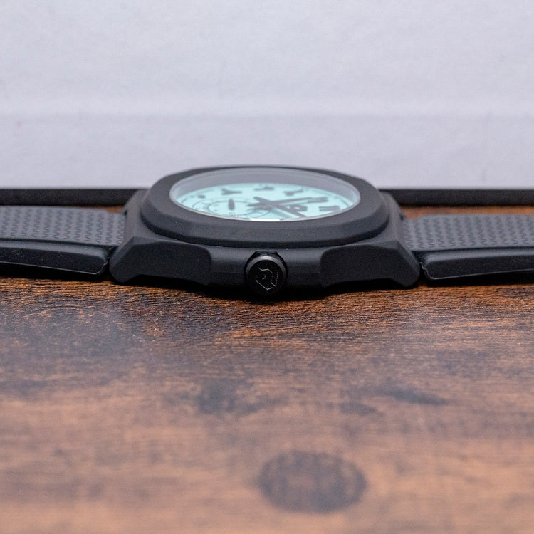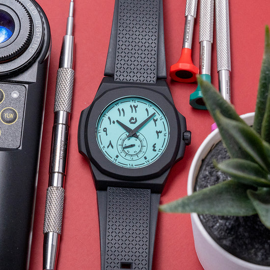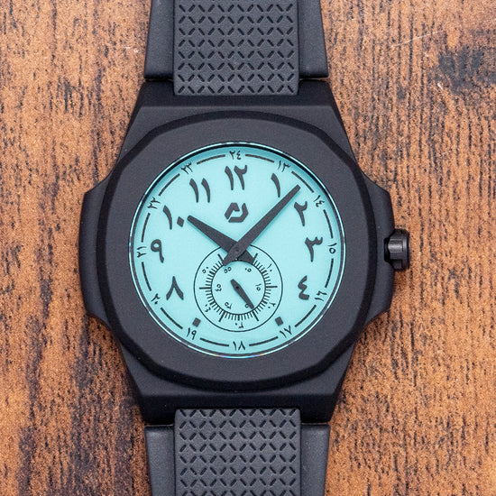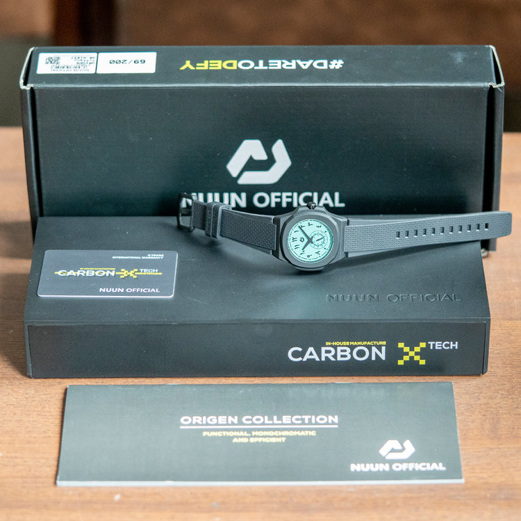 Here we have a 2023 Nuun Official Origen N1837 'Tiffany' limited 69/200 pieces with a 40.5mm Carbon X Tech Black tonneau-shaped case that curves over your wrist comfortably thanks to the fitted black rubber strap. Its case is inspired by the iconic Philippe Patek, Nautilus combines carbon fibre and polycarbonate, which is often used in high-performance industries like aerospace and automotive racing. The sculpted flanks lead to a lug-to-lug length of 47mm and a case thickness of 10.5mm, giving the watch an impressive wrist presence. On the right side is a signed crown with deep knurling protected by crown guards. The stepped octagonal bezel holds a K1 AR coated crystal above a striking sandblast textured “Tiffany” coloured dial. An outer minute track, hourly markers, and a 60-second sub-dial at 6 o’clock are in Arabic calligraphy. Thick black hands sit majestically in the centre, and at 12 o’clock, the Nuun Official motif completes this distinctive sports watch. On the reverse, a screwed-down 316L steel black PVD coated case back with the details of the watch and a limited number in “Tiffany” coloured text. Inside a Quartz Miyota Cal. 1L40 movement. It is paired with a 17mm black fitted rubber strap and black PVD-coated hardware. This watch is sold with its original Nuun Official box and paperwork.