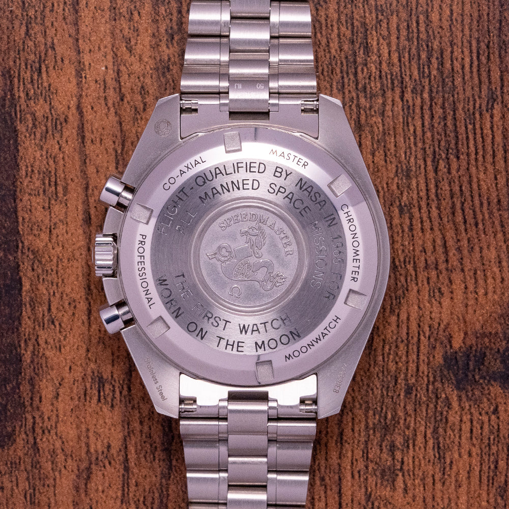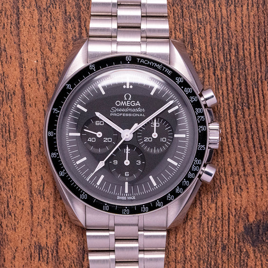 Here we have a 2023 Omega Speedmaster Professional Hesalite Cal. 3861, the 42mm stainless steel case has polished and brushed surfaces that lead to twisted tapering lugs, the crisp lines transition effortlessly around the case, and a lug-to-lug length of 47mm and a case thickness of 14mm ensure a comfortable fit on the wrist. Omega has used modern tomography technology to achieve the exact dimensions of the 4th generation Speedmaster case as worn by the Apollo 11 Astronauts. Down the right side, we have the pushers and signed crown protected by crown guards that continue the flow of the asymmetrical case. A fixed tachymeter sits on its black bezel with an iconic “dot” over the ninety, the stepped dial adds depth and interest and is protected by a Hesalite crystal. An outer minute track with slim baton indexes marking the hours, 3 recessed Sub-dials consist of 60 seconds, 30 minutes, and 12 hours. Luminance filled Sword's hands and an elegant long central teardrop tipped chronograph seconds hand accurately hits the minute track, the dial has perfect symmetry, form and function. The screw-down case back is engraved with “Flight - Qualified By NASA in 1965 for all Manned Space Missions” and “The First watch worn on the Moon” a fitting testament to man's achievements in space. Around its outer edge, we have the “Professional Moonwatch Co-Axial Master Chronometer.” The embossed Hippocampus in the centre represents Neptune the God of the sea, it was conceived by Pierre Borie after seeing a picture of Neptune riding a chariot pulled by seahorses, it is the reason why the seahorses are wearing a bridle. Inside a manually wound Omega Master Chronometer Calibre 3861 featuring a CO-Axial and column-wheel, COSC-certified 26 jewels, 21,600 beats per hour, METAS (Federal Institute of Metrology) also certified this special movement with additional measurements of precision, performance, and anti-magnetic resistance. The continued commitment by Omega to push the envelope of a watch and its movement means it is still the only flight-qualified watch that meets the requirements for EVA (Extravehicular activity) – outperforming quartz watches, with LCD displays, which are vulnerable to temperature changes, and literally, get destroyed when on spacewalks. The watch comes fitted on its Omega 20mm brushed stainless steel 5-link bracelet which tapers to 15mm with a signed push button release newly designed milled clasp and the watch also comes with its Omega presentation box and paperwork.
