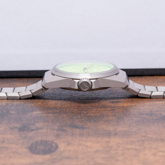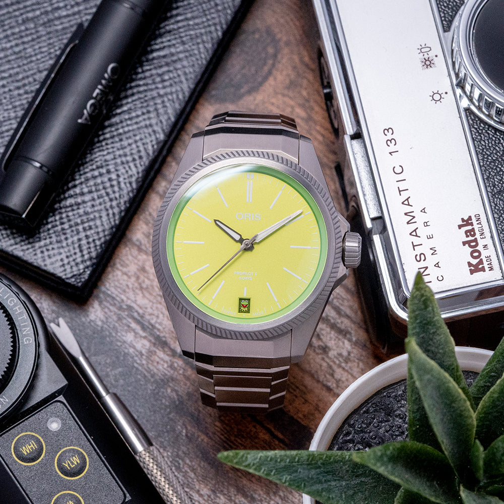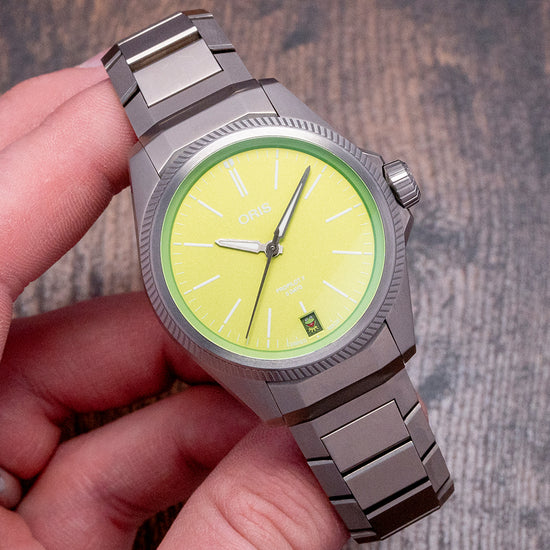 The Oris Kermit! A watch that reminds us to smile on the 1st of every month by presenting us with Kermit's big grin at 6 o'clock for the date, what is there not to love about that? The colour of this dial is near impossible to capture as it has the most incredible hue of green, bordering on fluorescent yellow, I have ever seen used on a watch, though I would say that is to be expected with the fact this is the Oris Kermit ProPilot X! Don't hesitate to book an appointment to see this watch for yourself in the titanium!