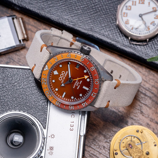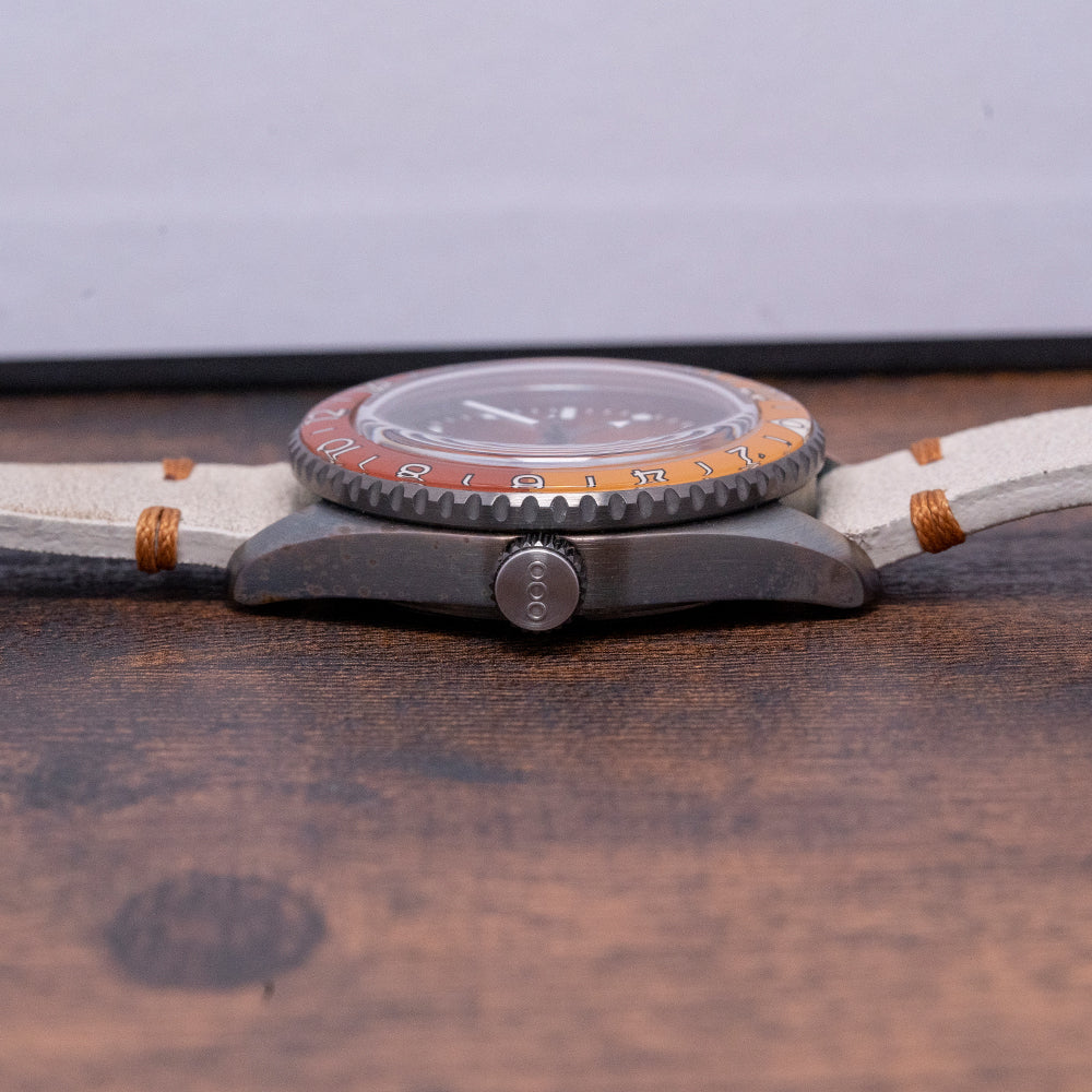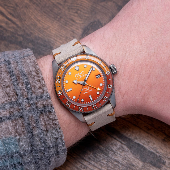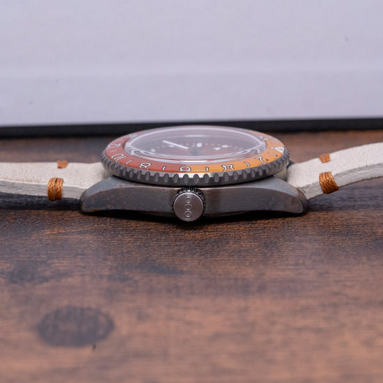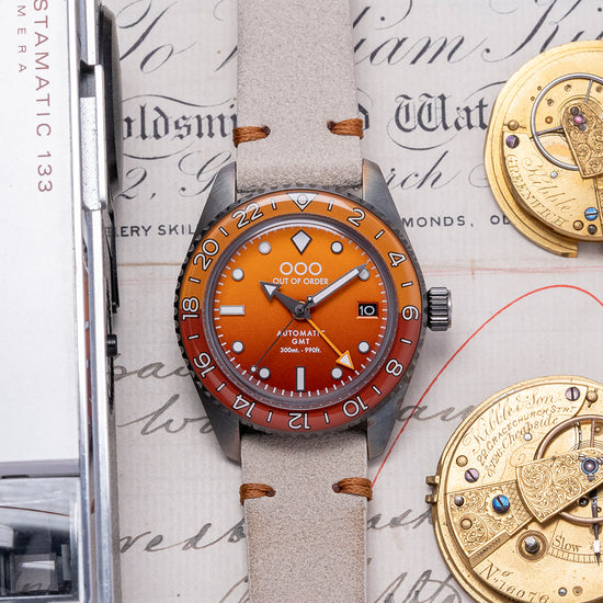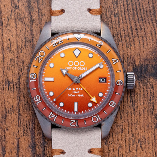 Here we have a 2023 Out Of Order "Scotch on the Rocks" Limited Edition of 50 pieces, inspired by the rich tones of Scotch and ice hence the model's name, made in collaboration with Barbara Palumbo. The 40mm 316L stainless steel case has been aged by their patented OOO process, for a unique aesthetic, curving over your wrist with tapered lugs, and a lug-to-lug length of 48mm and a case thickness of 13mm give the watch an impressive wrist presence. On the right side is a signed screw-down crown that has a dark IP GUN treatment. The 60-click bidirectional bezel has deep knurling that is aged by their patented OOO process, a domed sapphire 24-hour insert has an attractive honey gold and caramel colour with Superluminova coated numerals. A domed sapphire crystal AR coated sits above a graduated honey gold and caramel matte dial. An outer minute track surrounds applied disc and baton indexes filled with Superluminova marking the hours, at 3 o’clock a date window, brushed IP Gun arrow, and baton hands are complemented by an orange GMT hand and a brushed IP Gun sweeping lollipop second-hand, at 12 o’clock we have the Out of Order motif and at 6 o’clock “ Automatic GMT 300 mt.- 990 ft'' complete this distinctive uniquely aged travel companion. On the reverse a screw-down case back with the details of the watch and an embossed “Scotch on the Rocks ', inside an automatic Seiko Cal. NH34A, 24 jewels beating at 21,600 beats per hour, this movement was released in 2022 and has a bidirectional rotor, hand winding, and hacking seconds. The watch comes paired with its white 20mm vegetable-tanned cowhide and a pin buckle aged by their patented OOO process, and the watch comes with its Out of Order presentation box (Shaker) and a card.