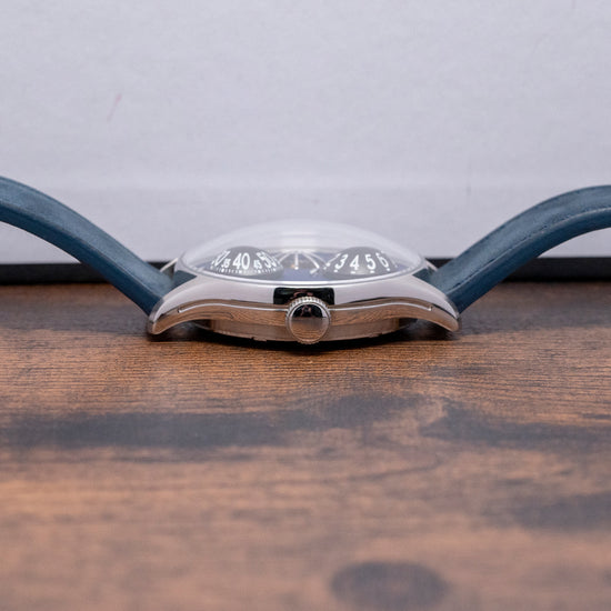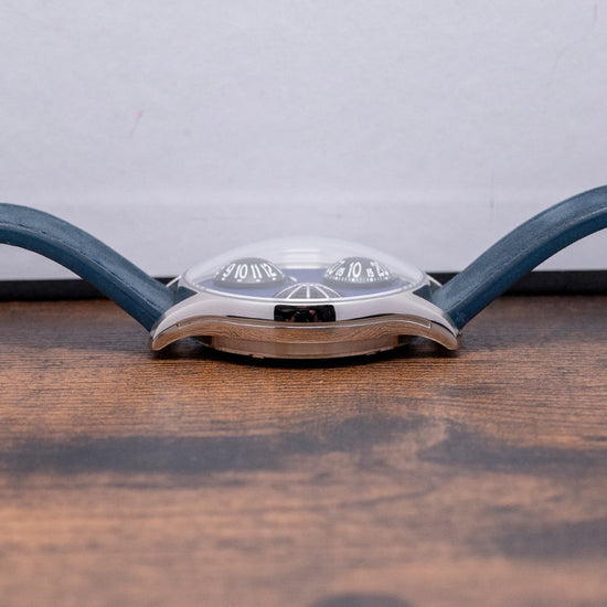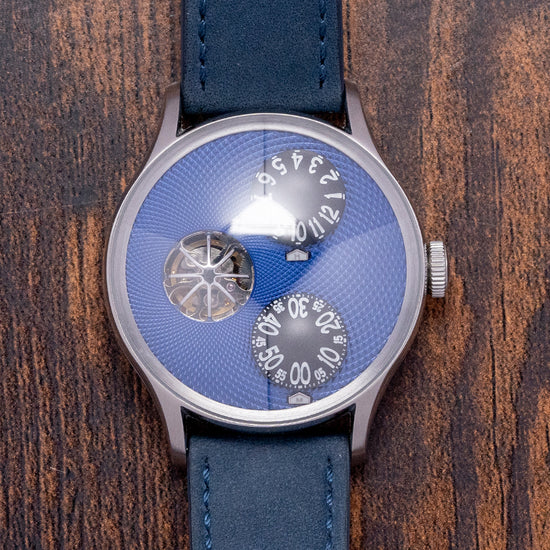 Here we have a 2023 Radcliffe Le Dome Blue Guilloche Dial Automatic Limited 0091/1000 pieces, inspired by the Legacy Machine 101 by MB&F, released in 2014. Its 40mm brushed and polished 316L stainless steel round case curves over your wrist with tapered lugs. The curved engraved detailing along the polished flanks leads the eye towards the lug-to-lug length of 48mm and a case thickness of 16mm, giving the watch a striking profile. On the right side, there is a coin-edged crown. The double-domed sapphire crystal, AR-coated, showcases the stunning blue guilloché dial. Three domed CNC machined 3D sub-dials represent the hours, minutes, and open balance wheel; each dome has BGW9 SuperLumiNova coated numerals. A raised “H” and “M” indicator is coated in C3 SuperLumiNova for that perfect night glow. On the reverse a polished screw-down exhibition case back with the details of the watch around its edge. Inside an automatic Modified Seiko Cal. NH38 with a signed Guilloché patterned rotor. It comes paired with two 22mm leather straps and pin buckles. This watch is sold with its original RADCLIFFe Box, travel pouch and booklet.