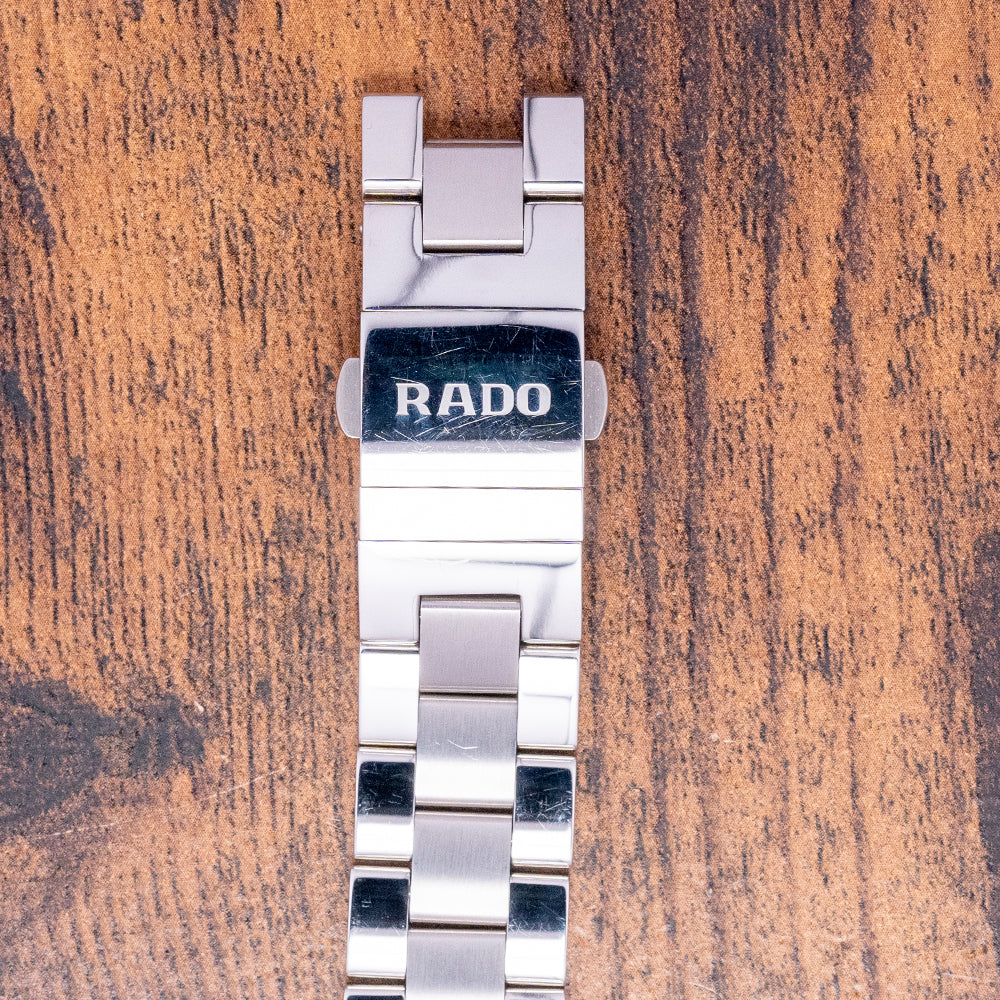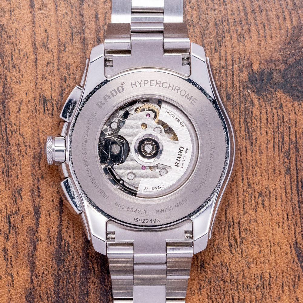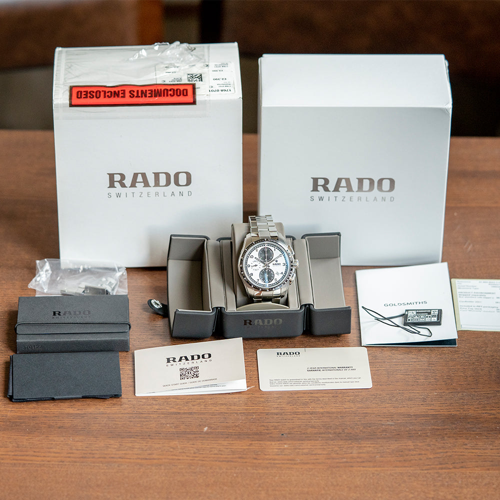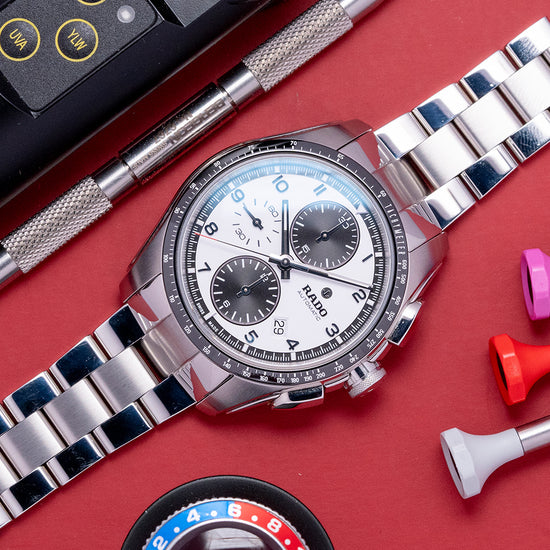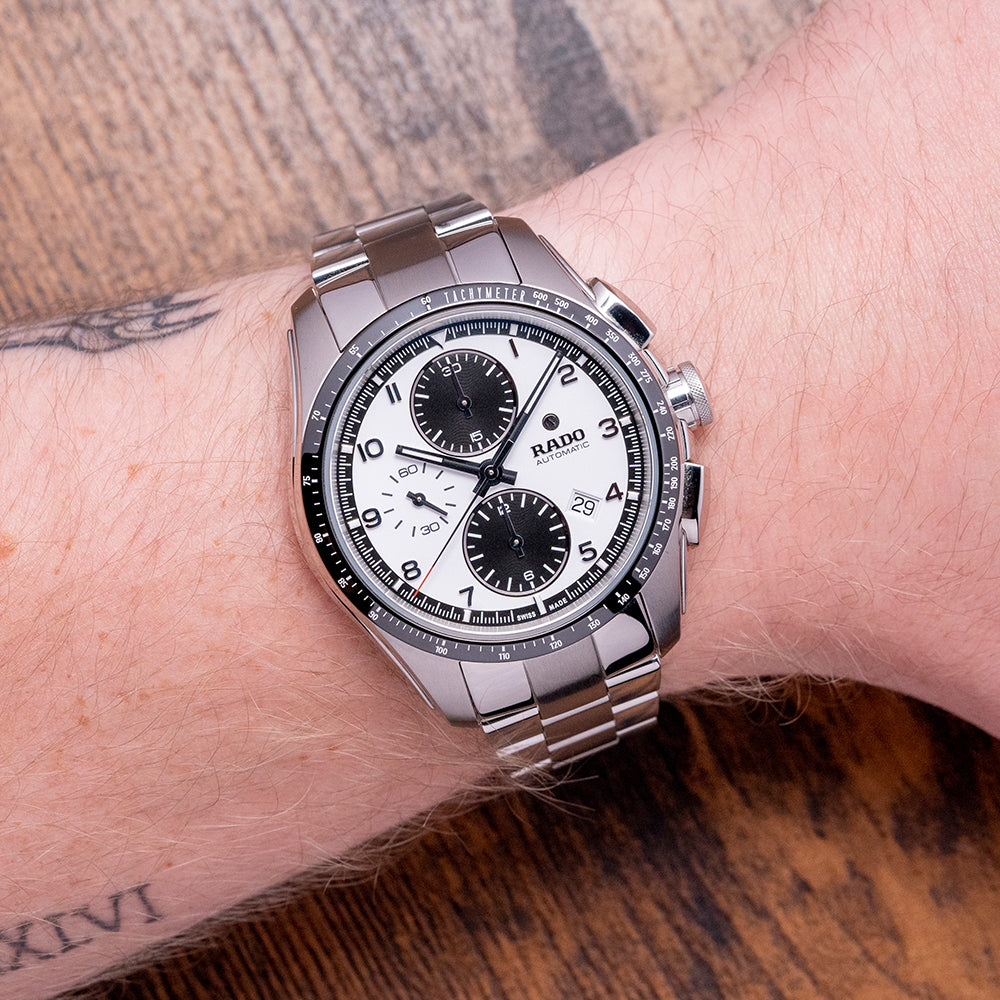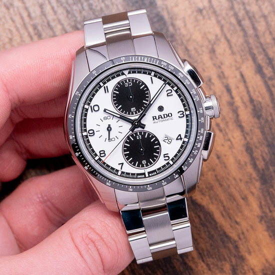 Here is a 2023 Rado HyperChrome Chronograph "Panda" 44mm R32042103. The HyperChrome collection combines polished and brushed stainless steel, Titanium, and High-Tech Grey Ceramic for an attractive, contemporary sporty aesthetic. At 44mm, the case curves over your wrist towards the tapered lugs for a comfortable fit, polished and brushed surfaces transition with crisp edges, leading to a lug-to-lug length of 51.5mm and a case thickness of 15mm, giving the watch an impressive wrist presence. On the right side, we have a raised polished section with polished chronograph pushers that effortlessly flow with the case's contours, as well as a recessed signed crown with deep knurling and hobnail texturing for grip. The left side of the case has a matching raised polished section, which keeps the case symmetrical. The fixed bezel is made of scratch-resistant ceramic with a tachymeter scale, and a domed sapphire crystal AR coated sits above a dynamic white and black “Panda” dial. A black outer minute chapter ring is precisely executed with SuperLumiNova plots at the hour, and polished Arabic indexes are applied to mark the hours, creating depth and a pleasing shimmer when you rotate your wrist. At noon, we have a black 30-minute register; at 6 o’clock, a black 12-hour register, each has a polished ring and is slightly recessed; and finally, at 9 o’clock, a small seconds. Between the four and five, there is a colour-matched date window. Slender baton hands are polished and filled with SuperLumiNova, complemented by a tapered chronograph hand with a red tip. At 3 o’clock, we have the rotating red Rado motif anchor with “Automatic” printed underneath, completing this dynamic Panda dial sports chronograph. On the reverse, we have a screw-down exhibition case back with the watch details around the edge, inside an automatic Rado 603.6042.3, 26 jewels, signed rotor and nicely decorated in Côtes de Genève. The watch comes paired with its 21mm polished and brushed stainless steel bracelet secured by a signed Titanium push-button clasp and comes with its Rado presentation box, swing tag and paperwork.