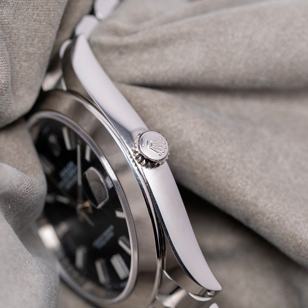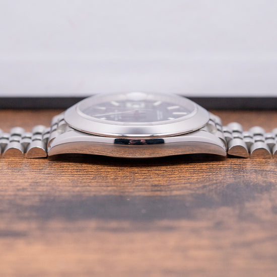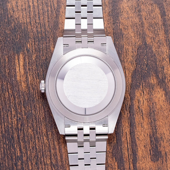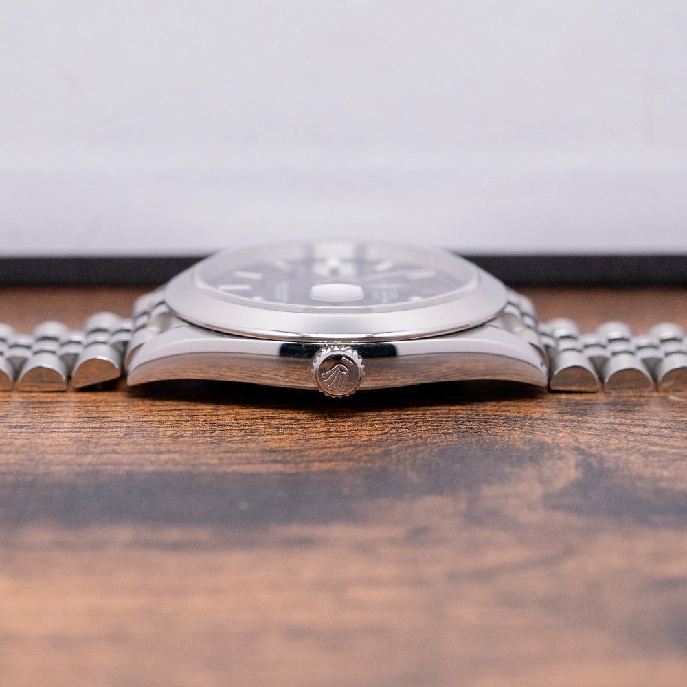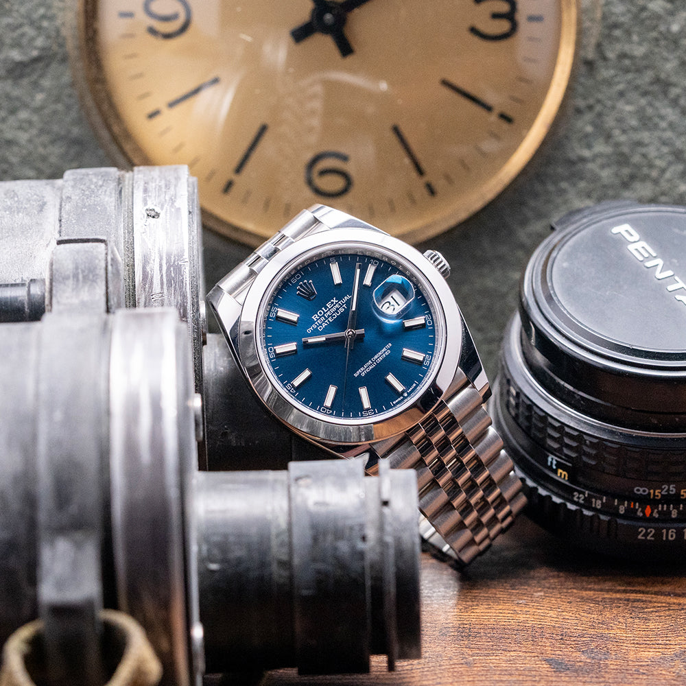 Here we have a 2023 Rolex Datejust Blue Smooth/Jubilee 126300, featuring a polished and brushed, curvaceous 41mm Oystersteel case that curves over your wrist with finely tapered lugs. The use of Oystersteel, which belongs to the 904L family, makes the case more resilient to corrosion and highly durable. A lug-to-lug length of 47mm and a case thickness of 11.5mm give the watch an impressive and comfortable fit. On the right side is a signed screw-down Twin-lock crown, and a White Gold smooth bezel holds a sapphire crystal above a stunning sunburst blue dial, created using Physical Vapour Deposition (PVD) or electroplating coated in lacquer for that perfect finish. An outer Rolex rehaut surrounds the minute track with applied baton indexes filled with Chromalight, marking the hours. At 3 o’clock, a date window with cyclops magnification. Slender baton hands have Chromalight infill and are complemented by a tapered sweeping second hand. At 12 o’clock, we have the applied Rolex Crown Rolex “Oyster Perpetual DateJust” printed underneath, and at 6 o’clock “, Superlative Chronometer Officially Certified” completes this distinctive, versatile timepiece. On the reverse, a coin-edged case back, inside an automatic Rolex Cal. 3235, 31 jewels, 28,800 beats per hour, bidirectional rotor, hacking seconds, quick-set date, Paramagnetic blue Parachrom hairspring, COSC-Certified high-precision movement, was launched at Baselworld in 2017. It comes paired with its original 21mm Rolex 904L Oystersteel Jubilee bracelet, featuring a signed Oysterclasp and Easylink 5mm extension; all links are provided. The watch also comes with its Rolex presentation box, swing tags and papers.
