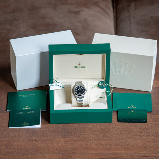 Here we have a 2023 Rolex Explorer 1 124270 Box & Papers that has a 36mm Oyster case made of Oystersteel, the use of Oystersteel which belongs to the 904L family makes the case more resilient to corrosion and highly durable. The Rolex Explorer came about after 20 years of development in extreme environments, starting back in the 1930s, the goal of the watch was to create the perfect mountaineer's tool, keeping the perfect time at -50°C (-58°F) with 70% less oxygen than at sea level. A lug-to-lug length of 43mm and a thickness of 11.5mm ensures a comfortable fit on your wrist, on the right side, is a Twinlock double sealing system for the screw-down crown. A smooth highly polished bezel holds a flat scratch-resistant sapphire crystal above a black dial, the applied highly legible 3, 6, and 9 have an infill of blue luminescence, and the applied baton indexes have the same infill and the text is precisely printed with the Rolex crown at 12. On the reverse, a coin-edged screw-down case back, inside we have the Rolex Cal. 3230 considered a very accurate automatic movement with Chronometer Certification of -2/+2 seconds a day, 31 jewels and beating at 28,800 BPH. The use of a Paramagnetic blue Parachrom hairspring for its speed, it’s 10 times more accurate in case of shocks, resistant to extreme temperatures and unaffected by magnetic fields and gravity. The 904L Stainless Steel Oyster bracelet has the Oysterlock safety clasp with Easylink micro-adjustments up to 5mm extension, all links provided and the watch comes with its Rolex presentation box, swing tag and paperwork.