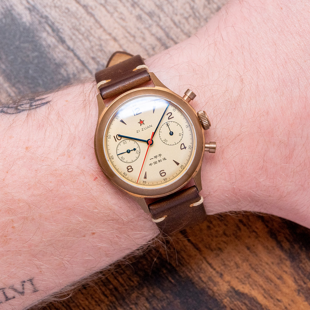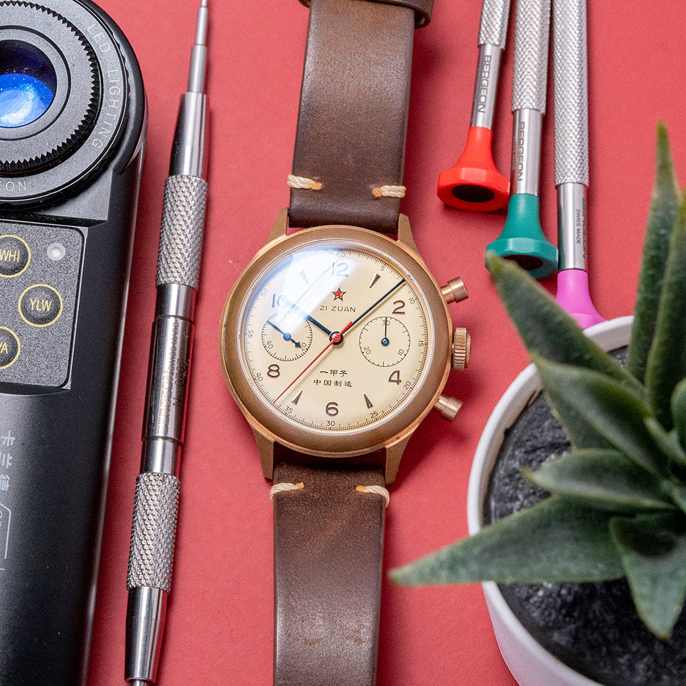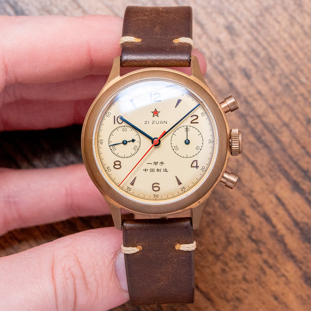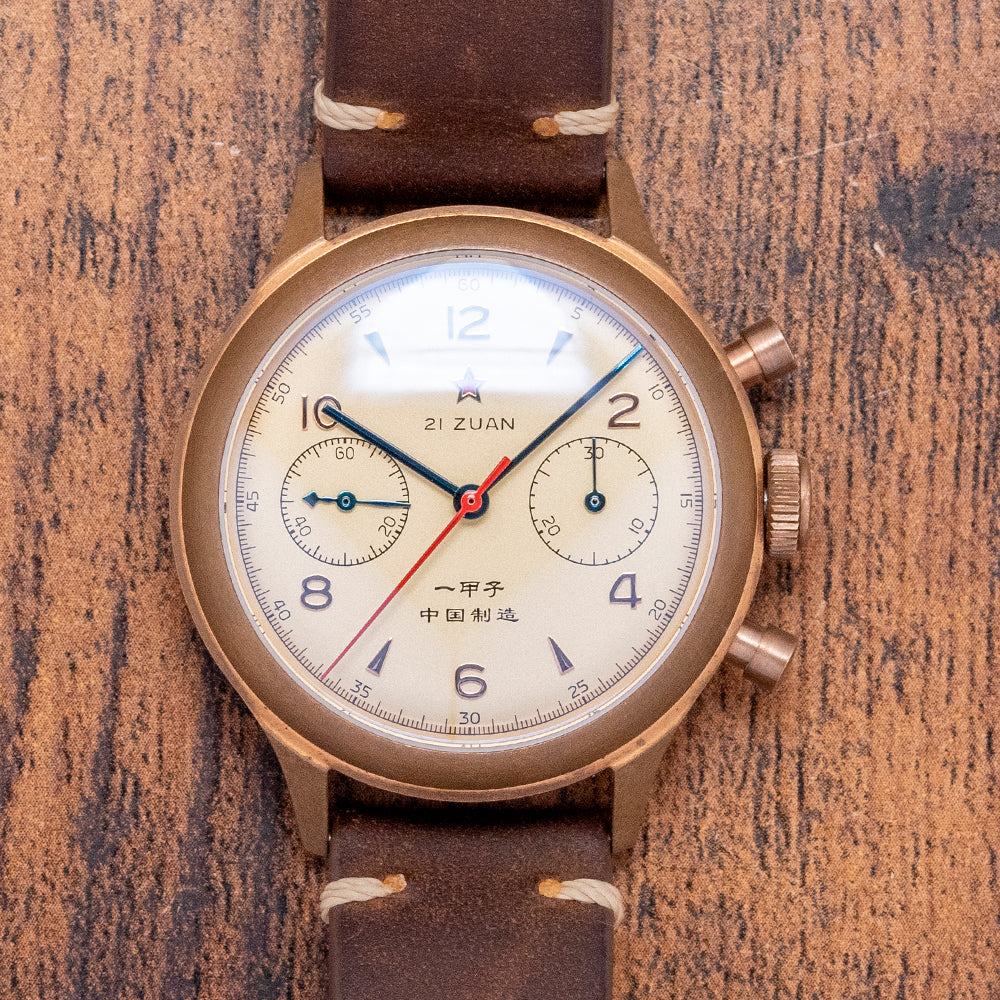 Here is a special 2023 Seagull 1963 60th Anniversary Bronze Limited 201/750 pieces. A 38mm Bronze round case curves over your wrist with tapered lugs leading to a lug-to-lug length of 44.5mm and a thickness of 13mm, ensuring a comfortable fit on your wrist. On the right side, chronograph pushers and a push/pull crown in the centre. A fine domed bezel holds a domed sapphire crystal. The cream dial has a minute track surrounding applied Arabic numerals and alternating arrow indexes marking the hours. The red star at 12 gives this model its vintage aesthetic. At 3 o’clock, a 30-minute register; at 9 o'clock, the continuous 60 seconds. Thin-blued hands with a red chronograph hand add a vintage vibe. At 6 o’clock, the Chinese text, when translated into English, "made in China". On the reverse, an exhibition case back, inside a manually wound Seagull ST-19, 19 jewels, 21,600 beats per hour. Tianjin bought the Cal. 175 machinery and designs from Venus and then decided to upgrade the original 17-jewel movement to this 19-jewel ST19 movement. It comes paired with an 18mm vintage-style leather strap and an 18mm NATO strap in the box. This watch is sold with its original Seagull box, swing tag and paperwork.