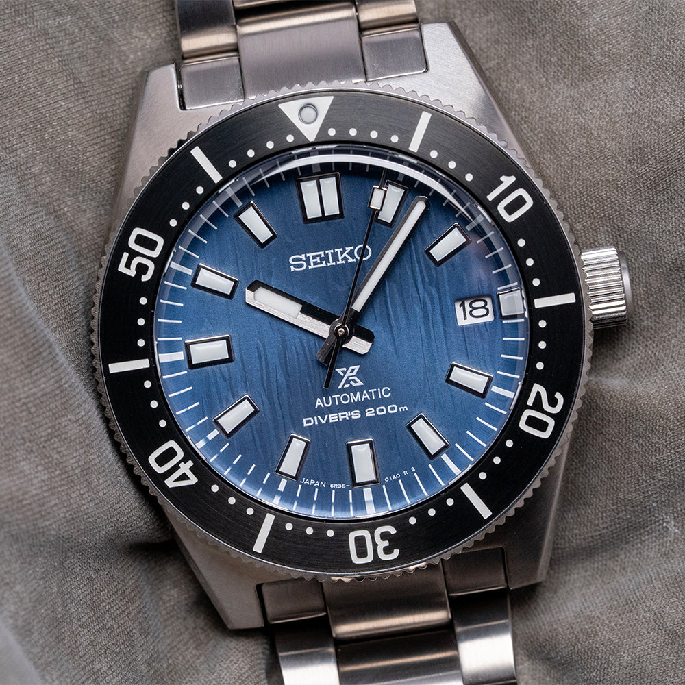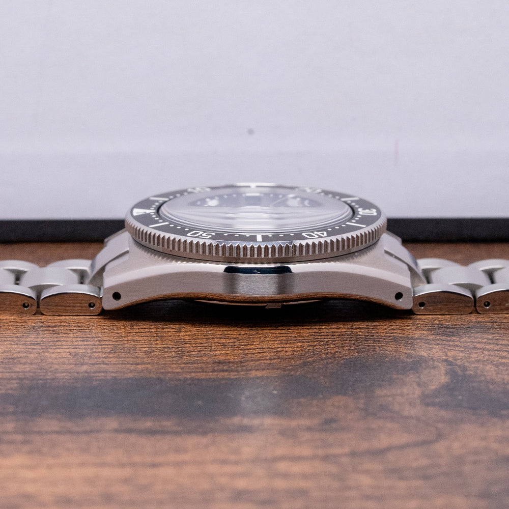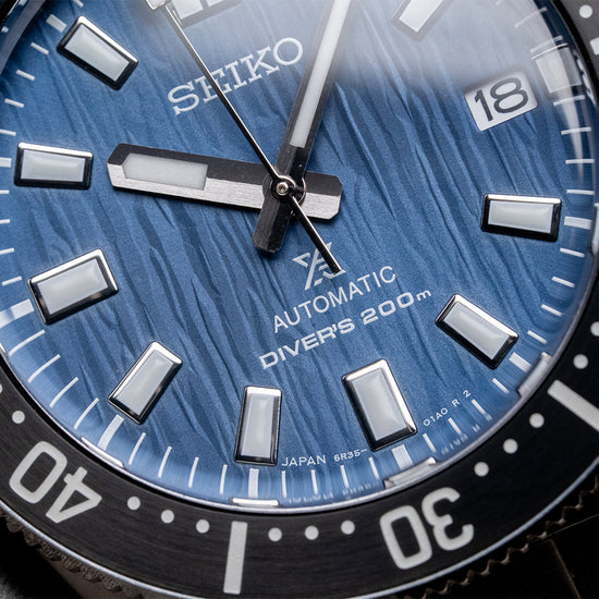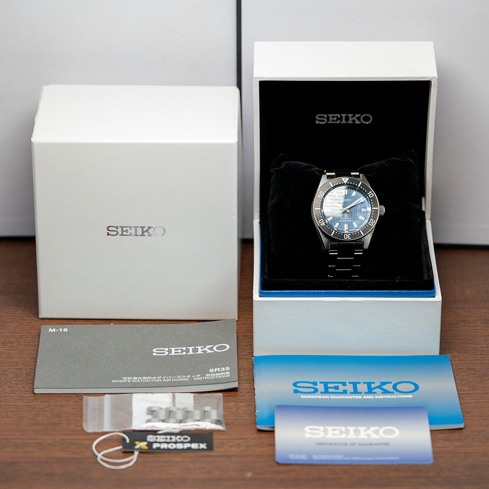Here we have a 2023 Seiko Glacier 'Save The Ocean' 1965 Re-Interpretation SPB297J1, as part of the Save the Ocean collection. Seiko donated part of the original sale to the PADI Aware Foundation’s Marine Debris programme, the world's largest Ocean clean-up scheme. With a 40.5mm stainless steel case that curves in all the right places, coated in DiaShield, a Seiko proprietary material that provides the watch with resilience against scratches and scuffs, the drilled lugs have a lug-to-lug length of 47.5mm and a thickness of 13mm, giving the watch an impressive wrist presence. Satin-brushed and polished shoulders transition with crisp lines. On the right side is a screw-down crown, and the unidirectional bezel features a striking 60-minute black insert coated in a hardened material. A flat sapphire crystal sits above the vertical, patterned blue dial, which is inspired by the glacier ice of Antarctica. An outer minute track with blue accents adds a pop of colour, and applied batons filled with LumiBrite mark the hours. At 3 o’clock, a framed date window. Broad sword hands with LumiBrite infill are complemented by a steel sweeping second hand. The text is precisely printed at 12 o'clock, “Seiko,” and at 6 o’clock, the Prospex logo and “Automatic Divers 200m” are printed underneath. On the reverse, a screw-down case back with the Seiko Tsunami in the centre, inside an automatic Seiko 6R35, 24 jewels, 21,600 beats per hour. It comes paired with its original 20mm Seiko 3-link brushed stainless steel bracelet secured by a signed three-fold flip-lock clasp, all links provided and comes with its Seiko presentation box, swing tag and papers.