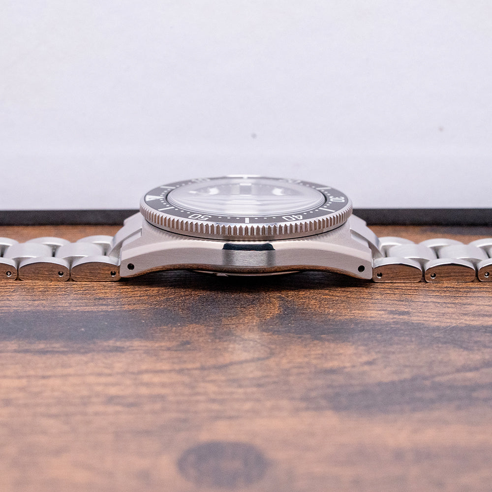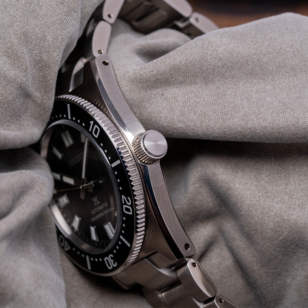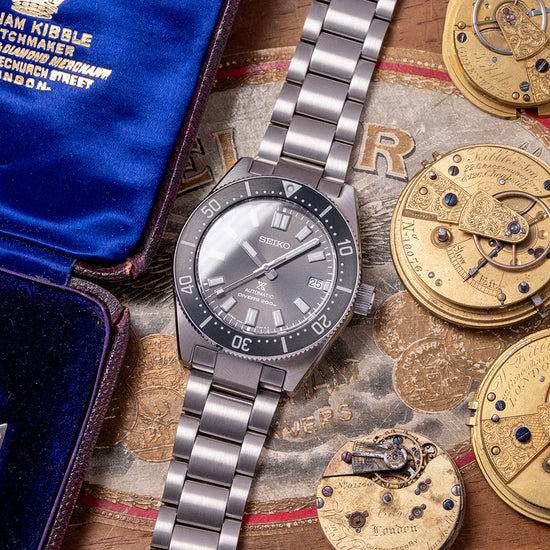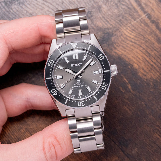 Here we have a 2023 Seiko Prospex "62MAS" Automatic Grey Dial SPB143J1, which is a modern reinterpretation of their very first dive watch, the 62MAS. The 40.5mm stainless steel case curves in all the right places and is coated in DiaShield, a Seiko proprietary material, which gives the watch resilience to scratches and scuffs; the drilled lugs have a lug-to-lug length of 47mm and a thickness of 14mm, giving the watch an impressive wrist presence. Satin brushed and polished shoulders transition with crisp lines, on the right side is a screw-down crown, and the unidirectional bezel has a striking 60-minute black insert coated in a hardened material. A flat sapphire crystal sits above the charcoal grey dial, an outer minute track with grey accents, and applied pillows of LumiBrite mark the hours. At 3 o’clock, a framed date window with broad sword hands and LumiBrite infill are complemented by a steel-sweeping second hand, and the text is precisely printed. On the reverse, a screw-down case back with the Seiko Tsunami in the centre, inside an automatic Seiko 6R35, 24 jewels, 21,600 beats per hour. The watch comes fitted on its original Seiko 20mm stainless steel bracelet with brushed surfaces, complete with a Seiko safety clasp; all links are provided, plus an additional 20mm leather strap and it comes with its Seiko presentation box and papers.