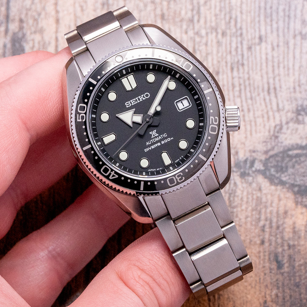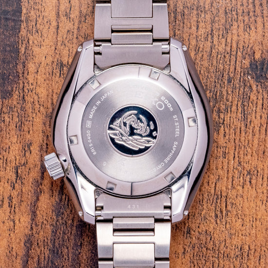 Here we have a 2023 Seiko Prospex "Baby Marinemaster" SPB077J1, a modern interpretation of Seiko's "Professional" dive watches from 1968. The 43.5mm stainless steel case is coated in Seiko’s Diashield, which is scratch-resistant. The case shape sits on the wrist like a cushion, and Seiko gets wrist ergonomics so right, and a lug-to-lug length of 49.5mm and a thickness of 12.5mm give the watch an impressive wrist presence. Chamfered polished edges lead the eye towards the broad drilled lugs. On the right side, at 4 o’clock, a screw-down crown. The unidirectional bezel has a black insert with a 60-minute scale in silver numbers. A domed sapphire crystal AR coated on the inside sits above a matte black dial, an outer minute chapter ring with applied disc and obelisk indexes outlined in stainless steel coated in LumiBrite marks the hours. At 3 o’clock, a framed date window. Broad sword and arrow hands are coated in LumiBrite, complemented by a lume-tipped sweeping seconds hand. On the reverse, an embossed Seiko Tsunami is in the centre, inside an automatic 6R15, 23 jewels, 21,600 beats per hour; the movement has hand winding and hacking functionality for your convenience. The watch comes fitted on a Seiko stainless steel bracelet with a signed three-fold clasp and a dive extension; all links are provided, and it comes with its Seiko presentation box and card.