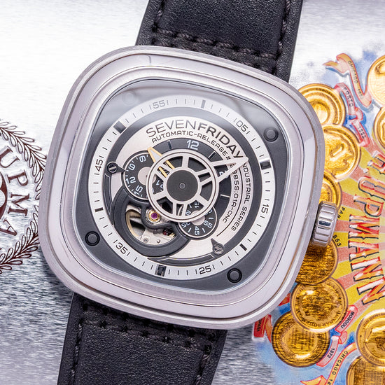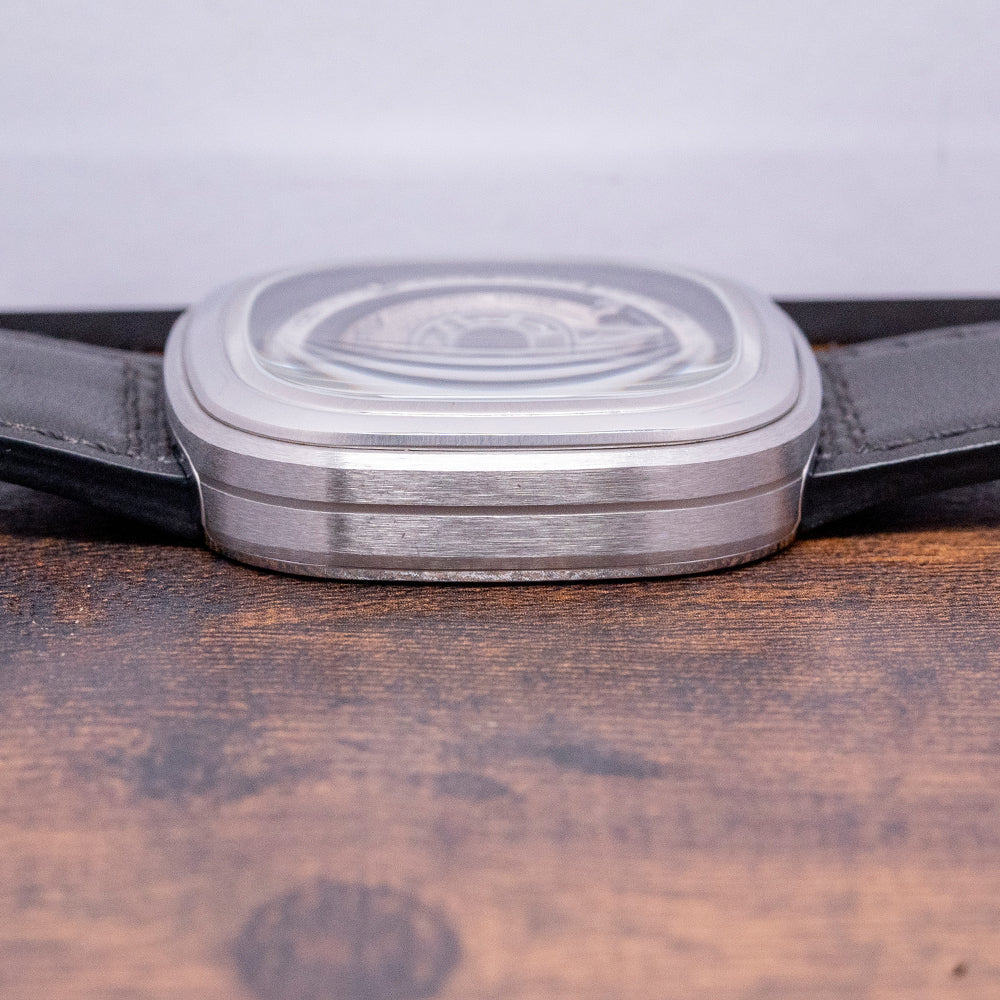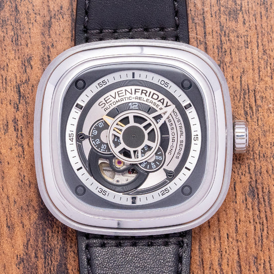 Here we have a 2023 SevenFriday P1B/01 Automatic, an interesting watch that starts with the 47mm sandblasted and polished stainless steel case resembling a 60’s TV screen and is inspired by the industrial cogwheel. A lug-to-lug length of 46.5mm and a case thickness of 12mm ensures a comfortable cushion fit on your wrist. On the right side is a signed crown with deep knurling for grip. A polished sandblasted stepped bezel holds a Sapphire crystal above a dynamic hard-brushed stainless steel dial made up of 6 separate layers of matte, brushed finishing and Rhodium and black discs. The dial is made up of a minute track, a rhodium-plated hour hand and an orange minute hand, with a 60-second rotating disc and a 12-hour rotating disc complete with a handy screwed-in pointer. The details of the watch and the SevenFriday motif are printed in contrasting black; the various elements bring together an attractive multi-dimensional dynamic dial. On the back, we have a screwed-in case back with specifications and SevenFriday engraved, inside an automatic Miyota 8257, 21 jewels, 21600 beats per hour, the dial has a skeletonised open balance at the 7 o’clock position. It is paired with three 24mm SevenFriday straps. This watch is sold with its original SevenFriday box, spring bars, and its SevenFriday unsigned paperwork.